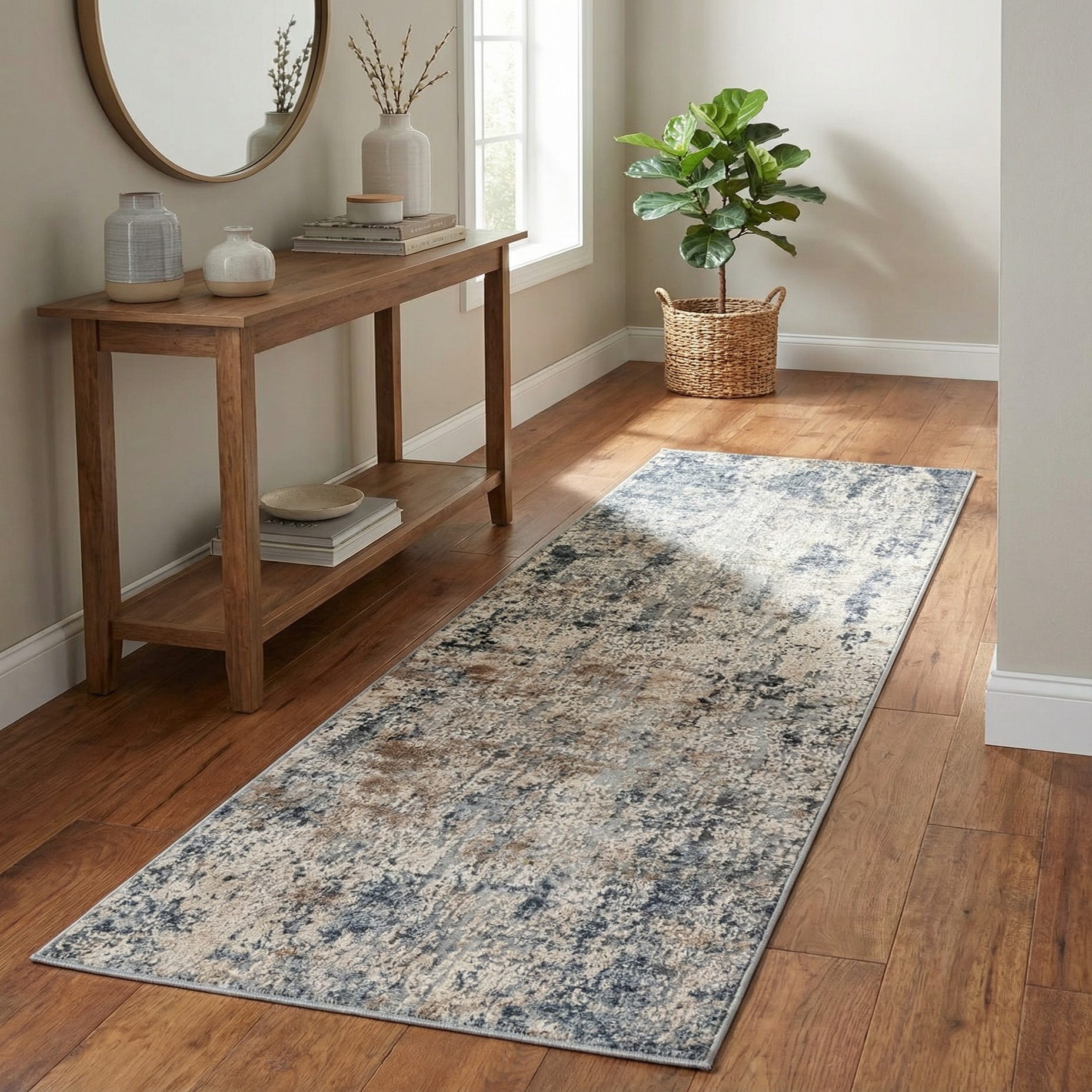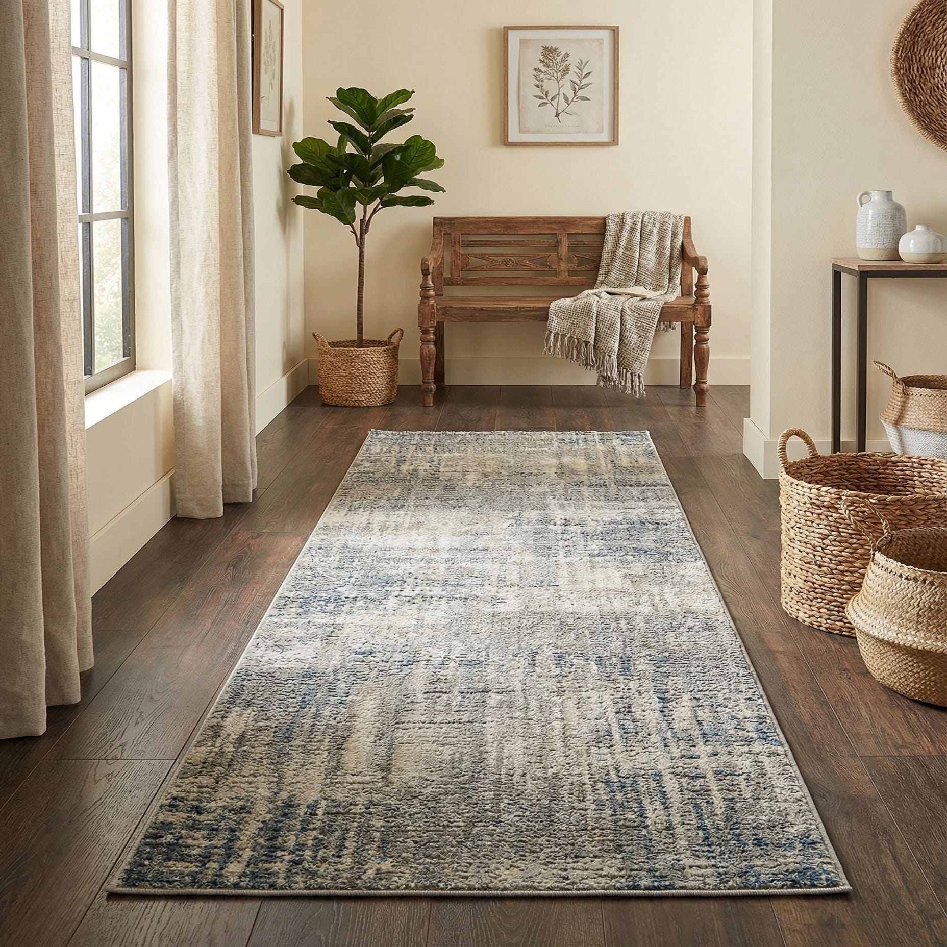 A soft, painterly abstraction unfolds across a cream background, with layered strokes of navy blue, gray and ivory that form an organic, lived-in pattern. The design avoids strict repeats or borders, giving the runner a relaxed, contemporary look that still reads structured. Machine-made from 60% polypropylene and 40% polyester, the surface has a textured, slightly plush hand—noticeable underfoot—with subtle height variation that adds visual depth and a comforting tactile quality.