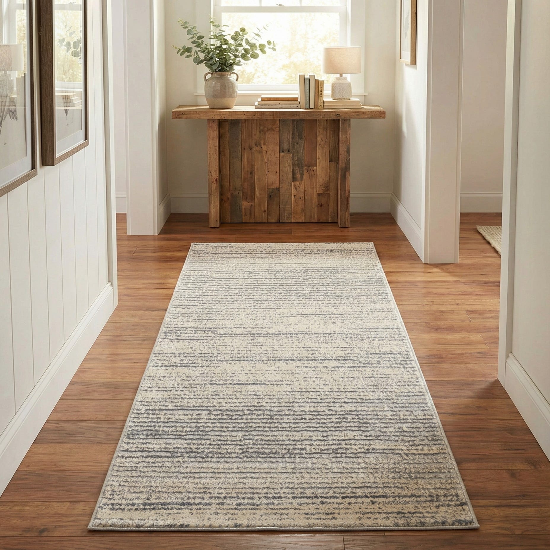 A cream field provides a neutral foundation for a subtle, linear motif of gray and ivory striations that run across the length of the runner. The abstract, horizontal pattern has a slightly weathered look that adds visual depth without dominating a space. Machine-made from 65% polypropylene and 35% polyester, the pile offers a soft, tactile feel with a low to medium height that’s comfortable underfoot and shows gentle dimensional variation where the colors intersect.