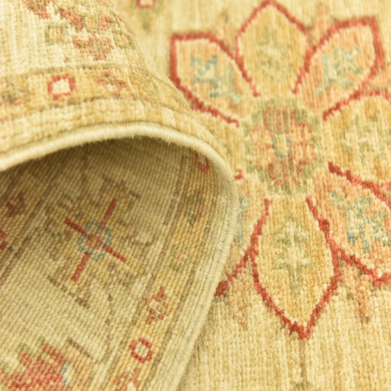 This Peshawar Ziegler runner, a hand-knotted masterpiece of 100% hand-spun wool, features a traditional design with a harmonious blend of colors. The cream background sets a serene stage for the intricate botanical patterns that unfurl in hues of beige, blue, brown, gold, red, and olive. The central medallion motif is accented by repeating geometric and floral elements, creating a balanced aesthetic that is both classic and versatile.