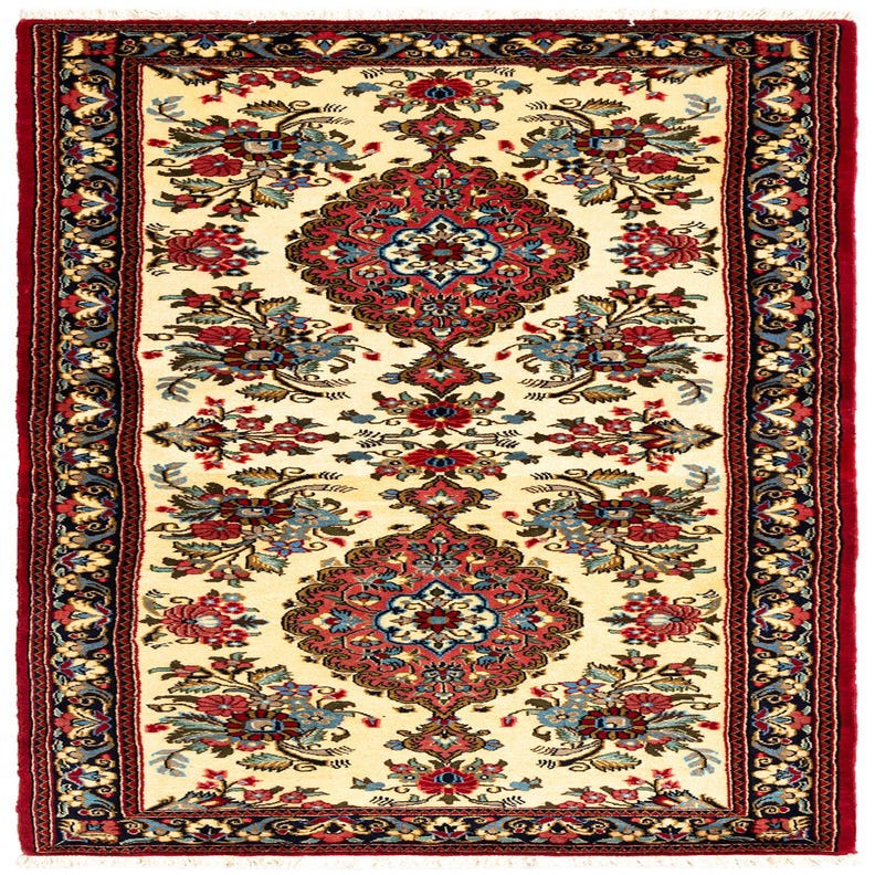A 6 ft ivory runner rug with a traditional Persian floral pattern in red, blue, and black, featuring a dark border.