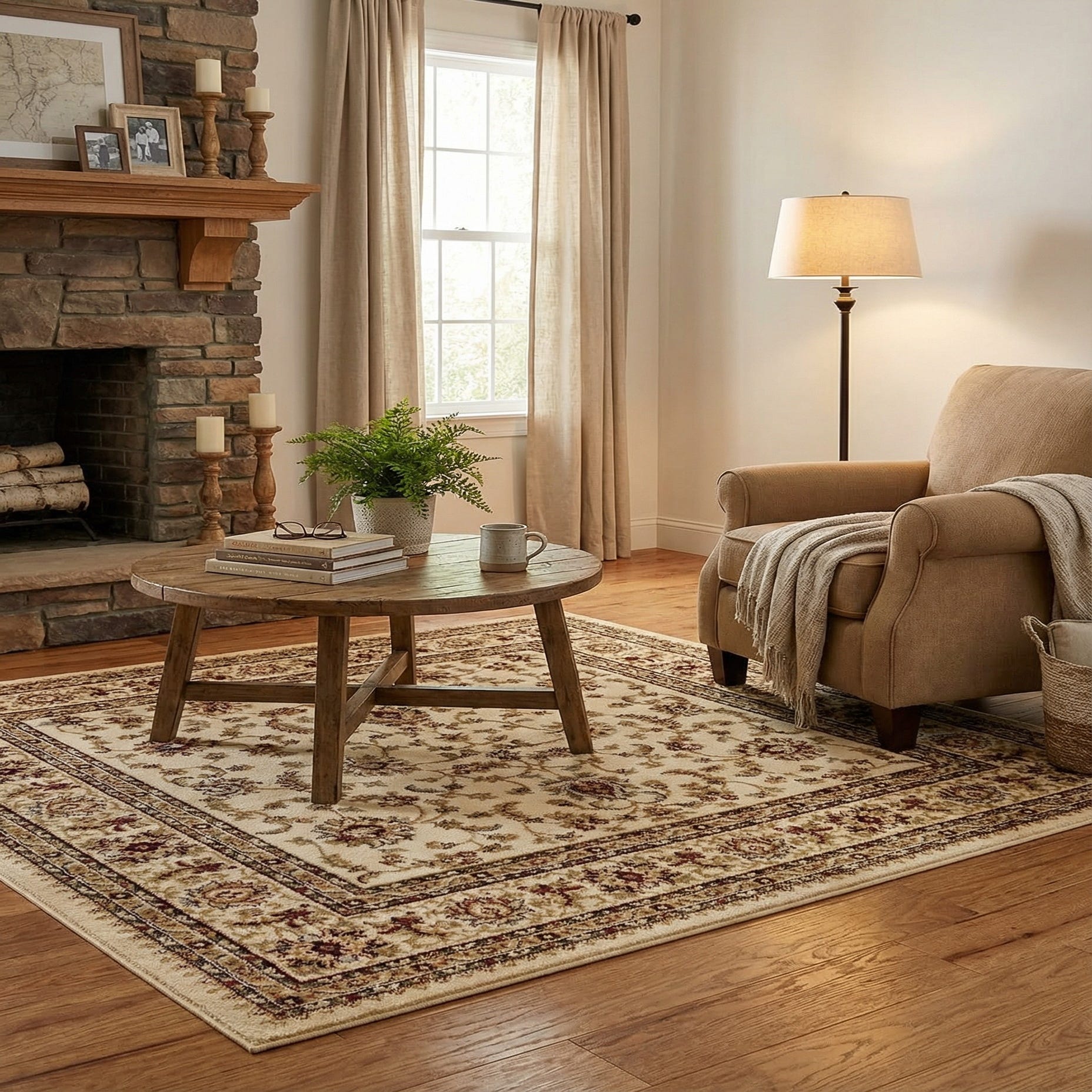 Machine-made from 100% polypropylene, the rug has a low-profile, tightly woven pile that feels smooth and gently cushioned underhand. It works especially well under a living room sofa and coffee table for a grounded, traditional arrangement, or beneath a dining table where the pattern can define the space. For transitional interiors that blend modern furnishings with vintage-inspired details, the rug’s palette pairs nicely with warm woods, leather seating, muted blues and green accents, or rust-colored textiles.