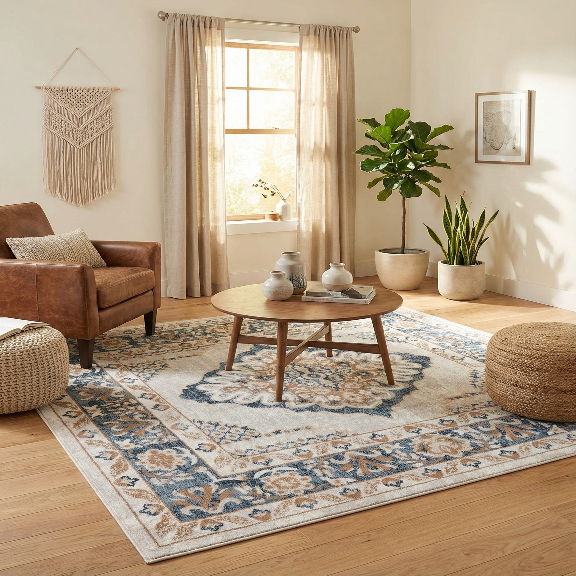 A traditional medallion layout anchors this rug, with a scalloped central motif and layered floral borders that create a balanced, formal look. The cream ground provides a soft, neutral backdrop while bands of blue and ivory define the medallion and scrolling patterns; a gently distressed finish mutes contrast for a lived-in, relaxed character. The overall effect is classic without feeling heavy, with the pattern and colorways working together to add quiet structure to a room.
