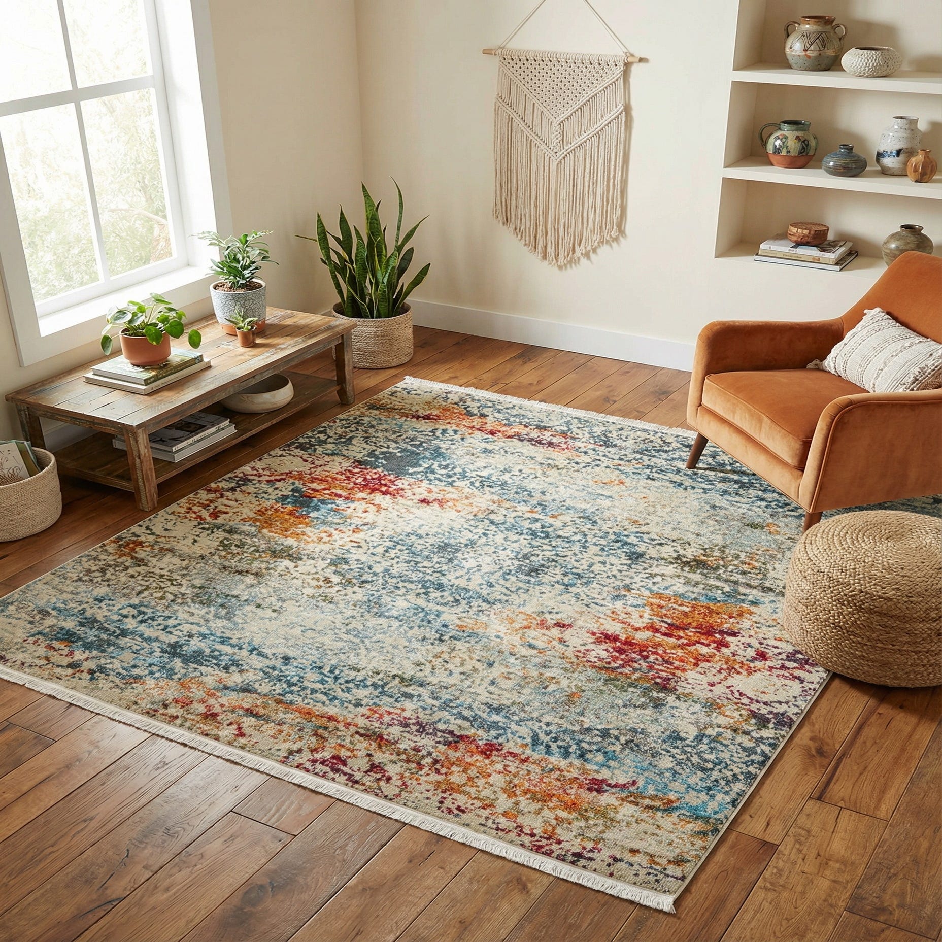 Well-suited to contemporary and transitional interiors, this rug brings color and texture to a neutral seating area or adds a relaxed, artistic touch to a mid-century or eclectic scheme. Pair it with warm wood furniture to emphasize the gold and orange notes, use it to anchor a cozy home office, or layer it under a coffee table in a living room where the blue and gray tones complement other textiles.