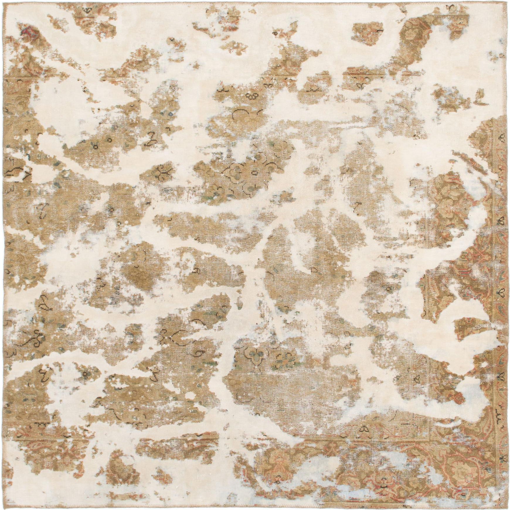 A 6'x6'9 square ivory and beige distressed Persian rug with an abstract, vintage pattern, suitable for indoor spaces.