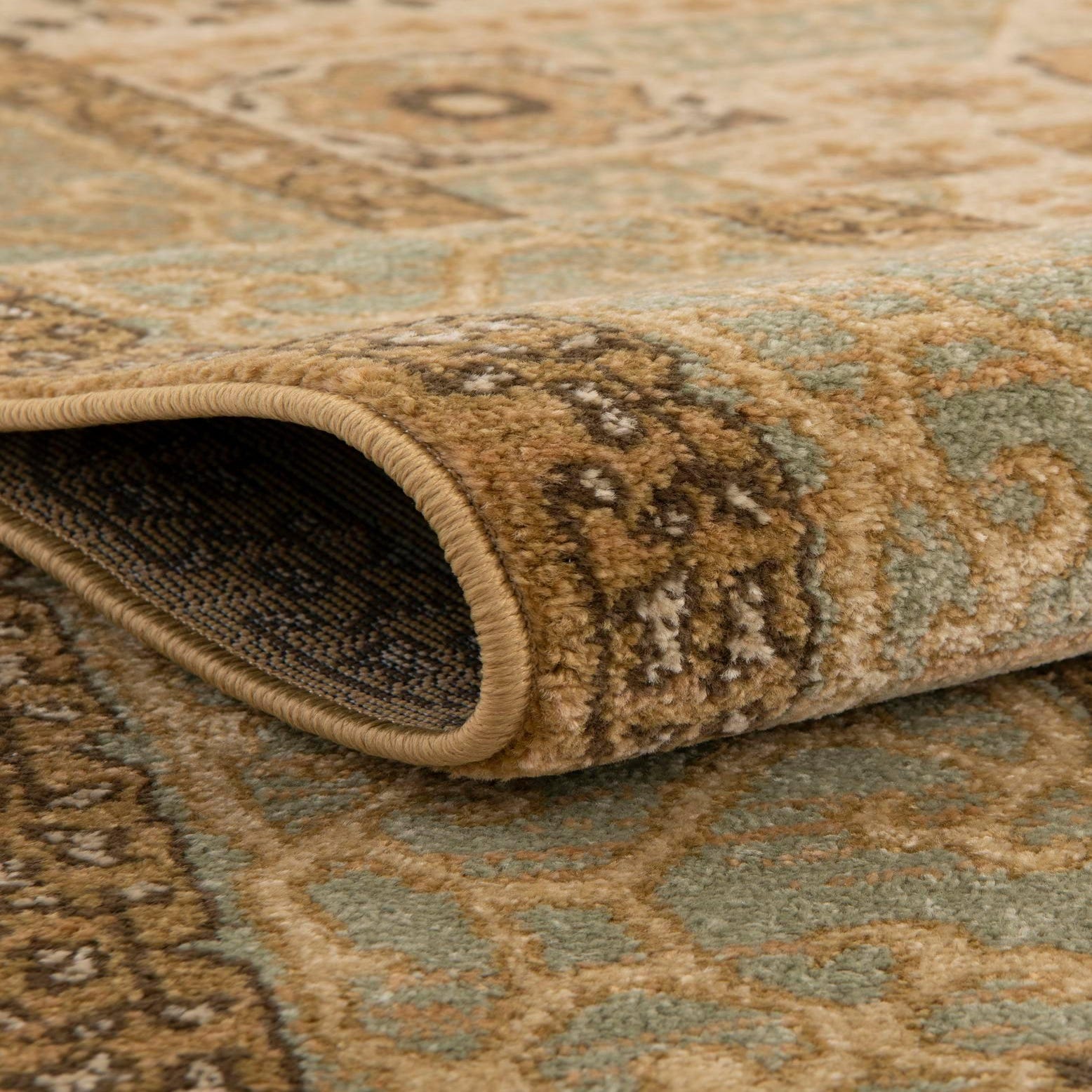 A classic medallion layout gives this rug a timeless, traditional character, with a central starburst motif surrounded by intricate floral and geometric panels. The background is cream, while a soft palette of light brown, tan, beige and brown defines the ornamentation, and accents of light green and olive lend a muted, antiqued feel. The border’s looping vine and palmette designs frame the field with quiet sophistication, offering a refined pattern that reads both formal and relaxed.