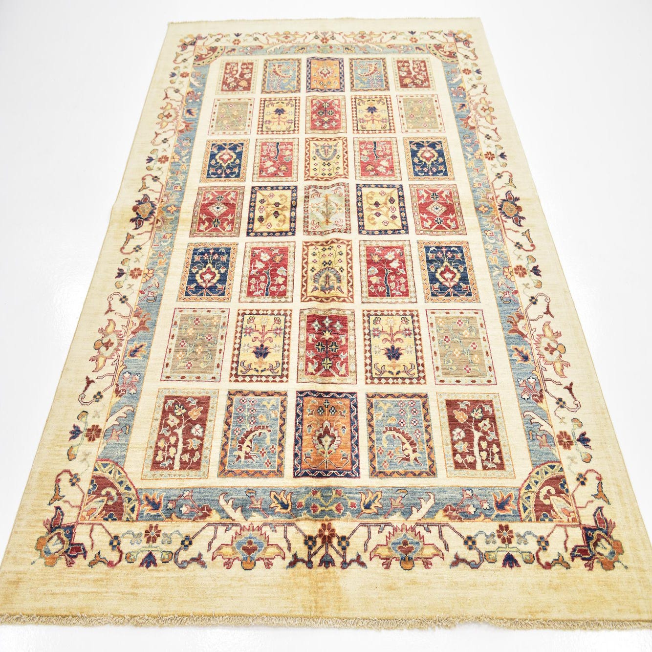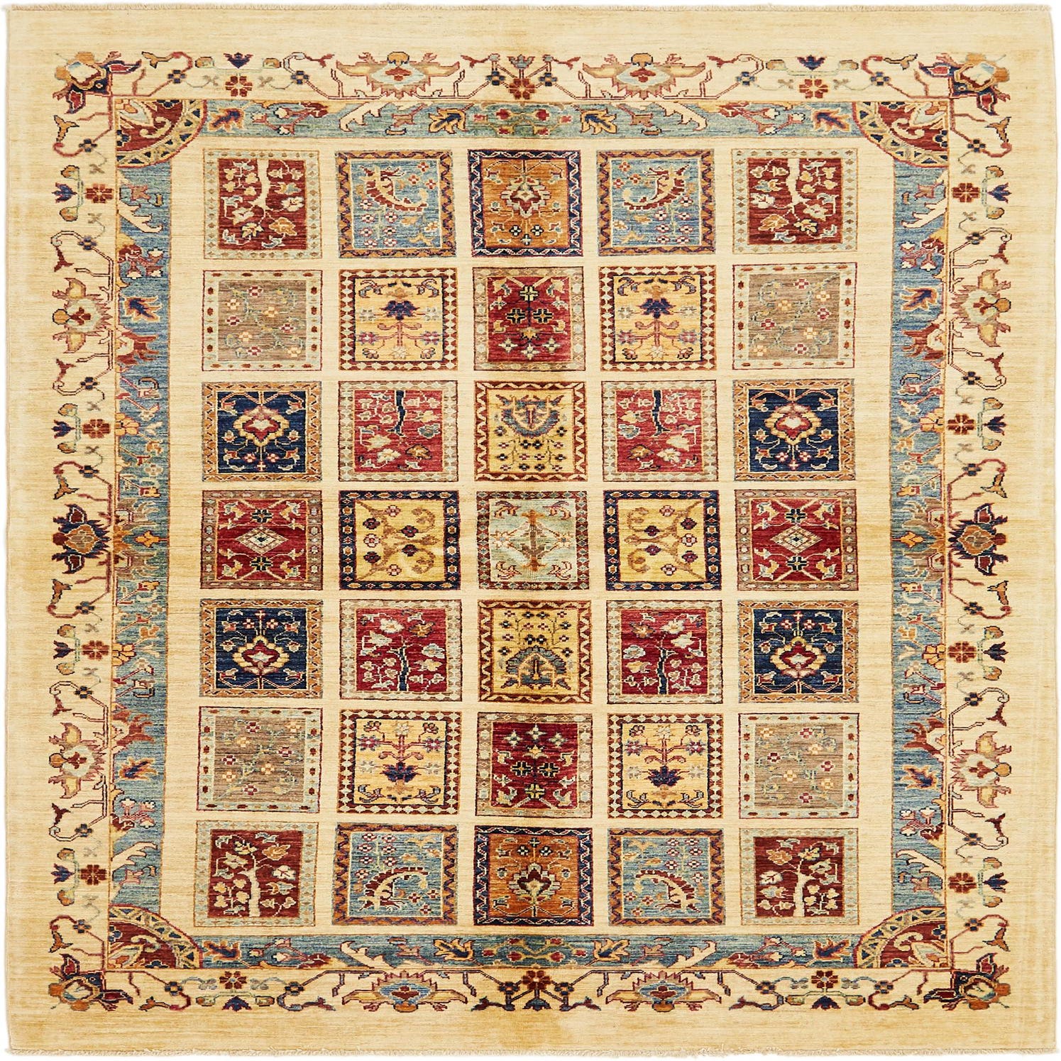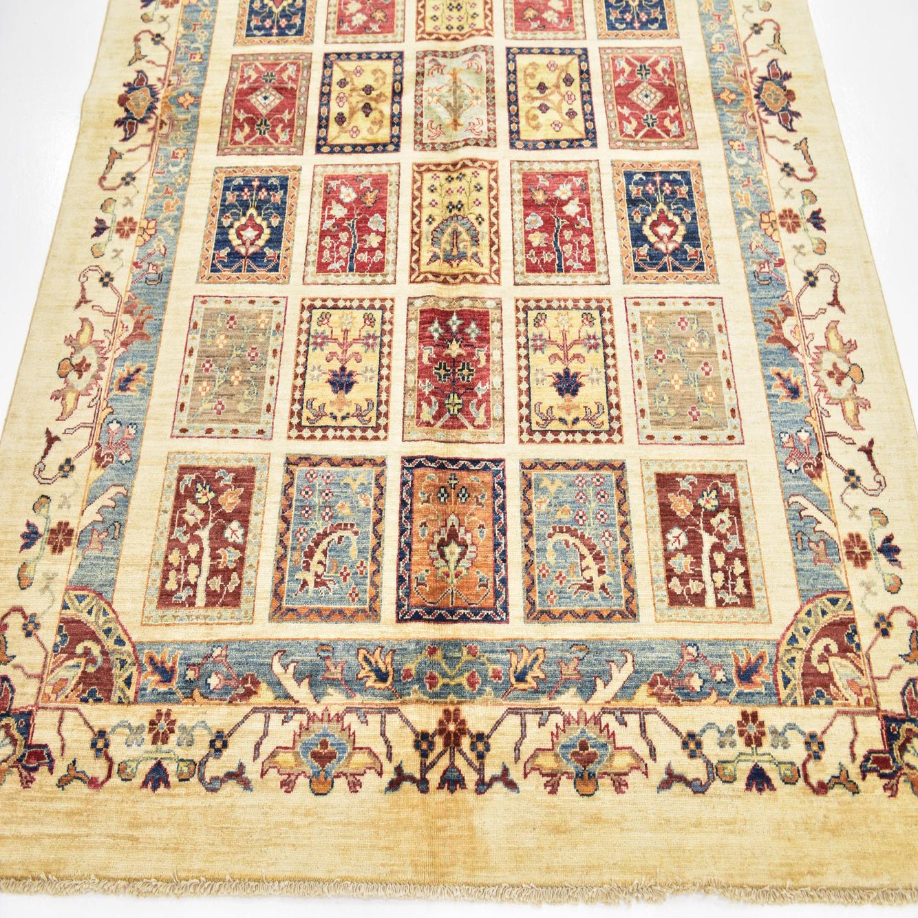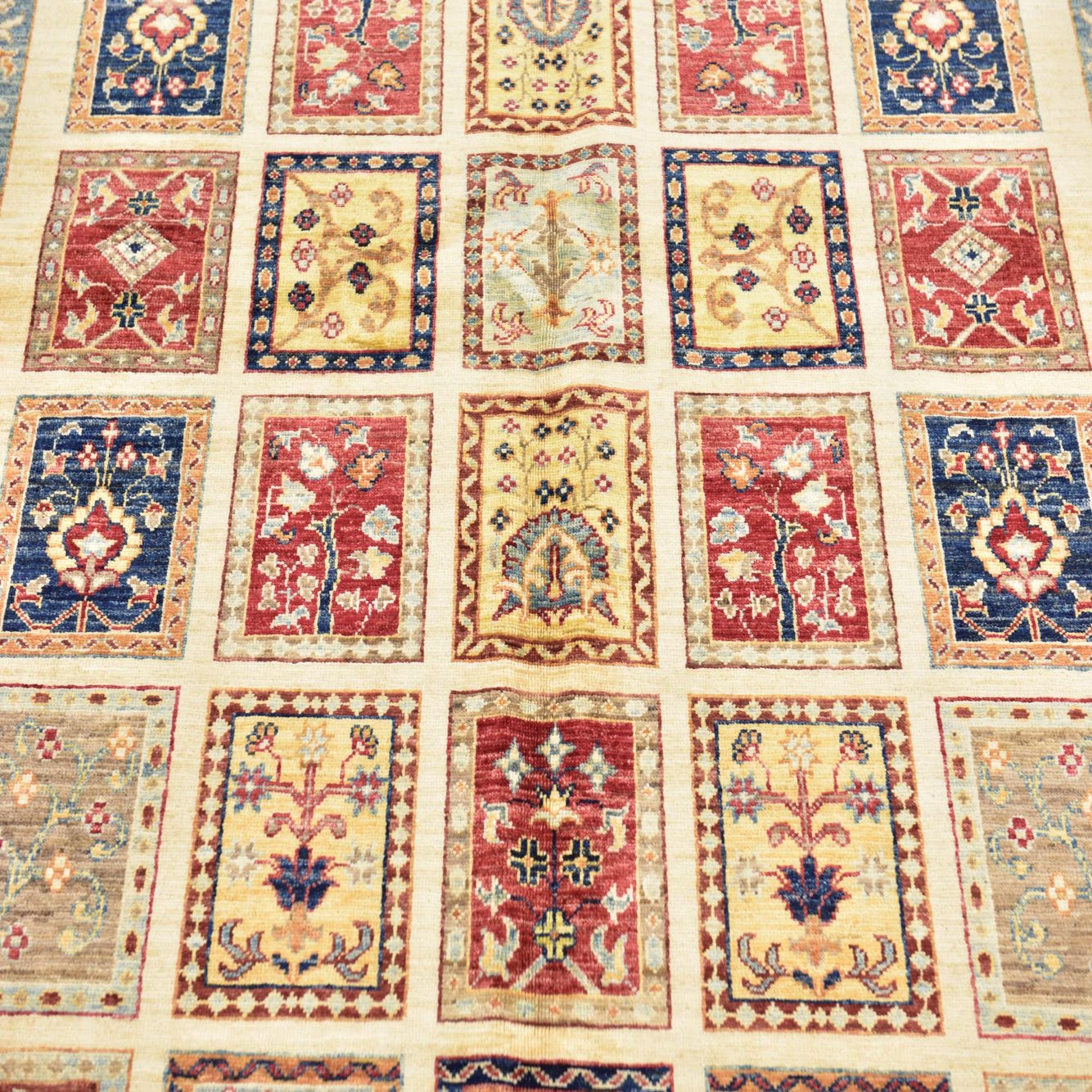 A 6x9 rectangular Ariana Ziegler wool rug in ivory with a traditional botanical pattern and a grid of colorful squares.