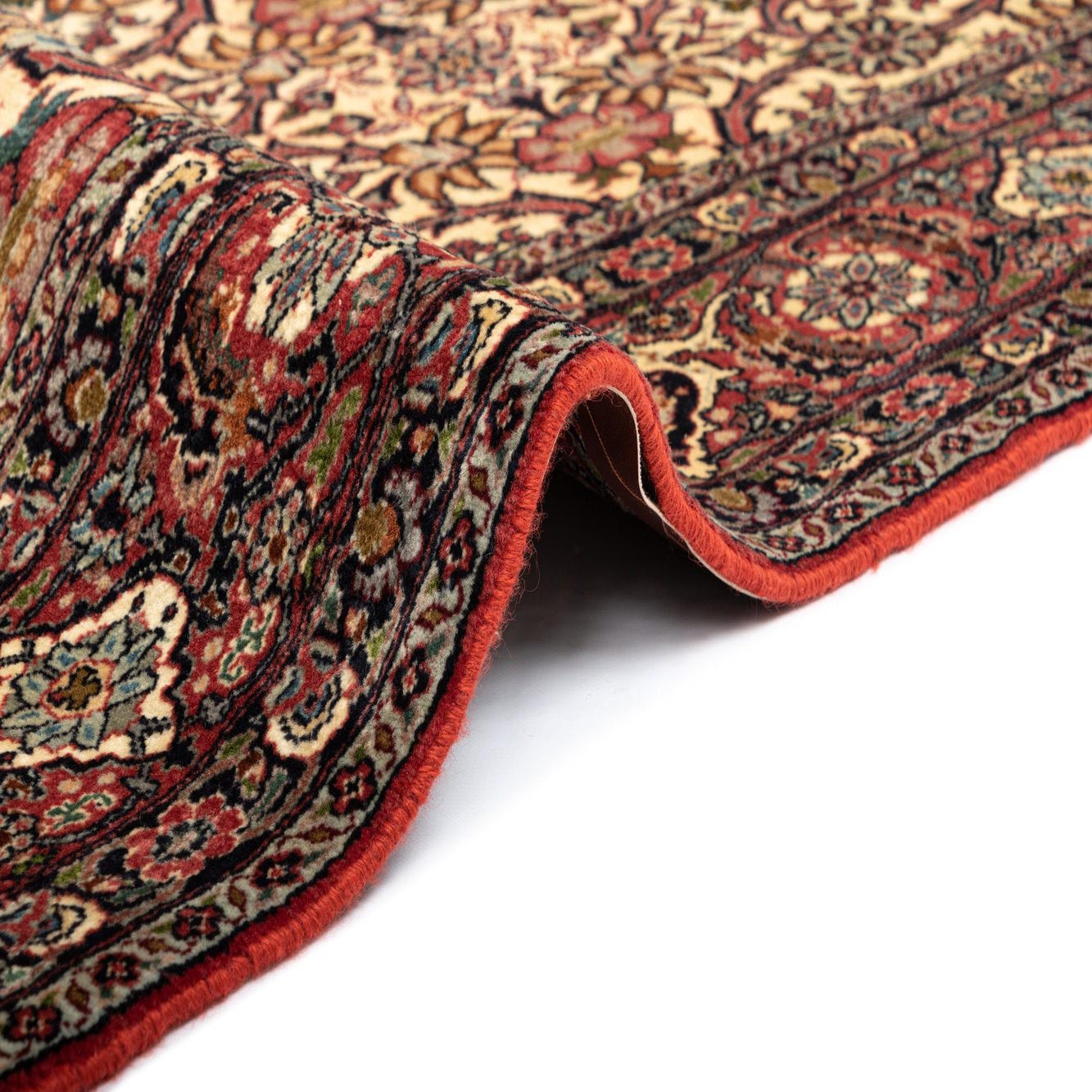 A 6x9 rectangular Bidjar Persian rug with an ivory field and intricate floral patterns in red, blue, and gold.