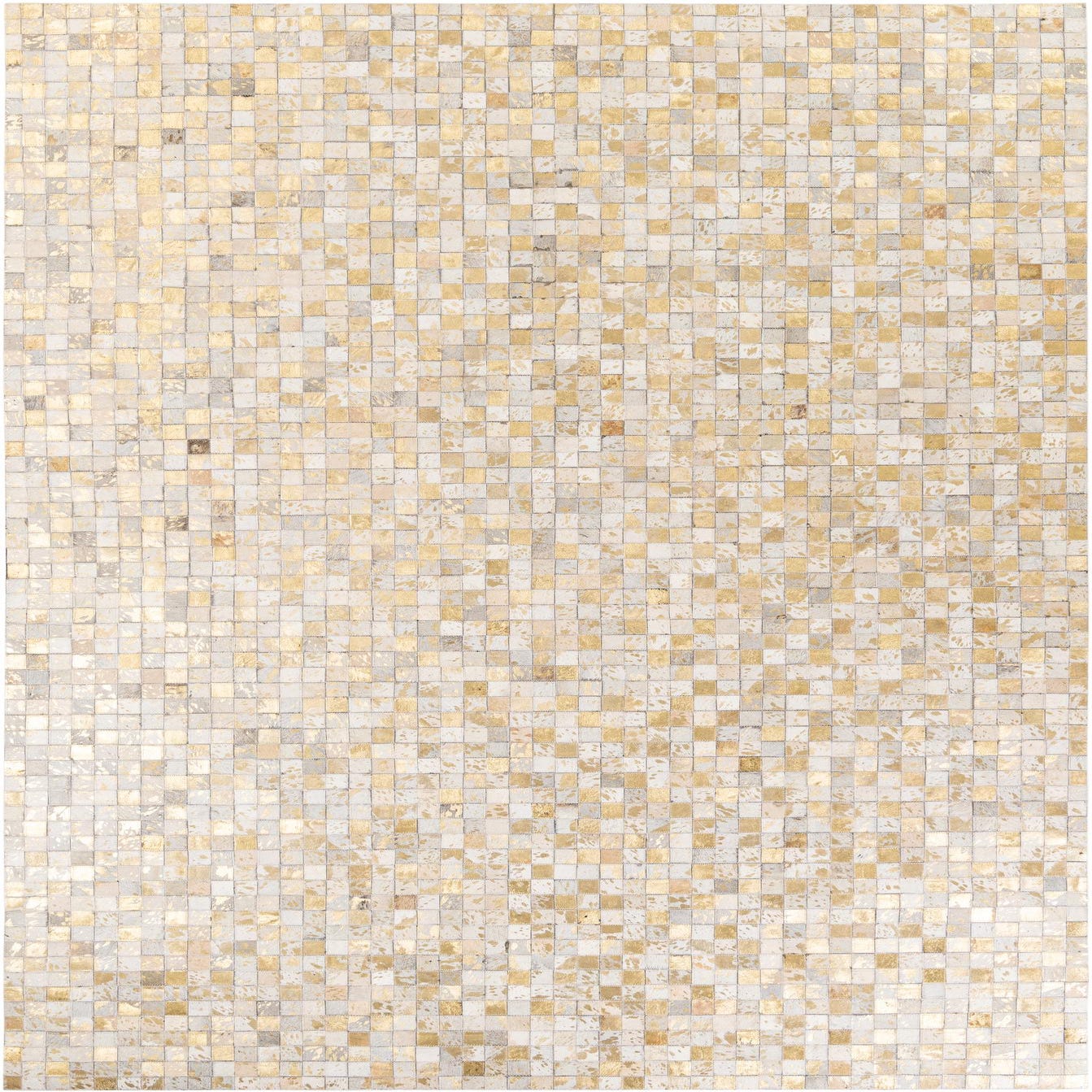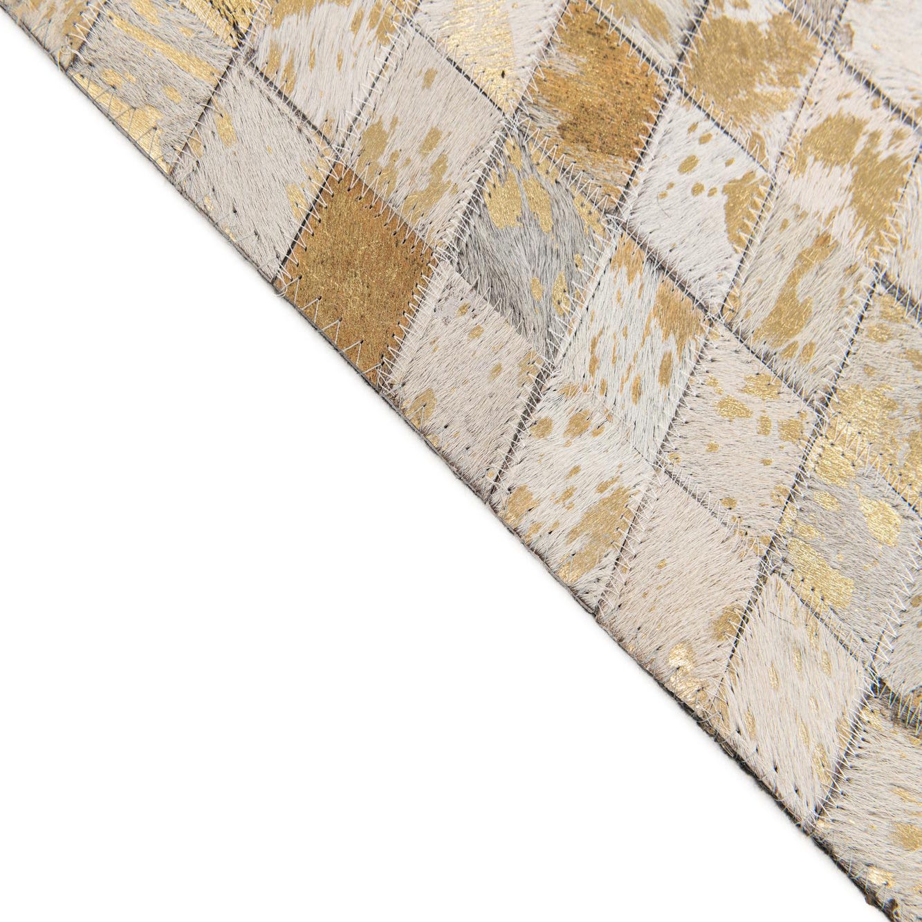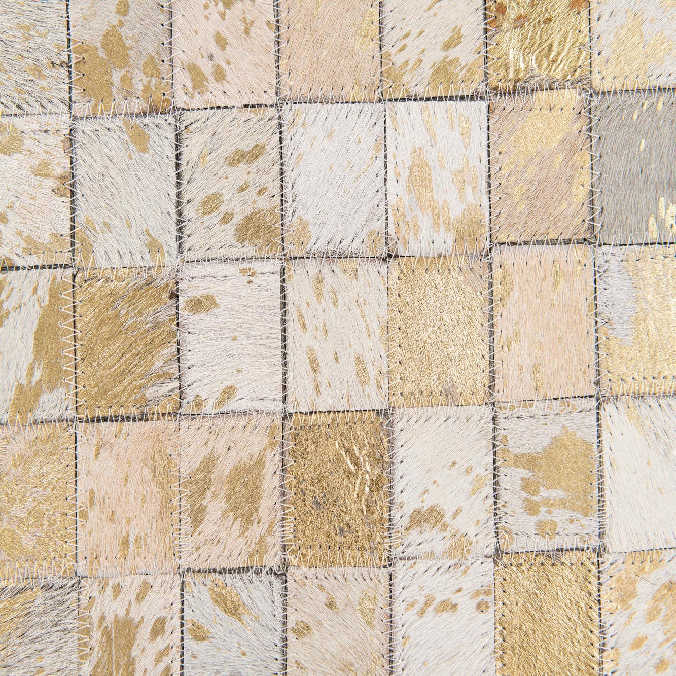 Handmade from cowhide and leather, this rug arranges small square patches into a refined mosaic on a cream background. The palette blends cream, beige, ivory and touches of gold, with each tile showing natural variation in tone and grain that creates a subtle, tactile surface. The hair-on-hide texture feels soft yet structured underfoot, while the gold accents provide a gentle metallic sheen that catches light and adds depth to the overall calm, neutral composition.