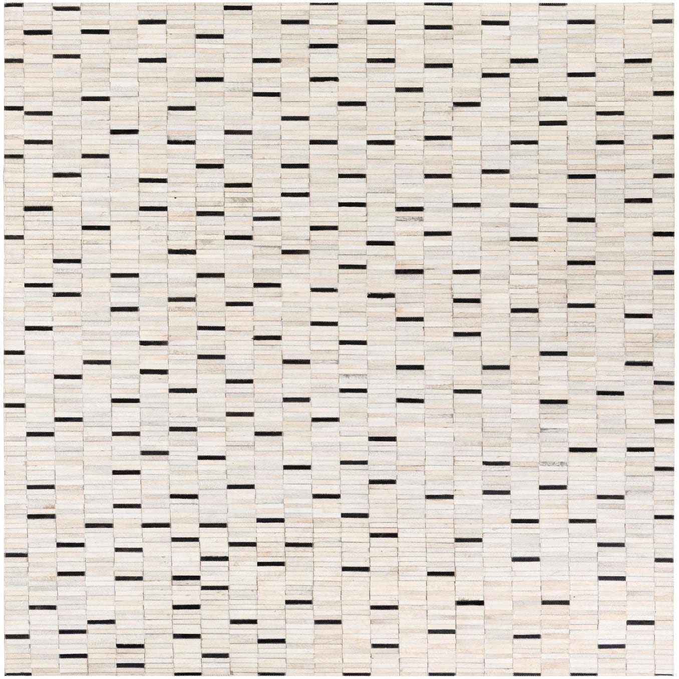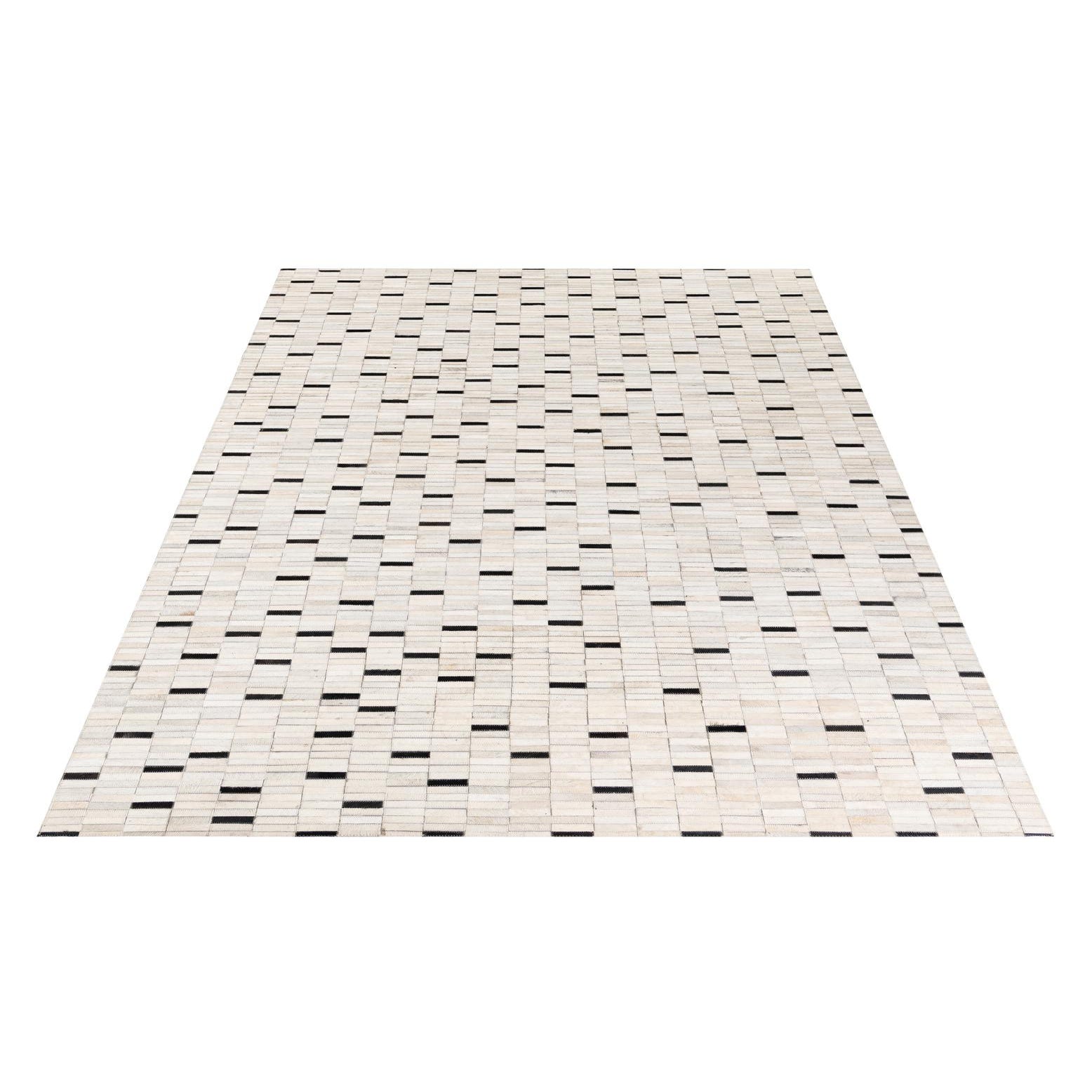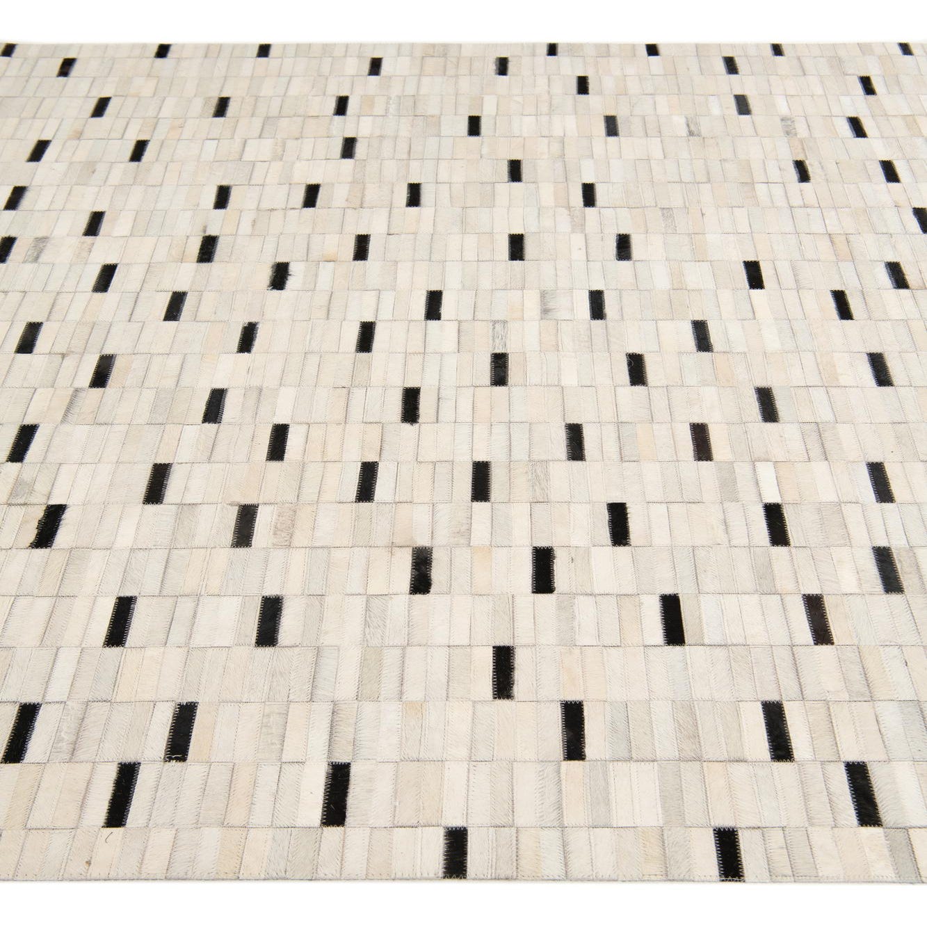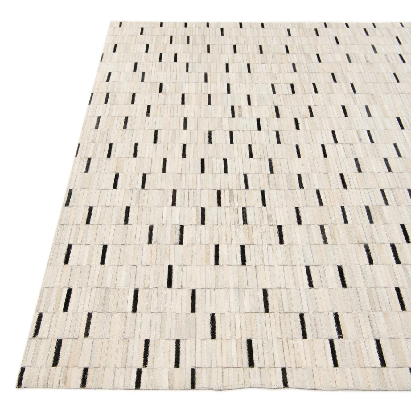 A 6x9 rectangular ivory modern cowhide rug with a repeating pattern of small black horizontal dashes.