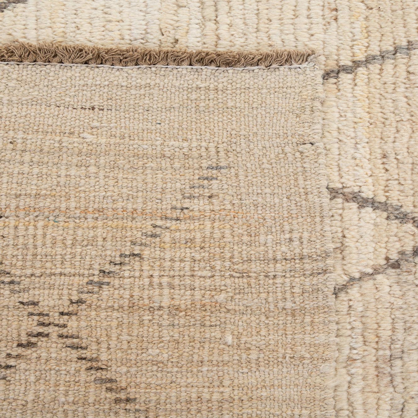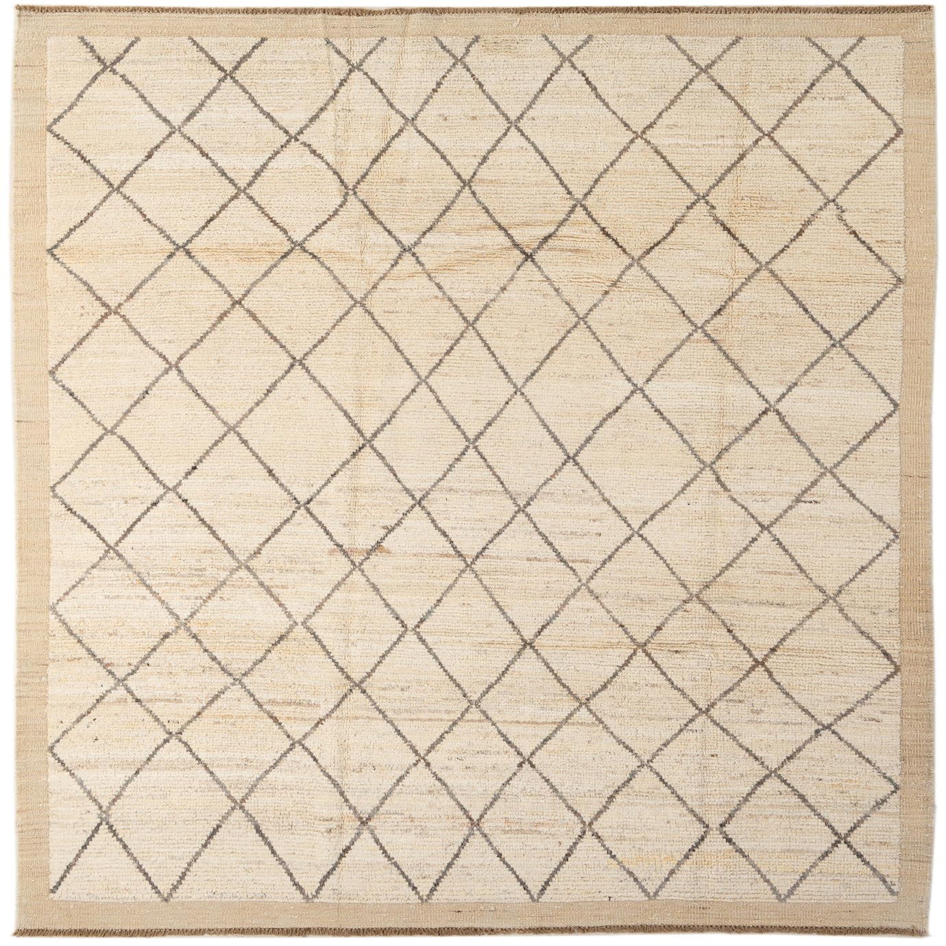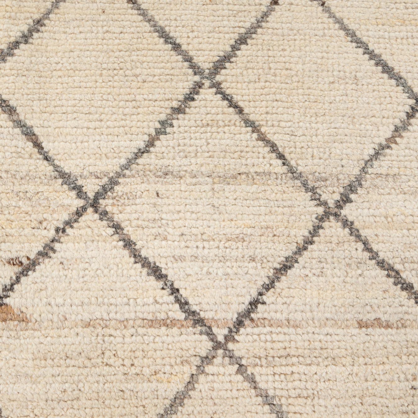 A 6x9 rectangular ivory wool rug with a modern diamond pattern in gray, featuring a subtle border.