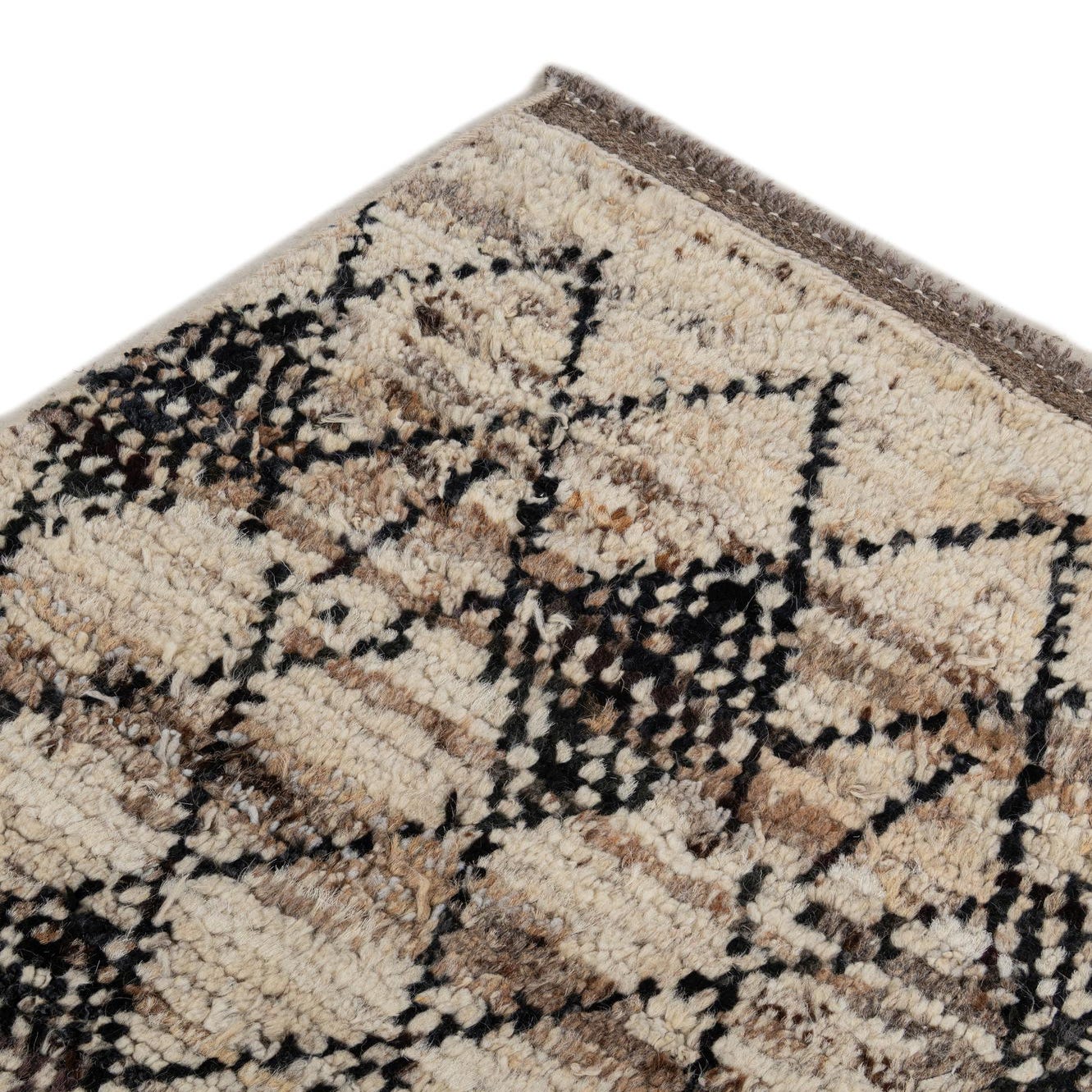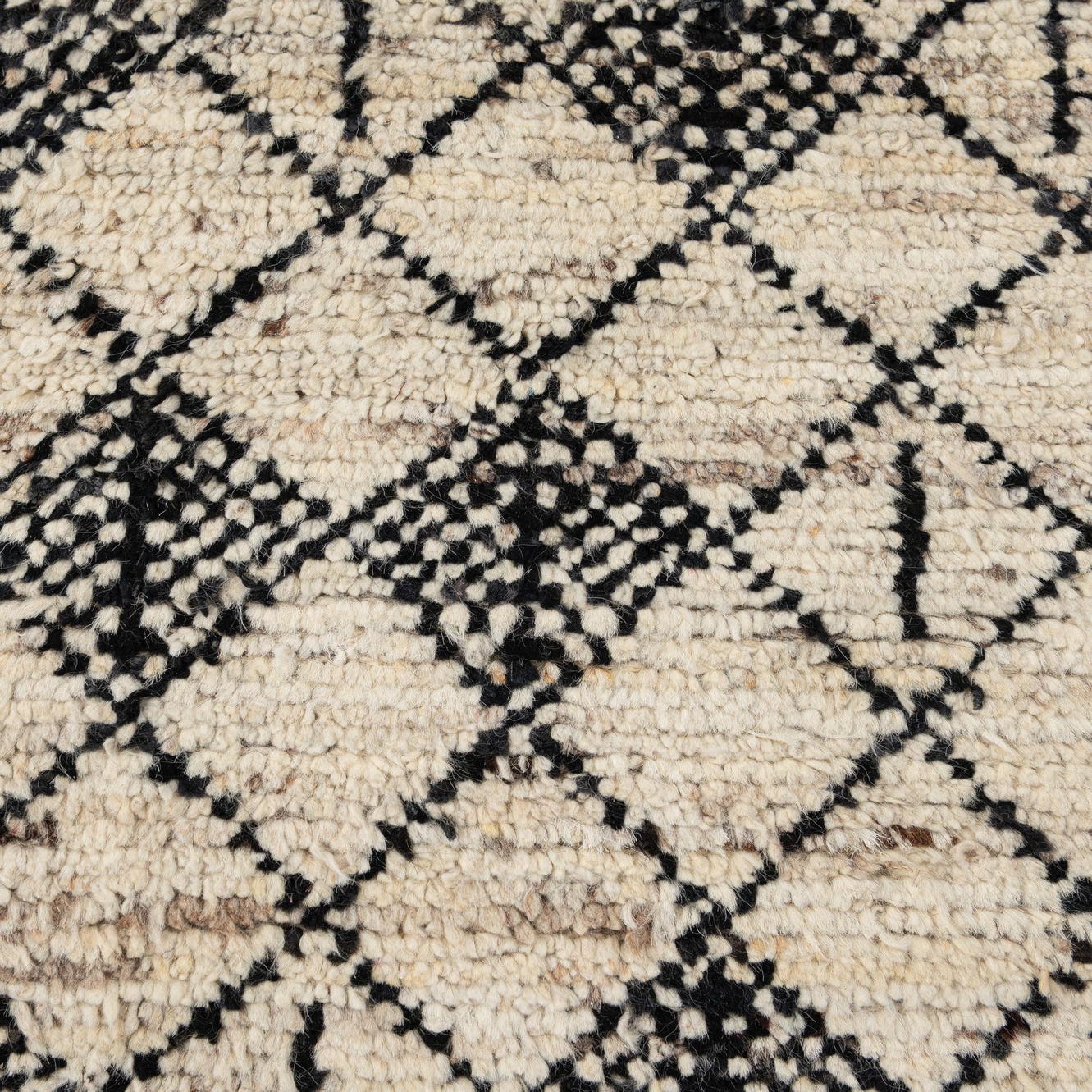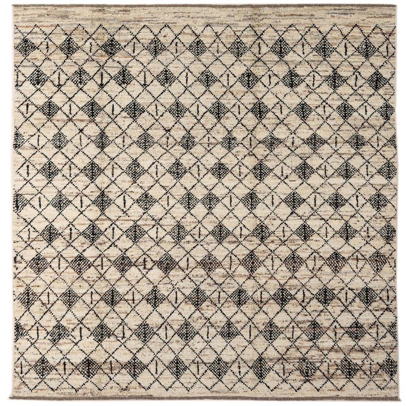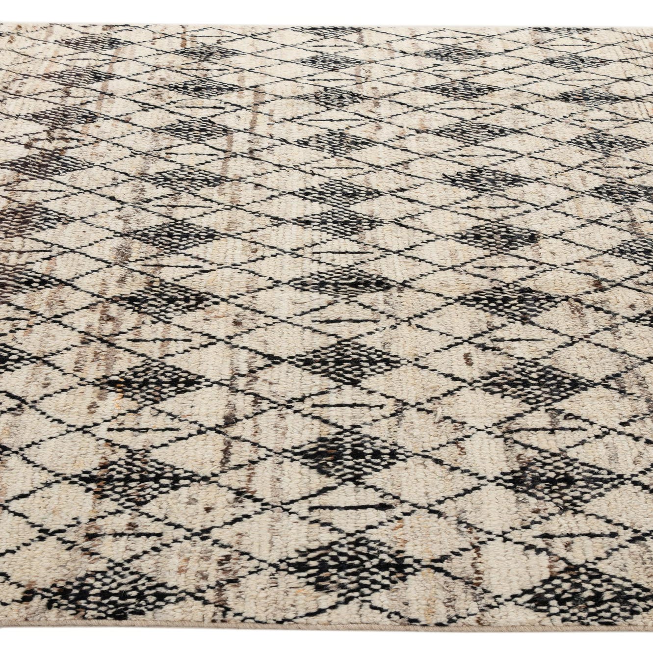 A 6x9 rectangular ivory wool rug with a modern diamond pattern in black and brown, suitable for a living room.
