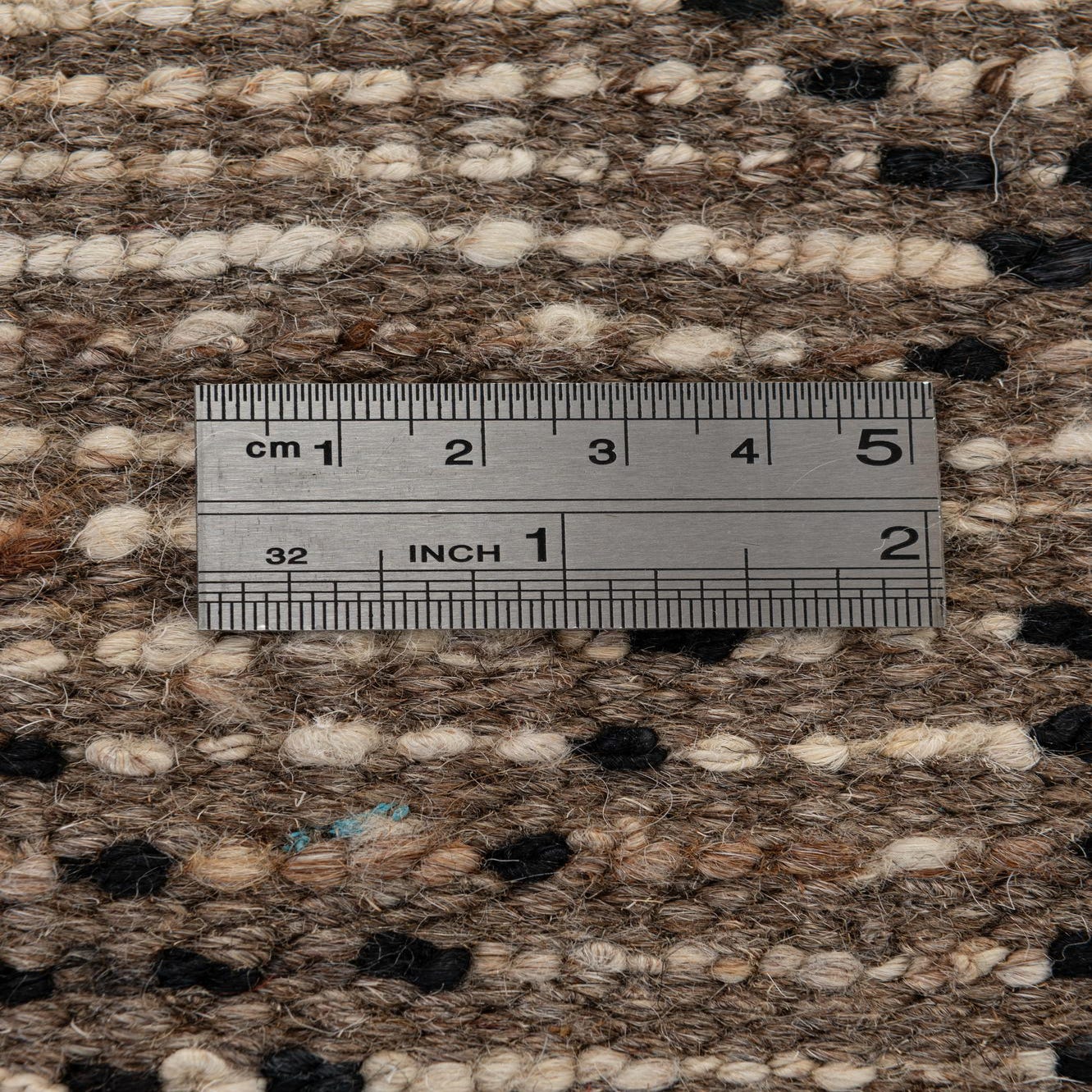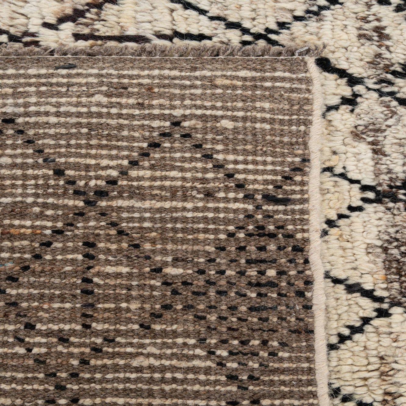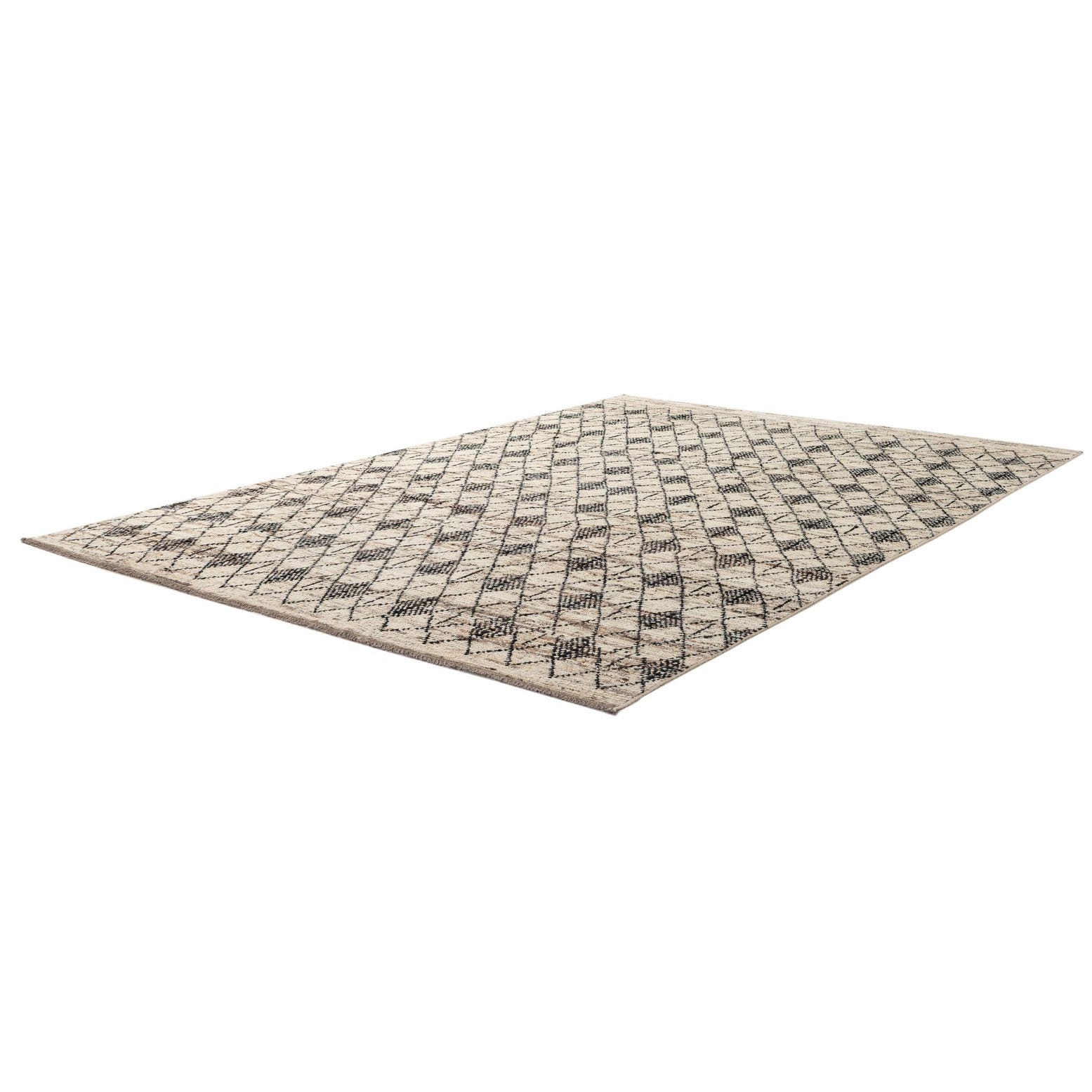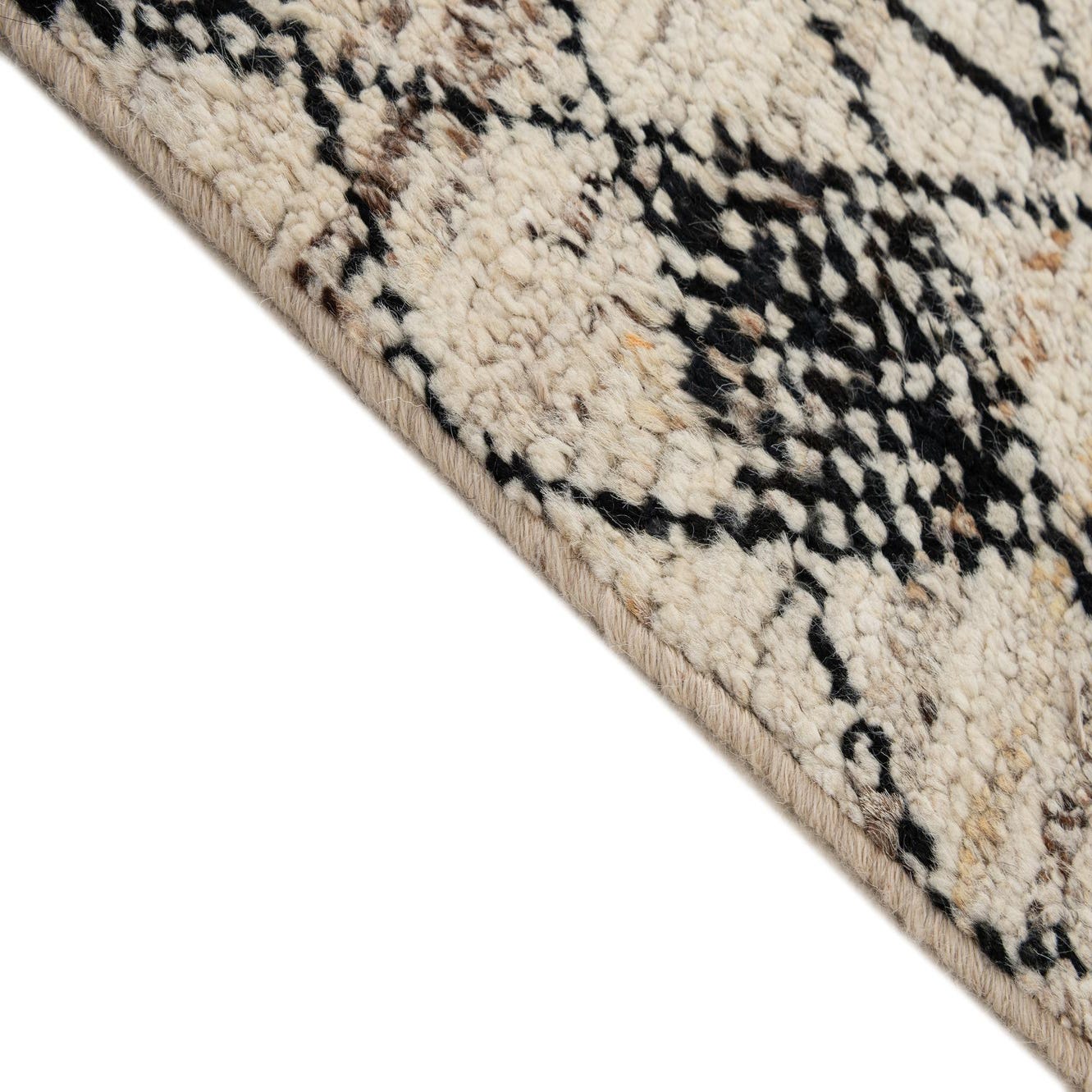 A 6x9 rectangular ivory wool rug with a modern diamond pattern in black and brown, suitable for a living room.