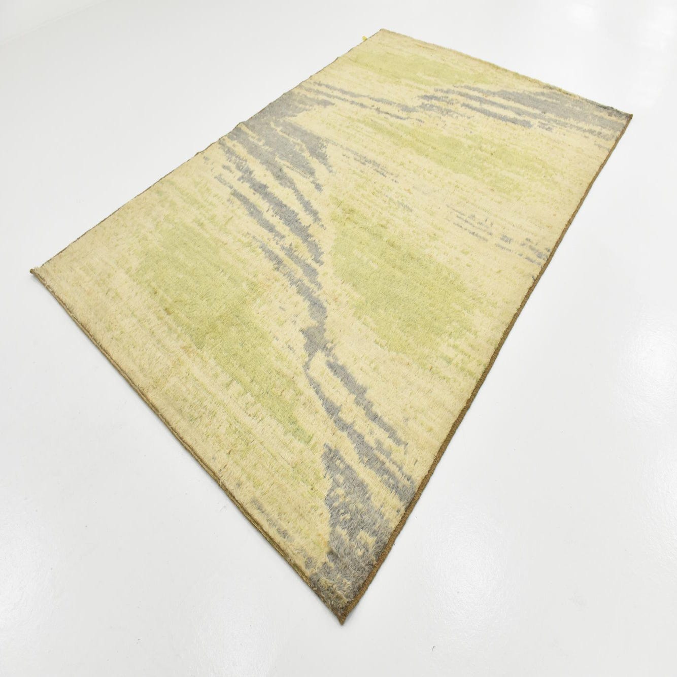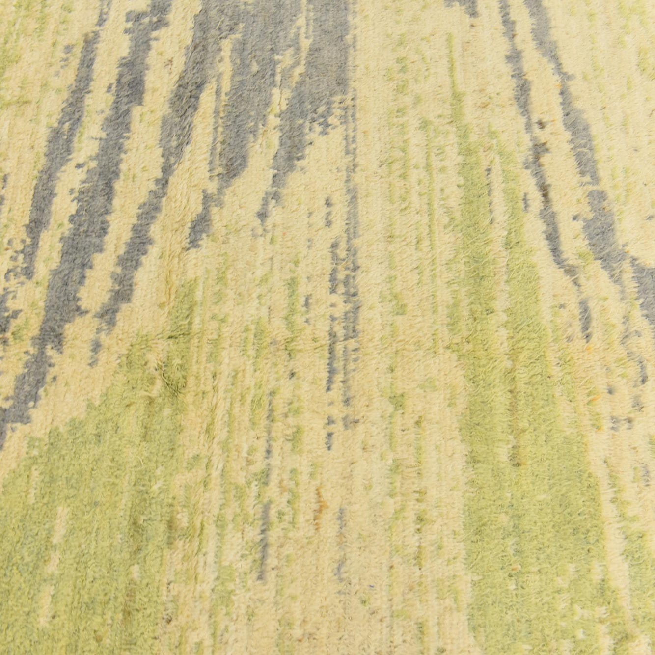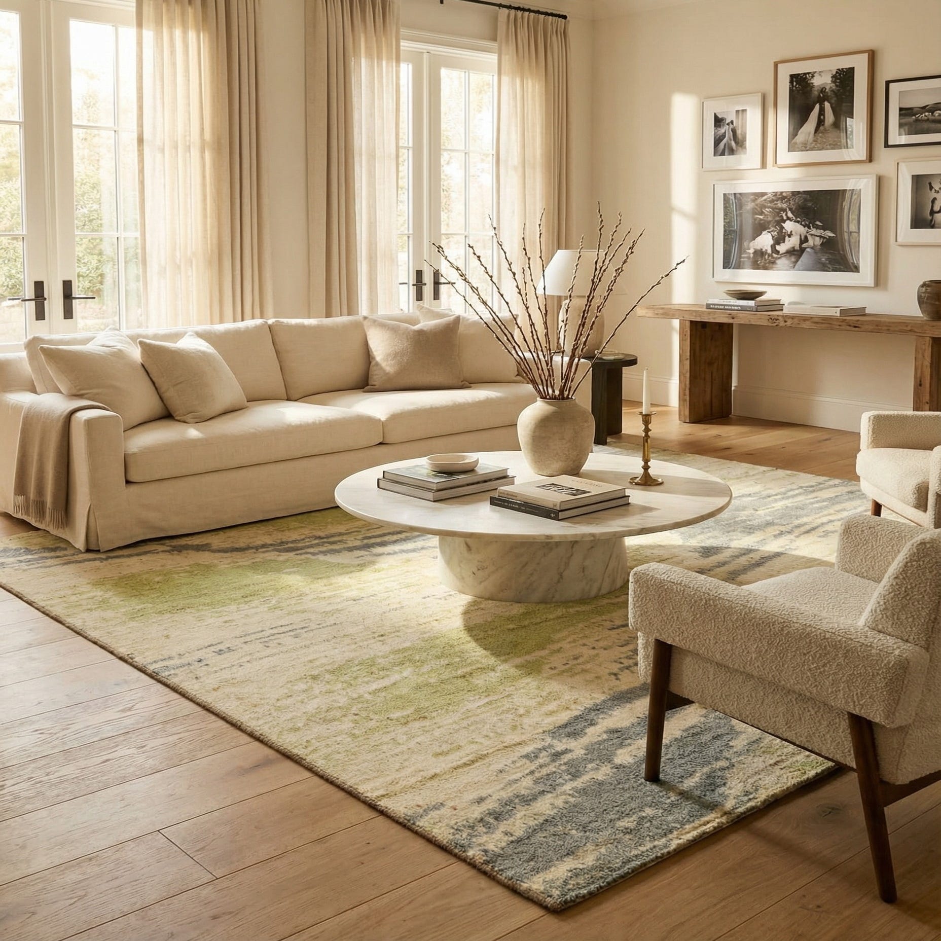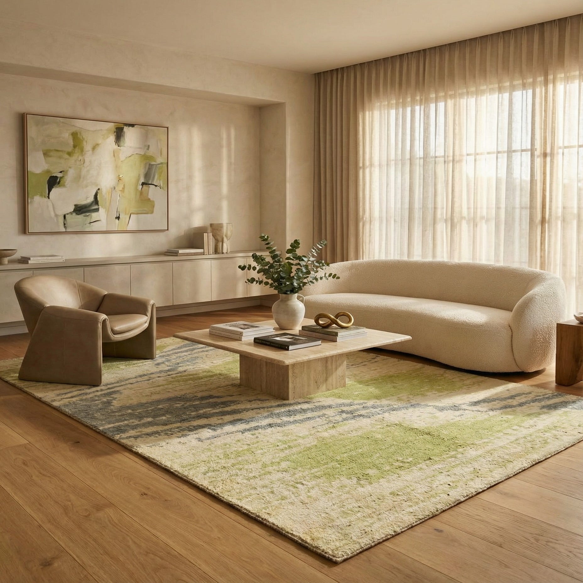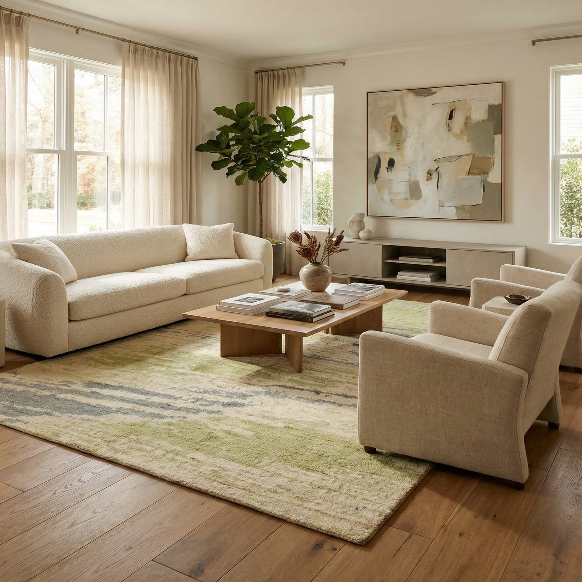 A 6x9 rectangular Darya rug with an abstract pattern in ivory, cream, light green, and gray, suitable for a living room.