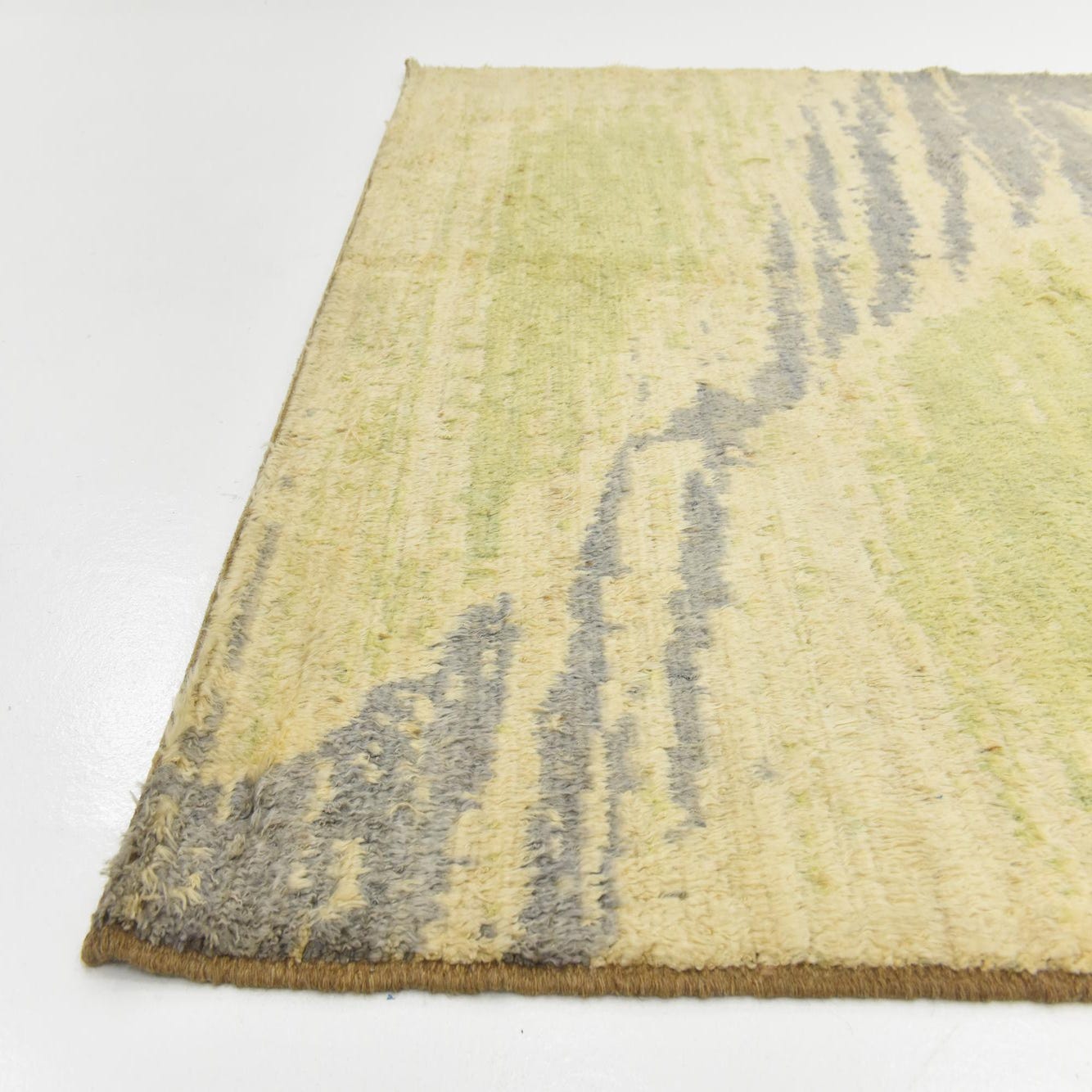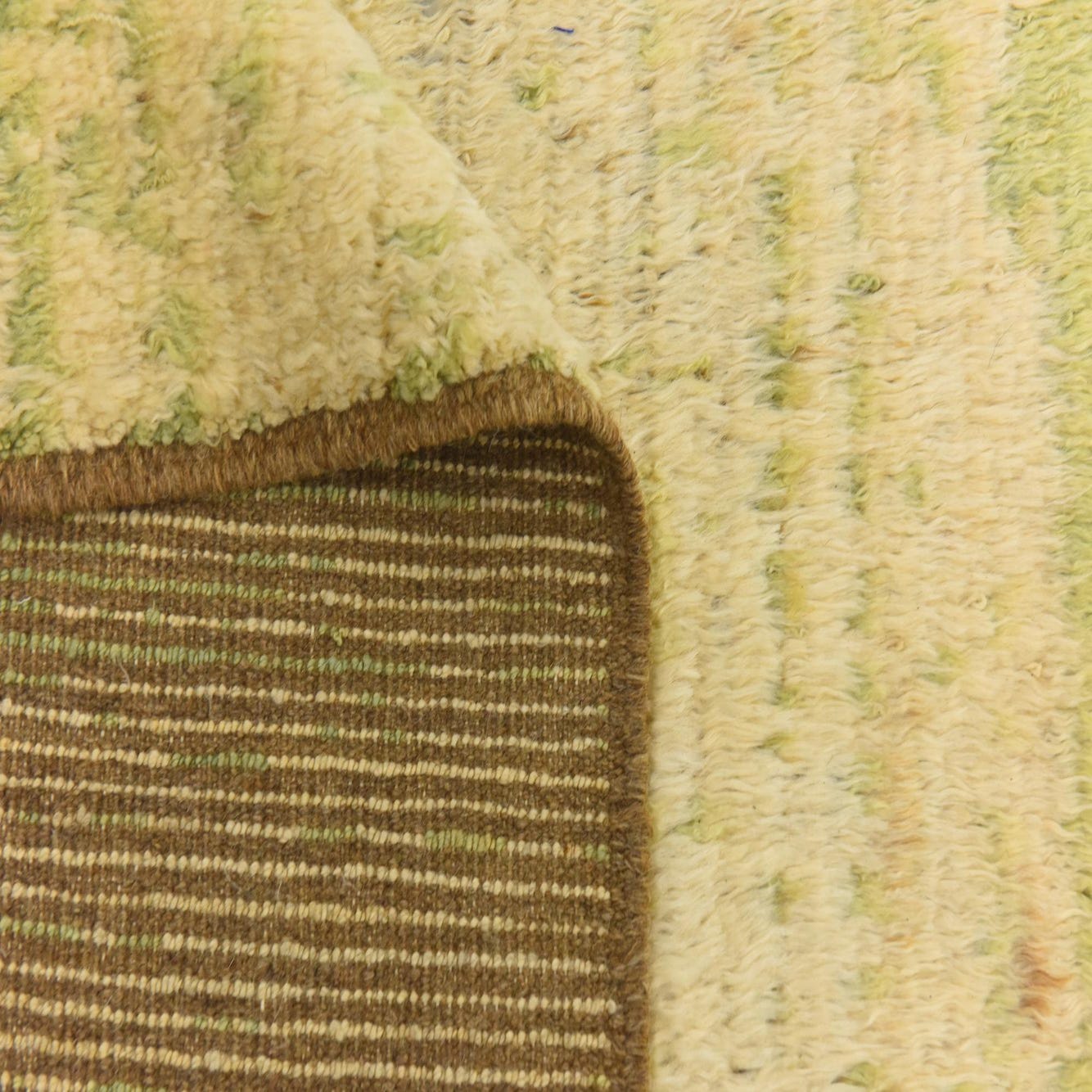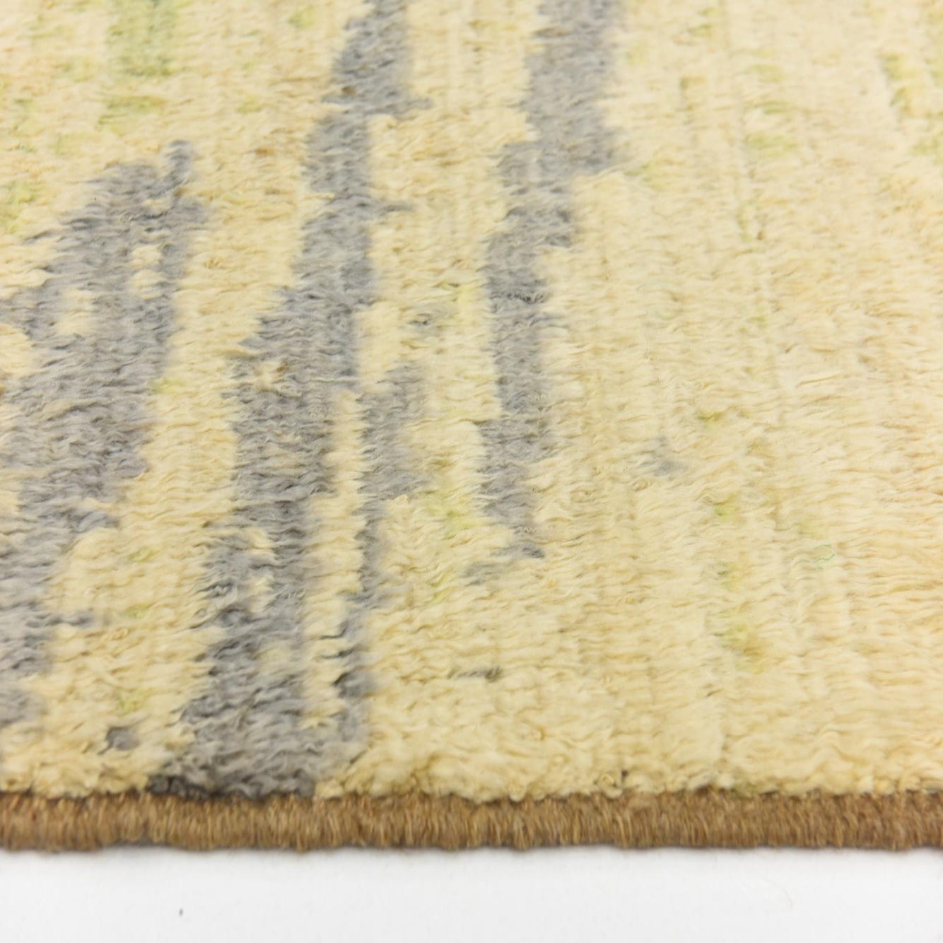 This Darya collection rug is a hand-knotted 6x9 piece crafted from 100% wool, offering a soft and inviting underfoot experience with a robust texture. The pattern showcases an abstract design, with flowing linear elements in varying shades of gray and light green creating movement against the cream background, offering both visual interest and a serene aesthetic. These subdued hues allow for seamless integration into a variety of interior design schemes.
