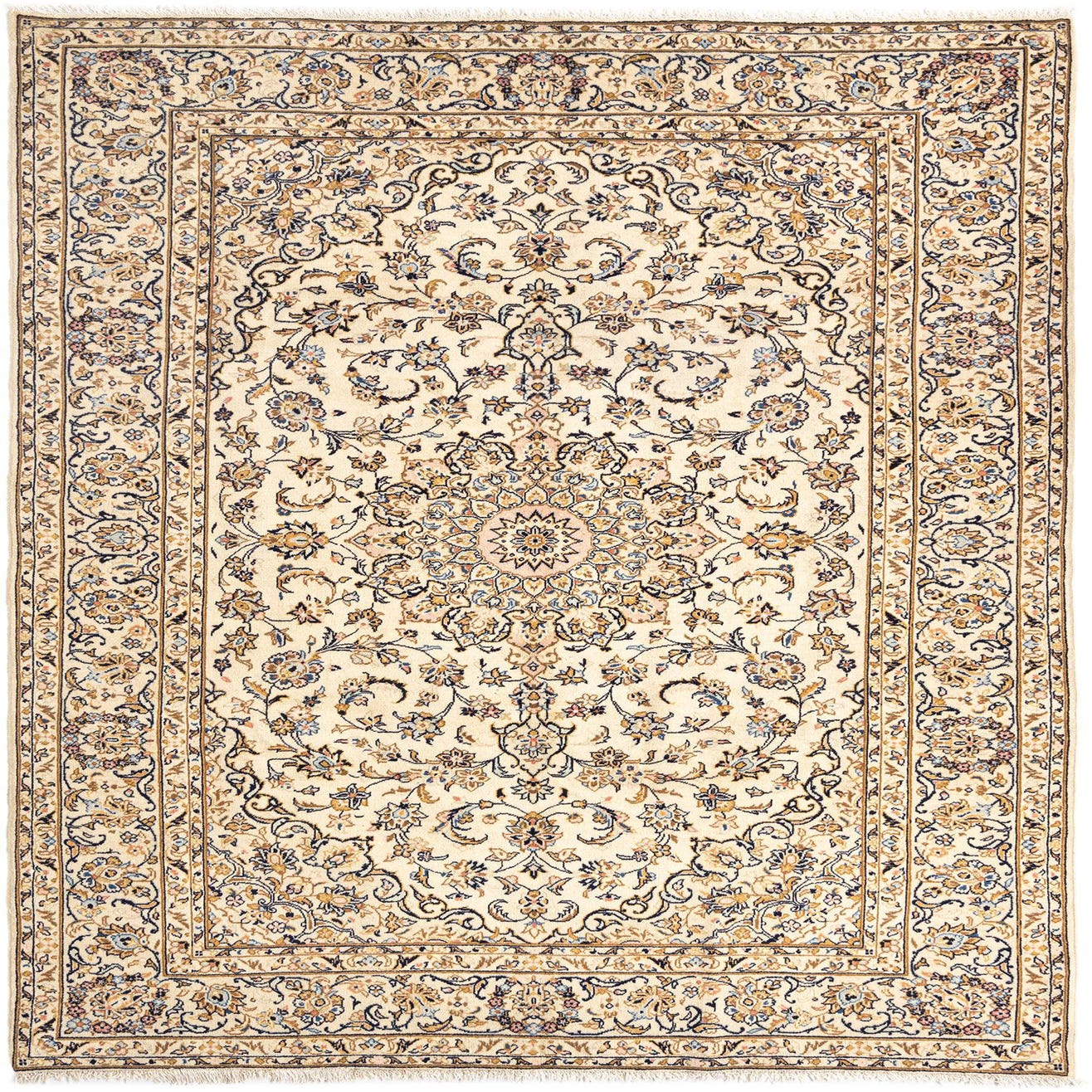 A 6x9 rectangular Kashan Persian rug in ivory and cream with intricate floral patterns and a central medallion.