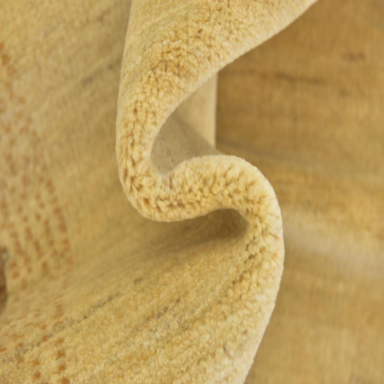 The Kashkuli Gabbeh collection offers a 6x9 hand-knotted rug crafted from 100% wool, known for its warmth and durability. This rug features a minimalist design that emphasizes natural beauty and understated elegance. The main color anchoring the design is cream, harmoniously complemented by light brown and gold accents. The use of color and subtle shading creates a sense of depth and richness.