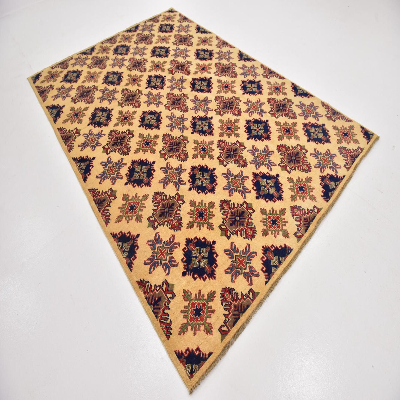 A cream ground provides a bright, neutral backdrop for a repeating geometric medallion pattern in navy, blue, brown, olive and warm red. Alternating diamond-shaped medallions and smaller cross-like floral motifs form a steady, rhythmic layout that feels both traditional and refreshed. Hand-knotted from 100% hand-spun wool, the rug’s surface has a soft, slightly cushioned pile with subtle tonal variation from the hand-spun yarns and a firm, structured weave underfoot.
