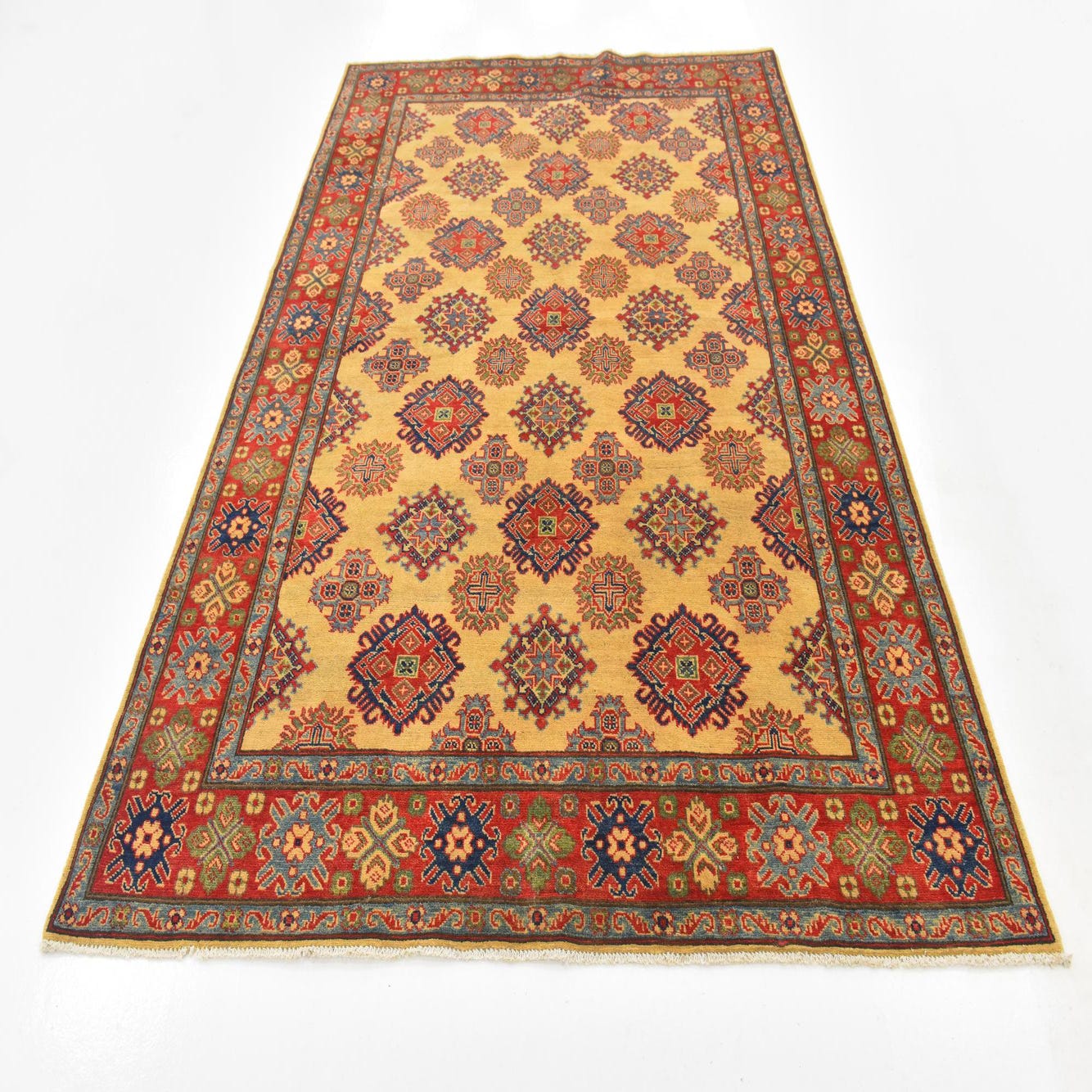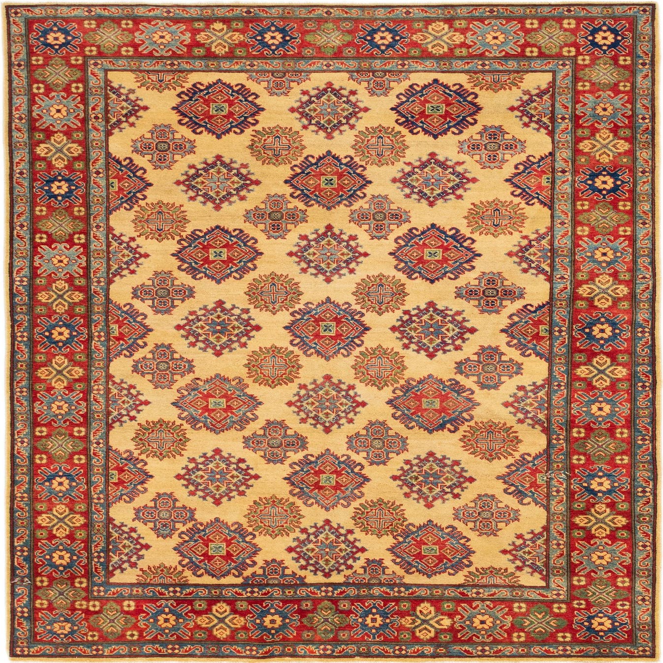 This Kazak collection rug brings a touch of traditional charm with its symmetrical geometric pattern and rich color palette. The hand-knotted construction of 100% hand-spun wool provides a dense pile that offers both comfort and durability. This 6x9 rug showcases a cream background complemented by an array of colors including black, blue, brown, hunter green, light green, red, and navy blue, providing a versatile piece for a range of interior settings.