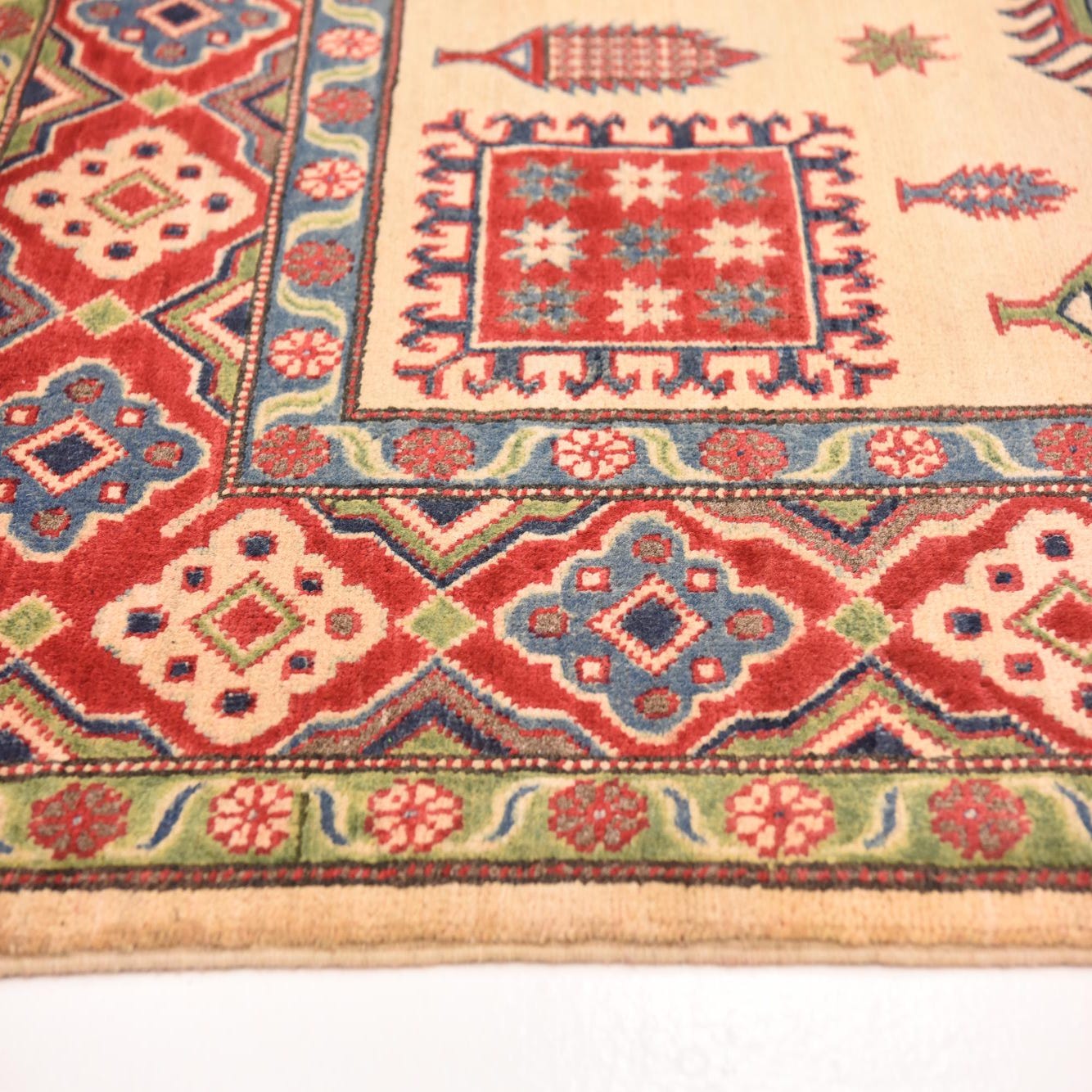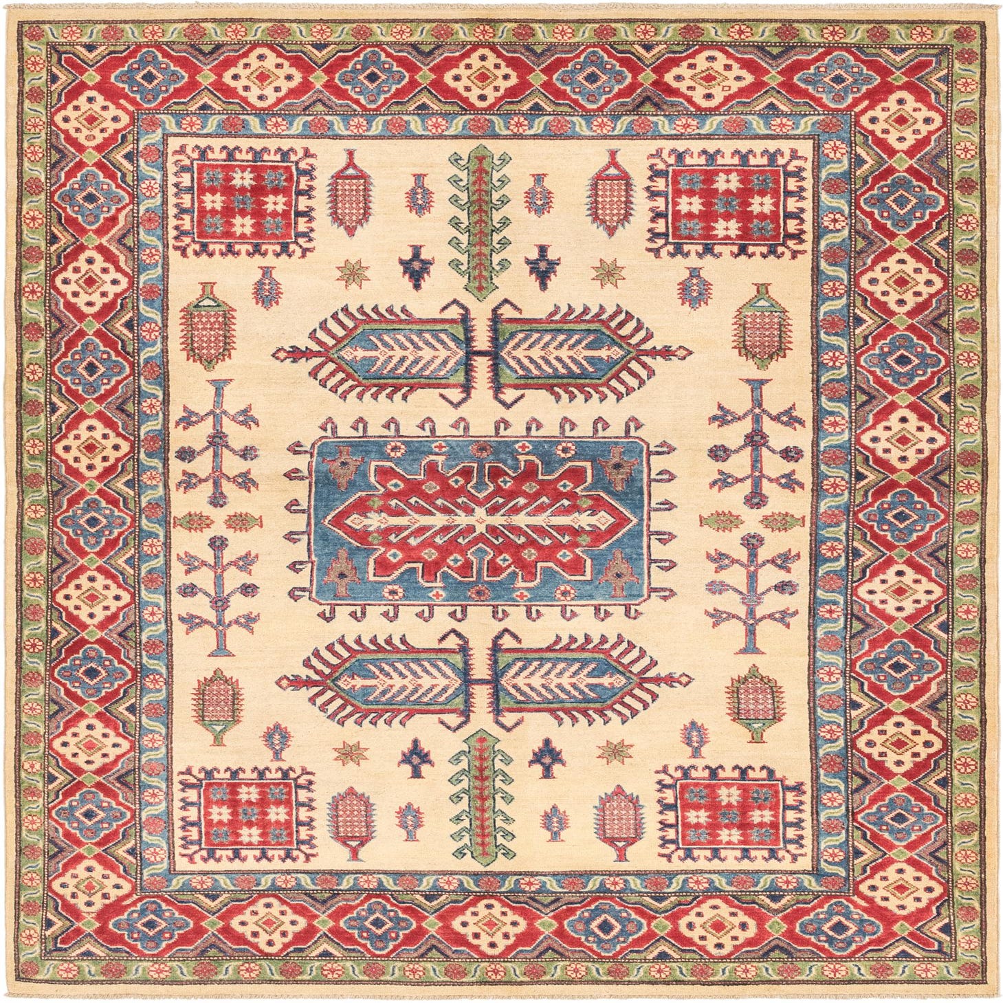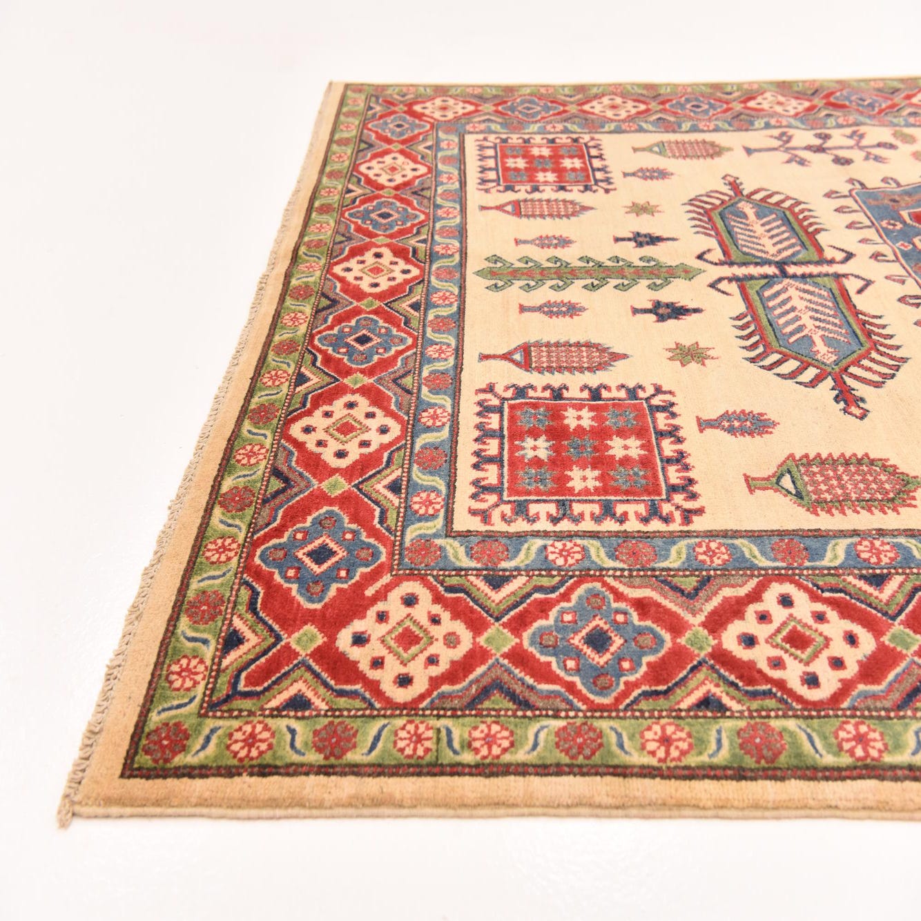 A 6x9 rectangular ivory Kazak rug with traditional Southwestern and tribal patterns in red, blue, and green.