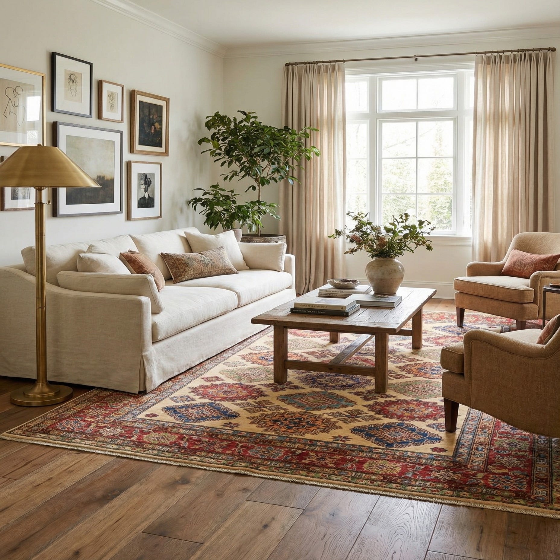A 6x9 rectangular ivory and red traditional Kazak rug with colorful tribal medallions, perfect for a living room.