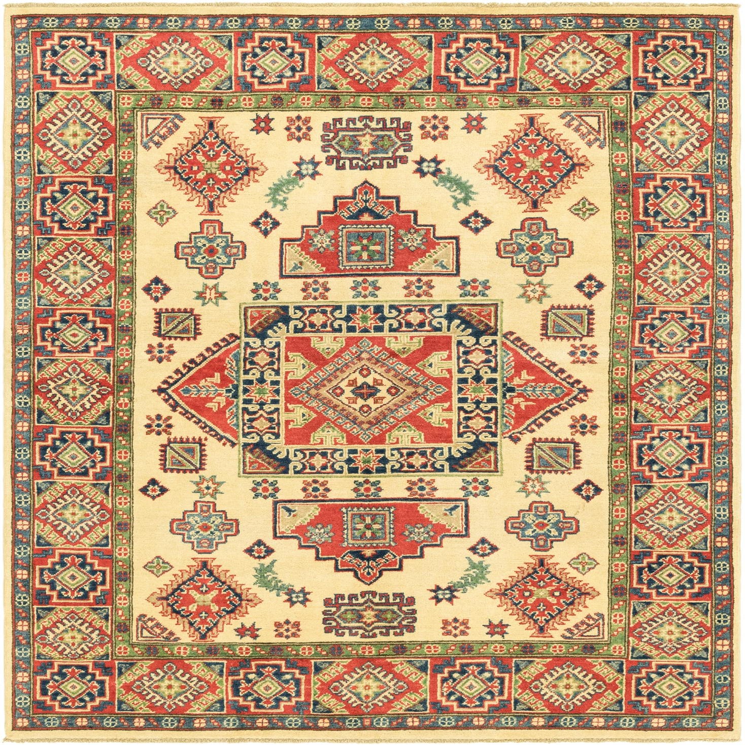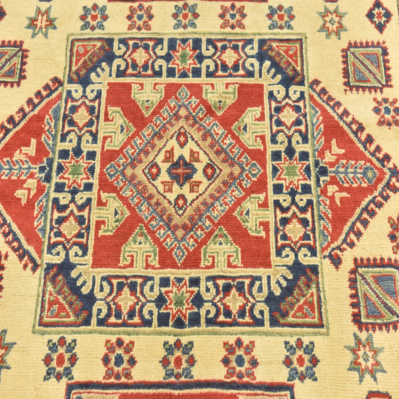 The Kazak Collection offers a 6x9 hand-knotted rug crafted from 100% hand-spun wool, providing a dense and durable texture suited for high-traffic areas. This rug showcases a traditional geometric pattern with a central medallion, echoed by smaller motifs and framed by a decorative border. The cream background serves as a neutral canvas for the vivid palette that includes blue, brown, green, red, and navy blue accents. Detailed fringe embellishes either end, enhancing the rug's artisanal character.