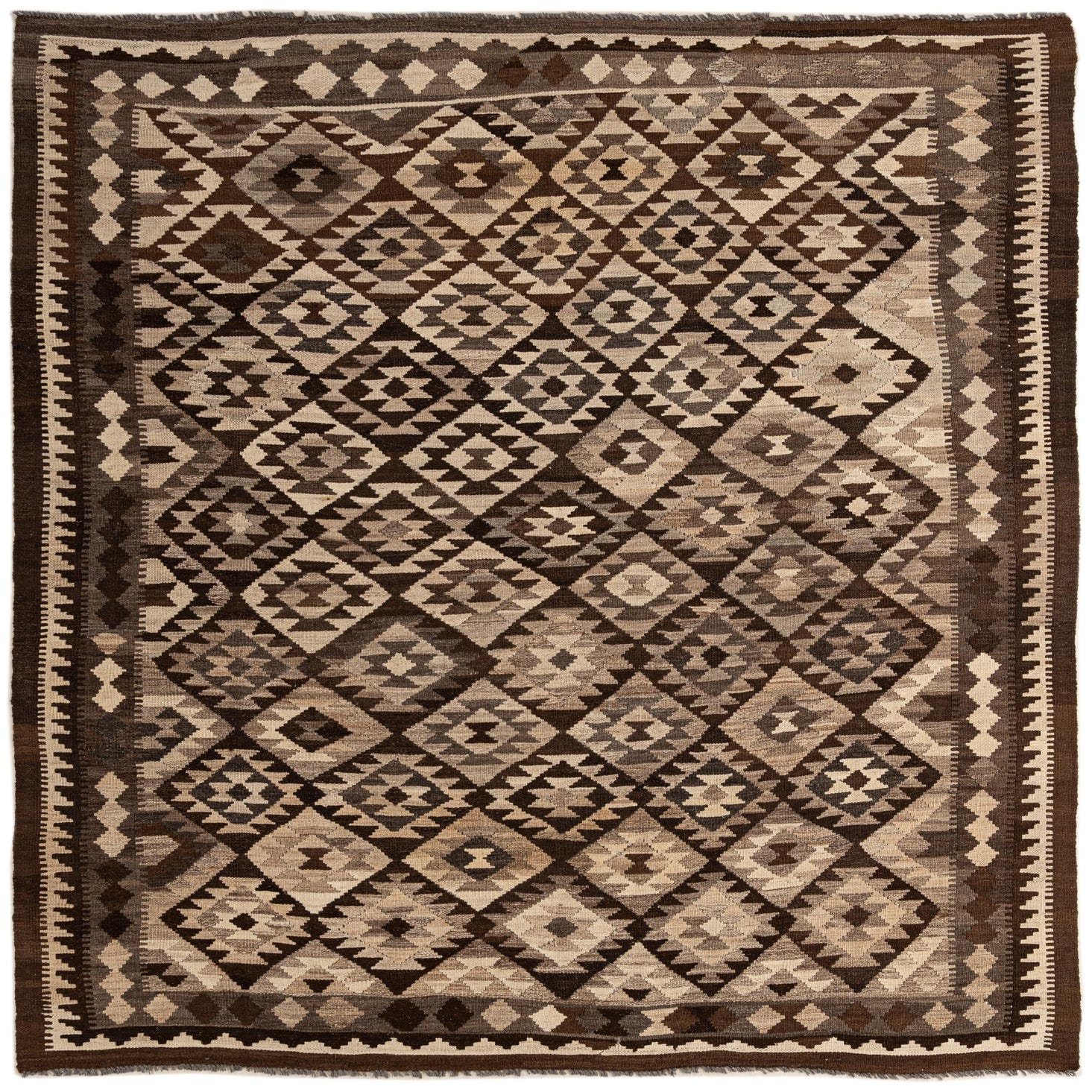 A 6x9 rectangular Kilim Maymana rug with a tribal geometric pattern in shades of ivory, cream, and dark brown, suitable for a living room.