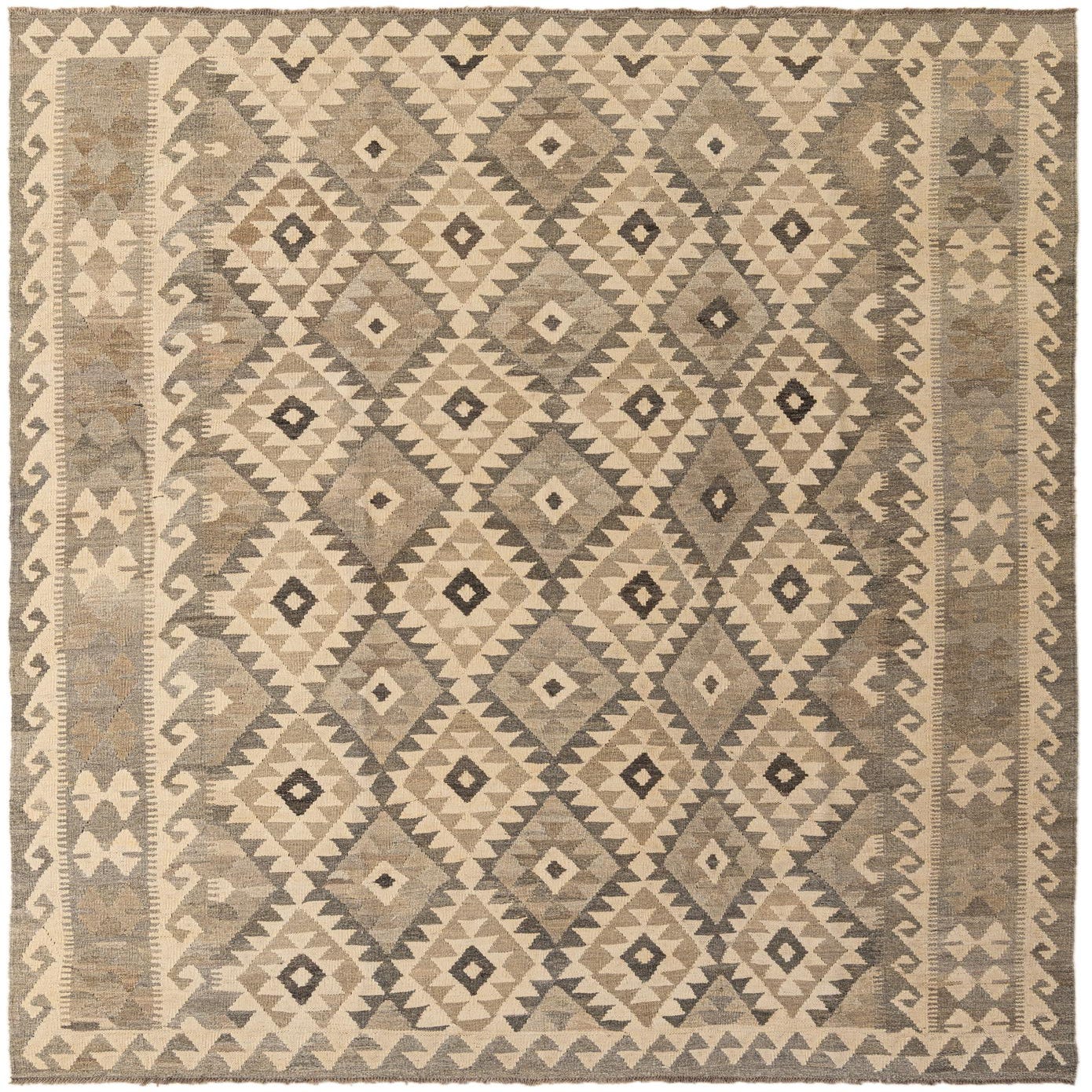 A 6x9 rectangular Kilim Maymana rug with a tribal geometric pattern in ivories, creams, and various shades of brown.