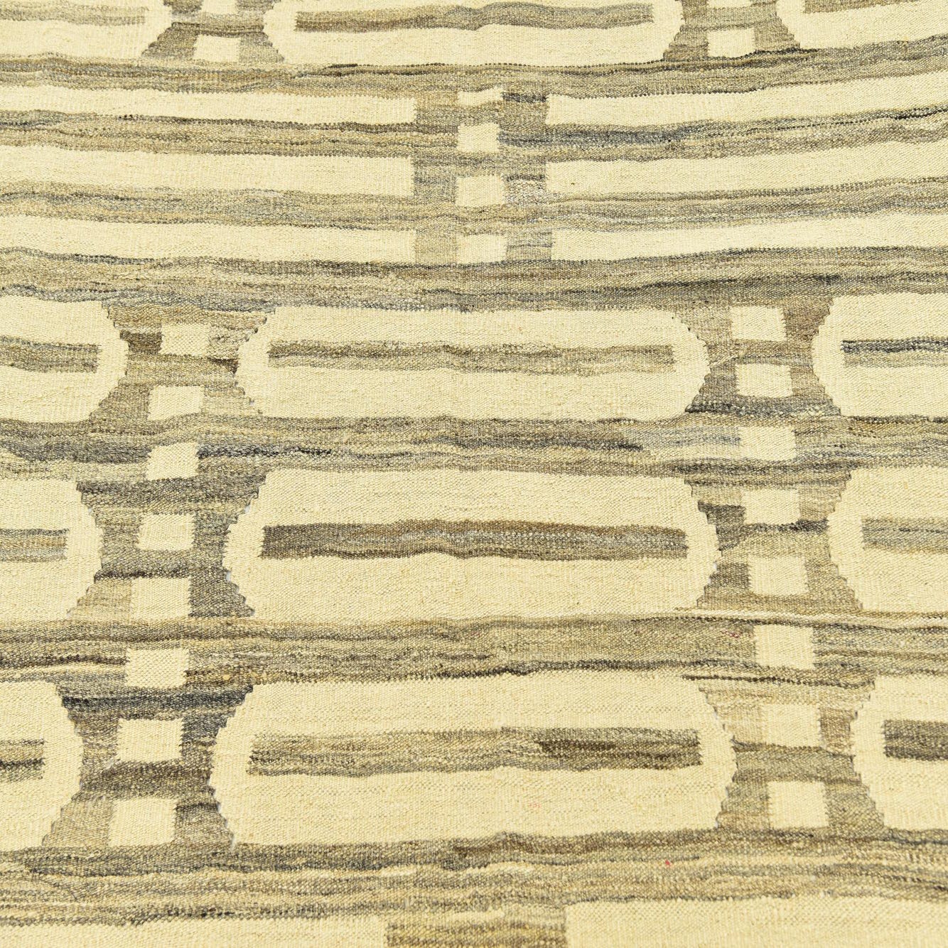 A 6x9 rectangular Kilim Modern rug with an ivory and cream tribal geometric pattern, suitable for a living room.