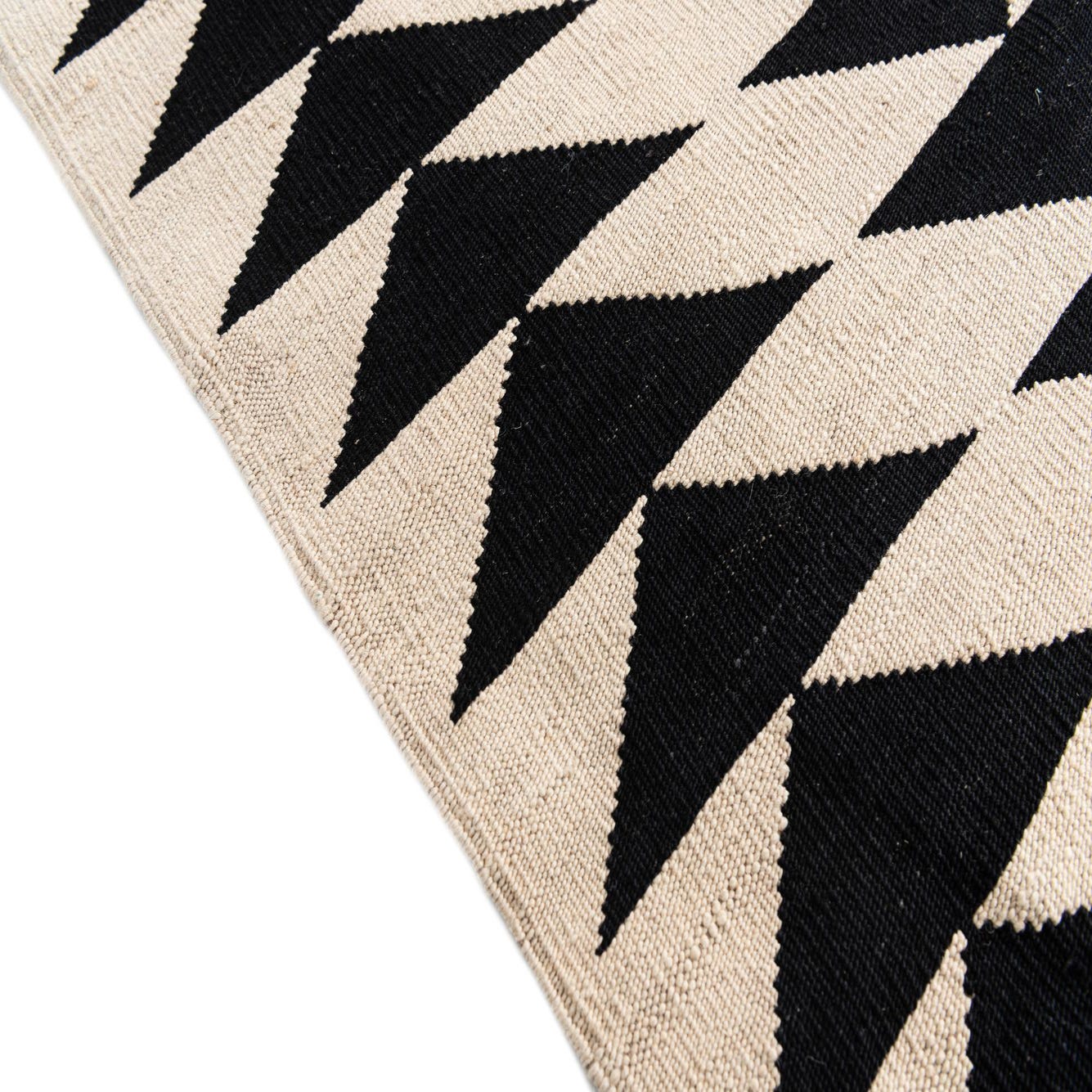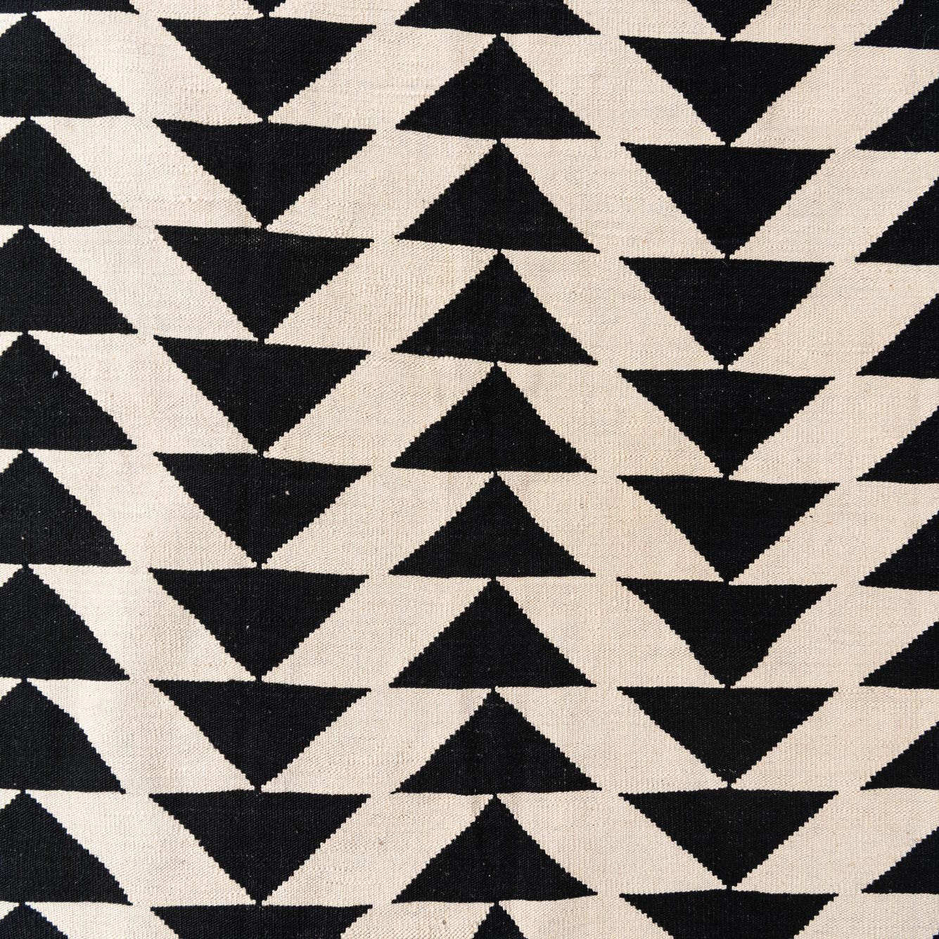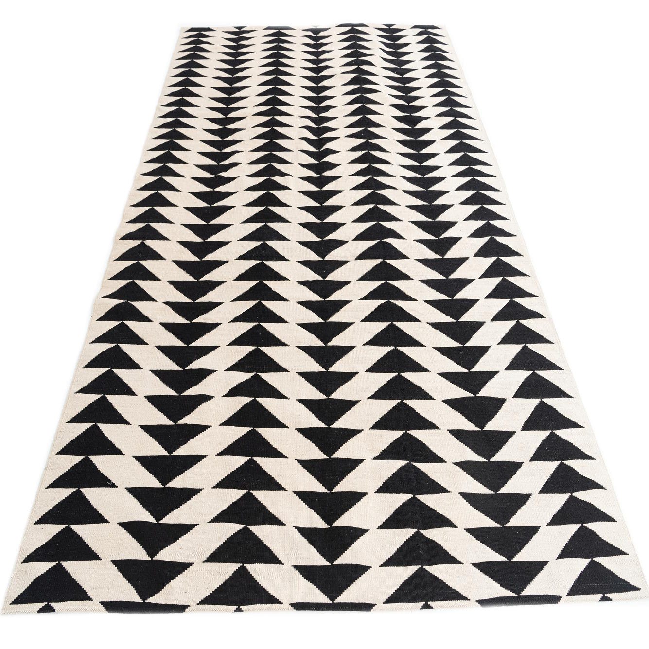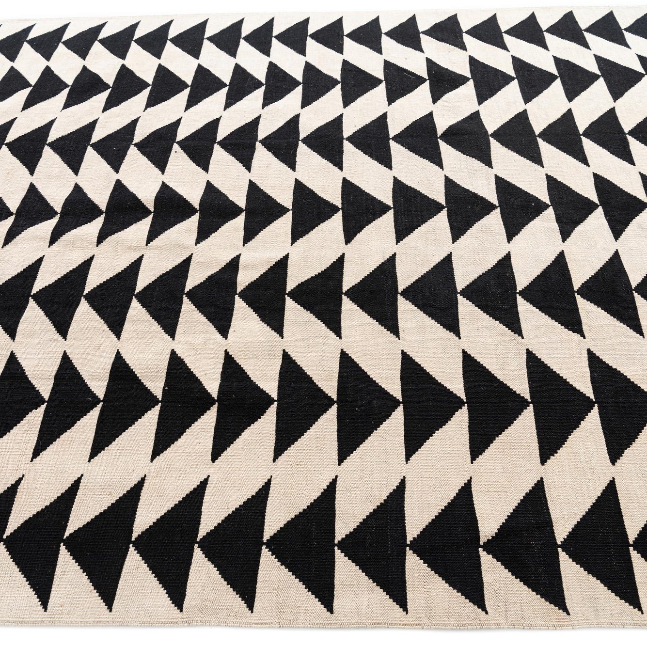 A 6x9 rectangular ivory and black flatweave rug with a repeating tribal triangle pattern, ideal for a living room.