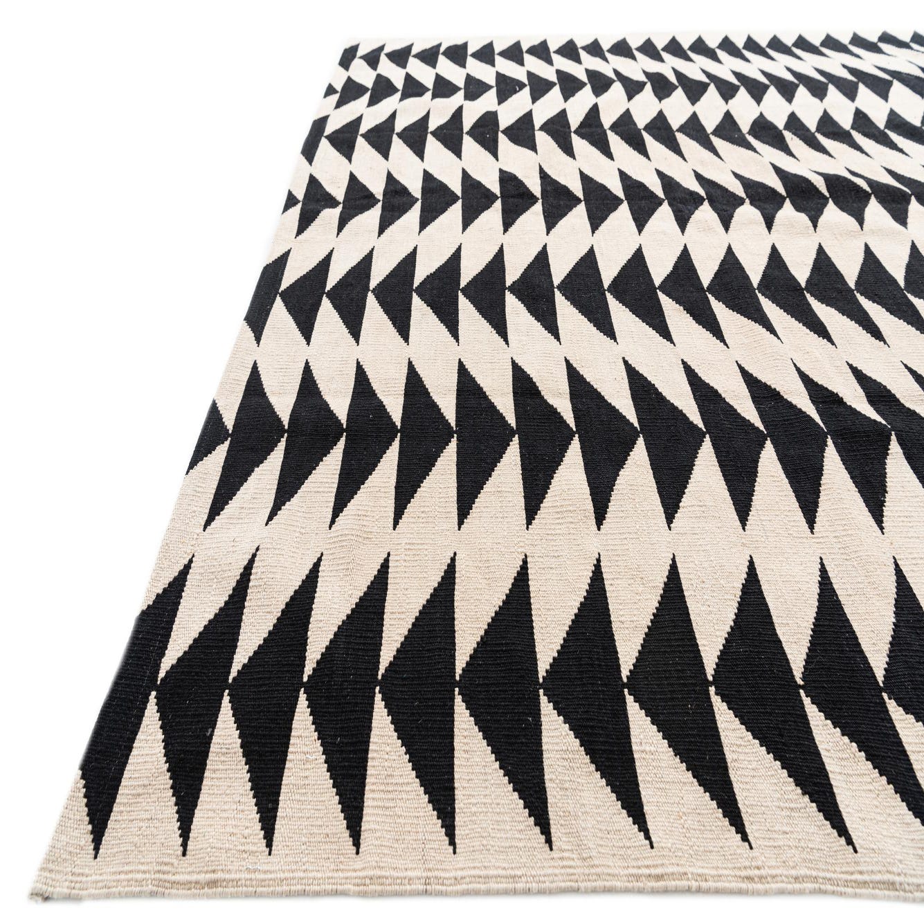 The Kilim Modern collection presents a boldly patterned 6x9 hand-woven rug crafted from 100% wool, ensuring durability and a soft underfoot experience. The design showcases a striking geometric pattern with crisp, contrasting black and cream hues, making it a compelling anchor piece for a variety of interior design themes. The cream background provides a neutral canvas, allowing the structured black chevron motifs to command attention and add visual interest to any room.