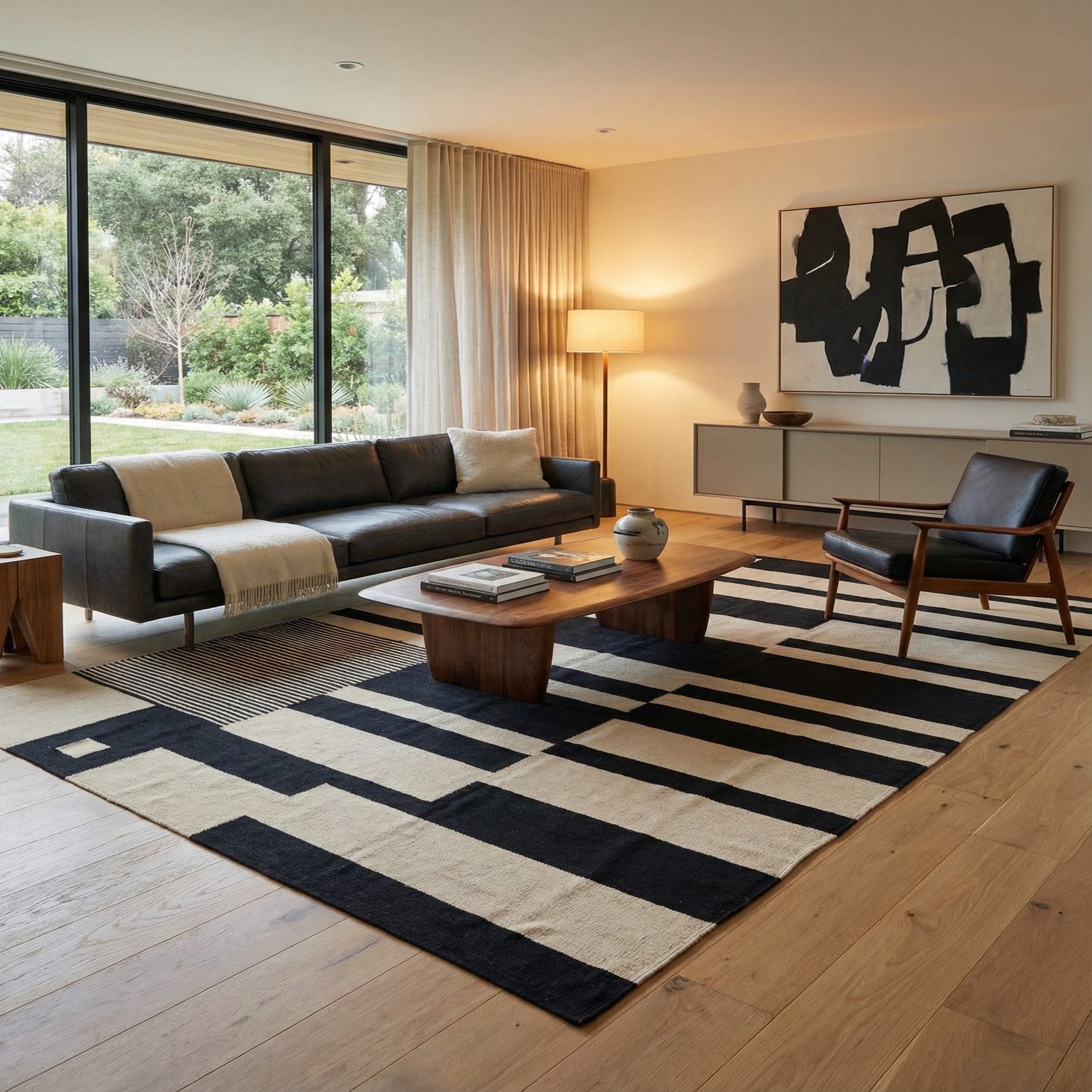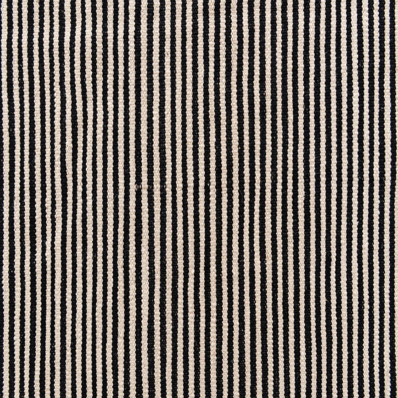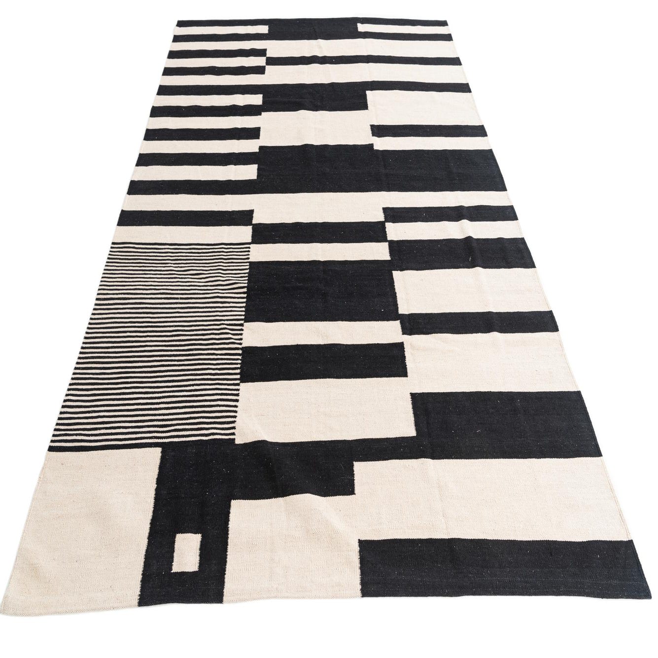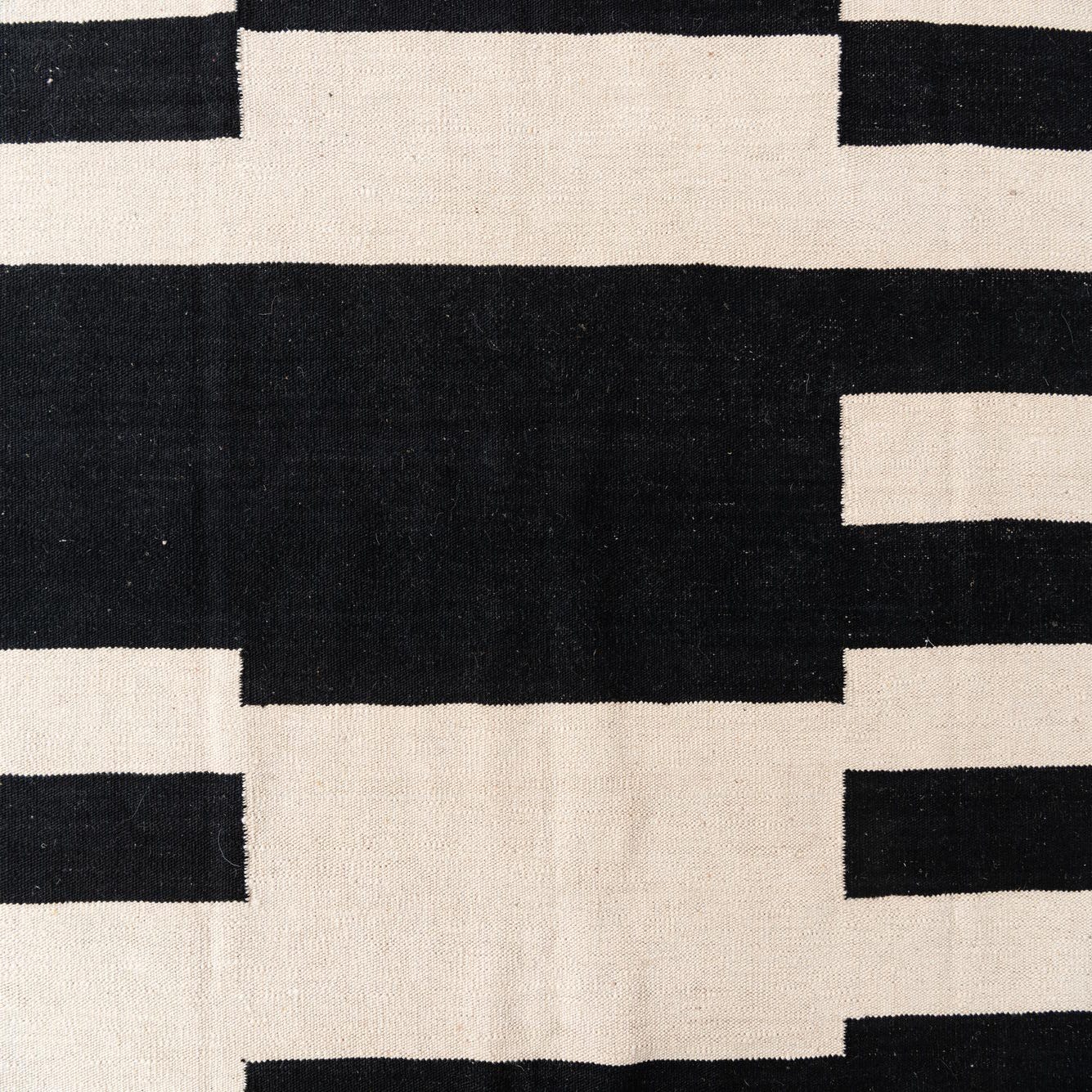 A 6x9 rectangular ivory and black flatweave rug with a modern tribal abstract pattern, featuring thick horizontal stripes and a small square detail.