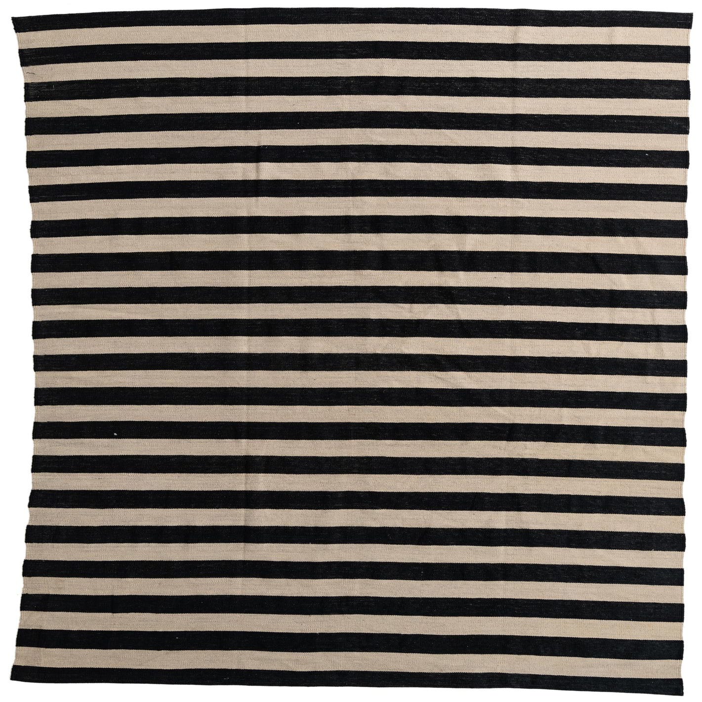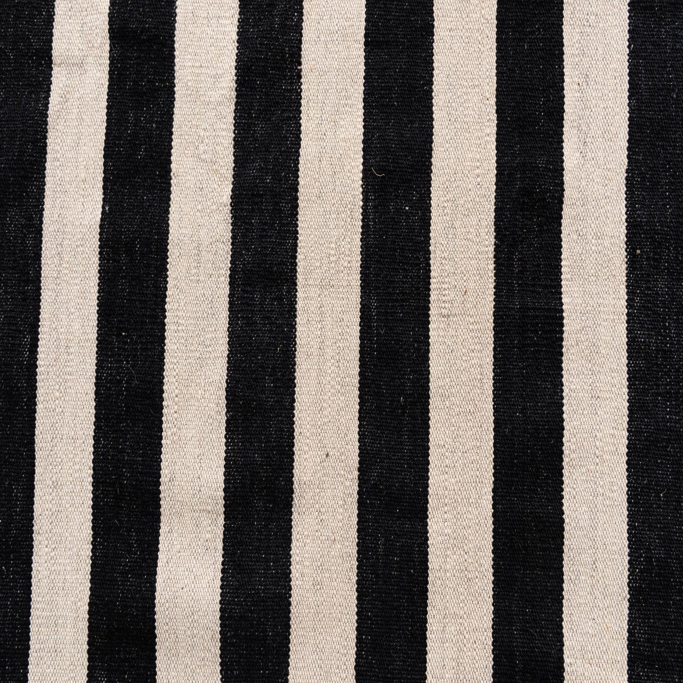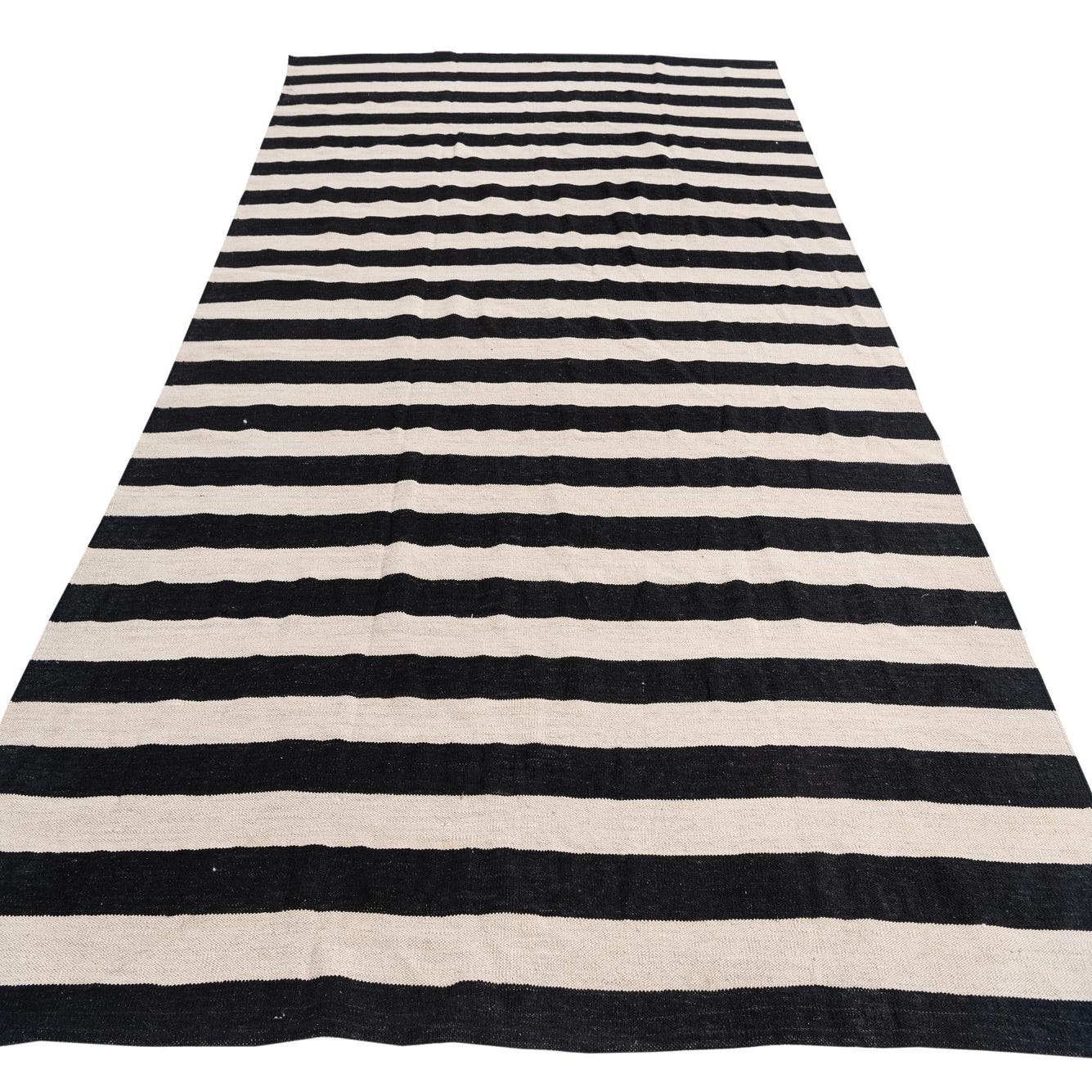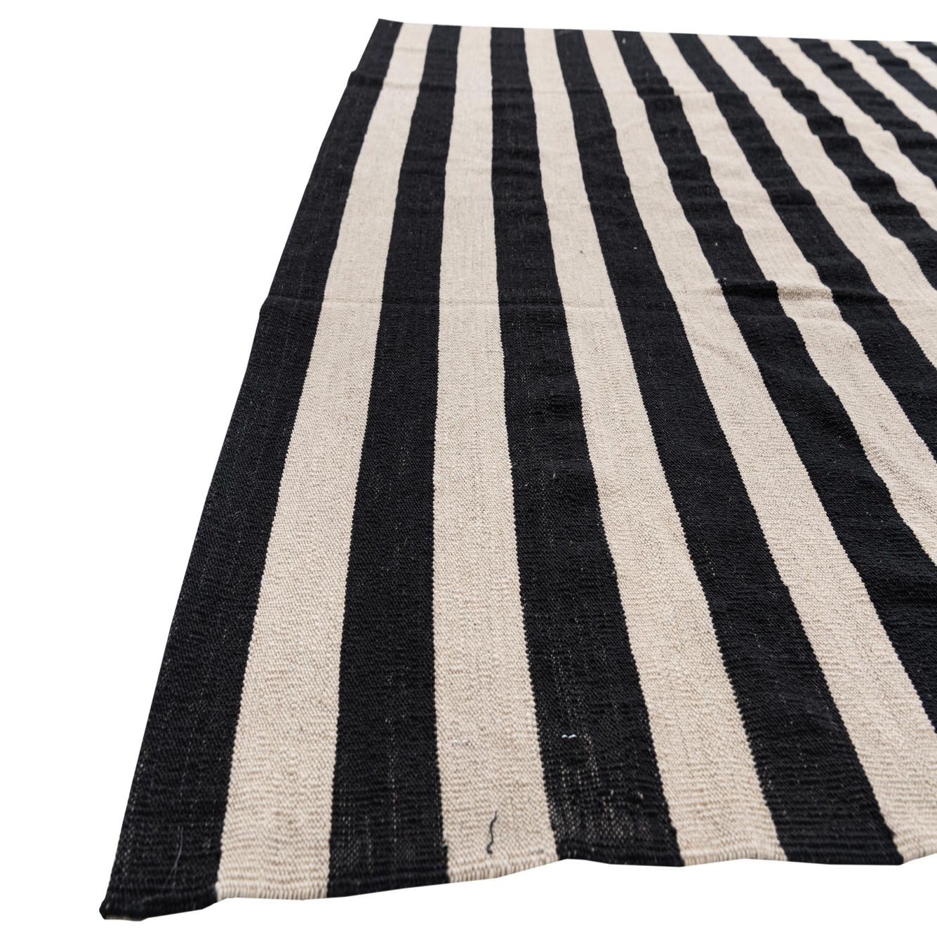 A 6x9 rectangular Kilim Modern rug with alternating horizontal stripes of black and ivory, showcasing its flatweave texture.