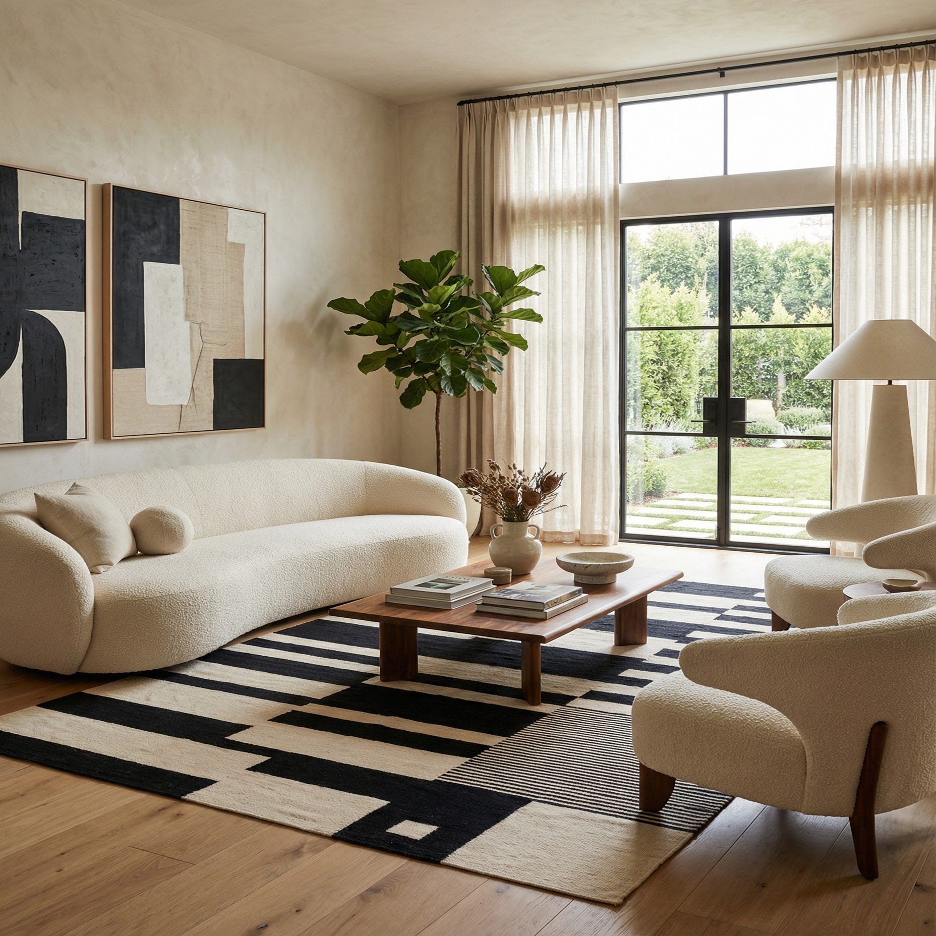 Primary color is Cream. Colors in this rug include: Cream, Black.