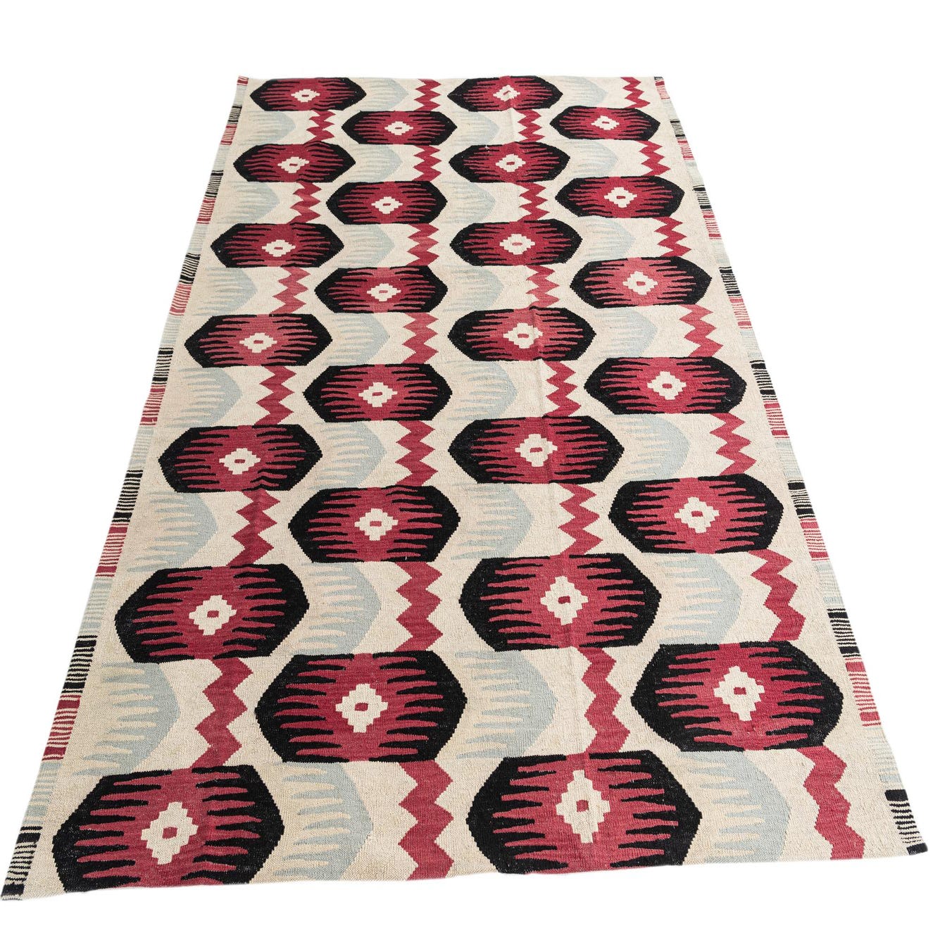 Part of the Kilim Modern collection, this hand woven 6x9 rug is crafted from 100% wool and features a dynamic array of patterns. The rug's primary cream background is complemented by a bold, geometric design encompassing black, gray, and red hues. The pattern consists of repeated motifs that exhibit a style reminiscent of traditional kilim craftsmanship with a modern twist.