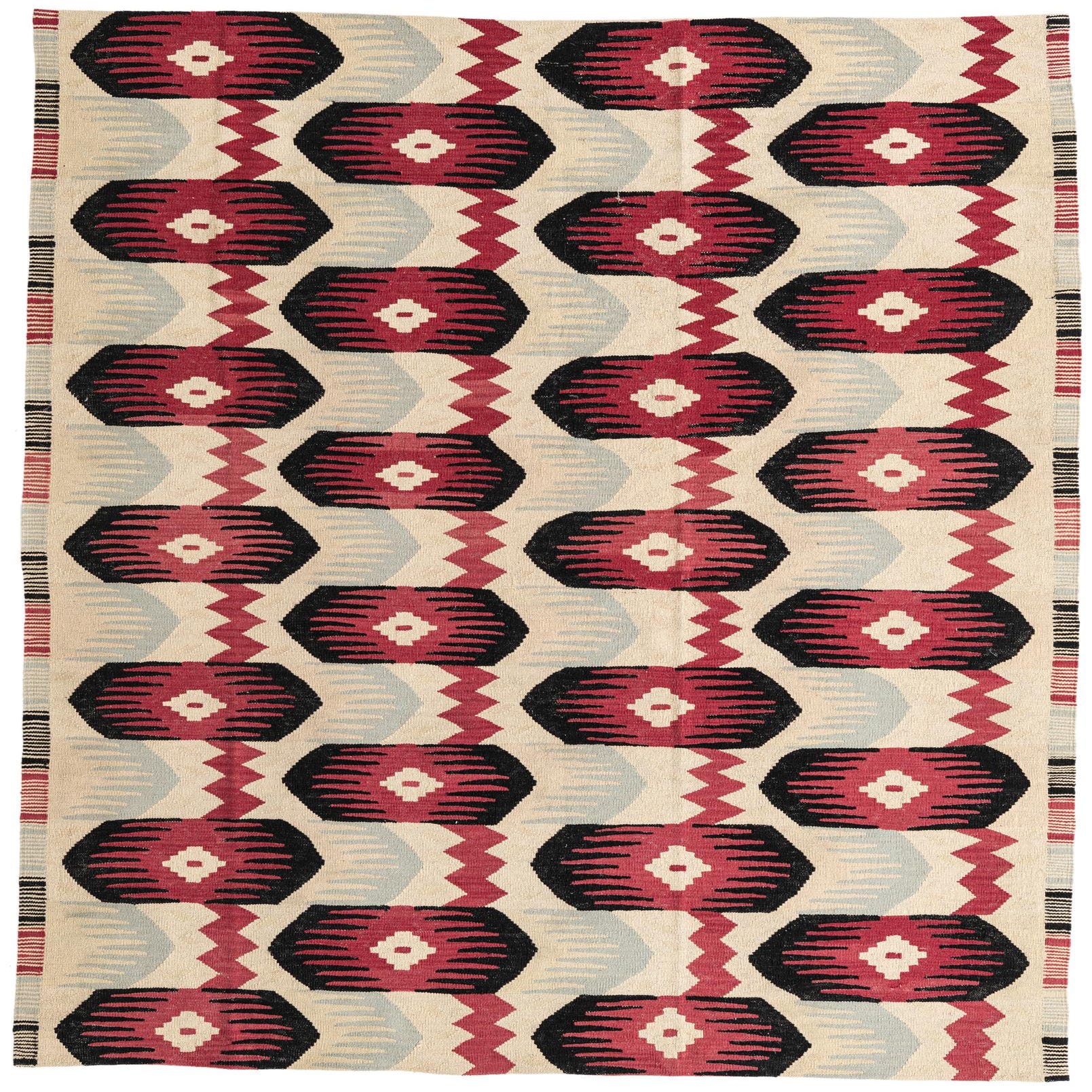 Primary color is Cream. Colors in this rug include: Cream, Black, Gray, Red.