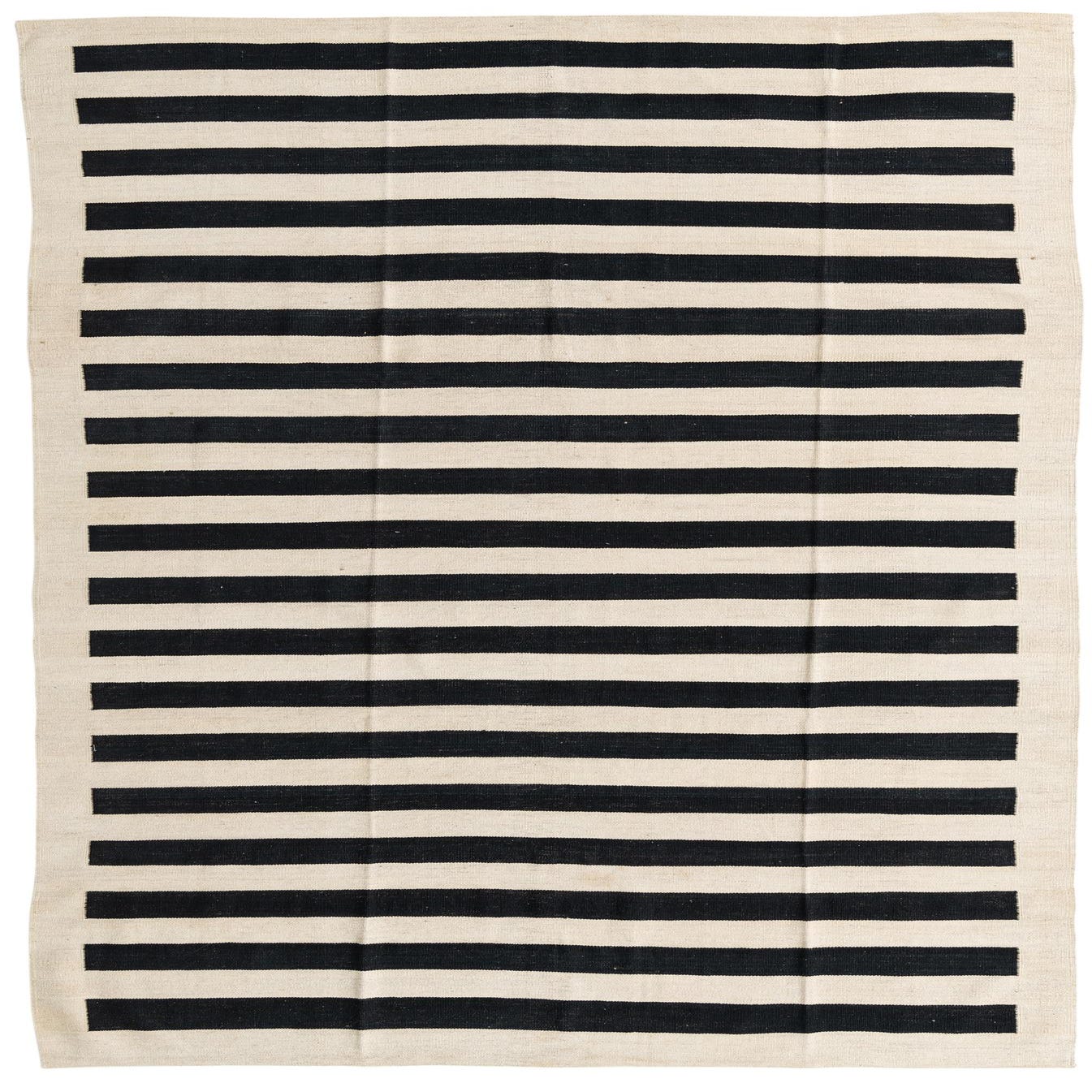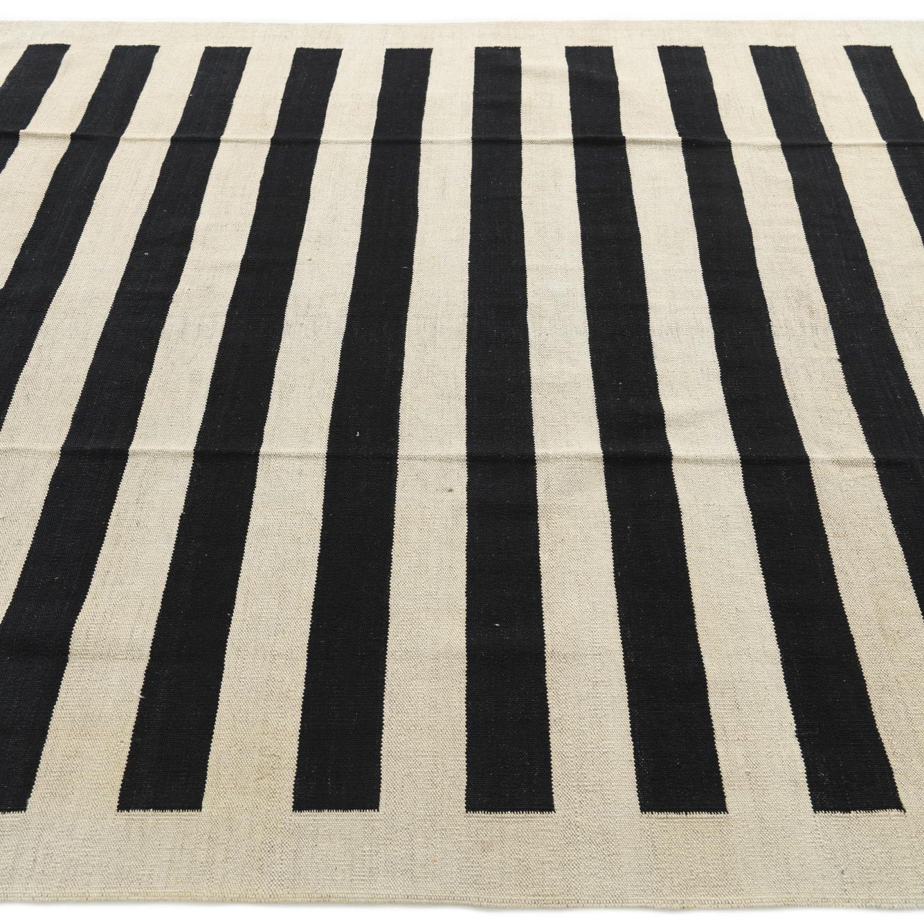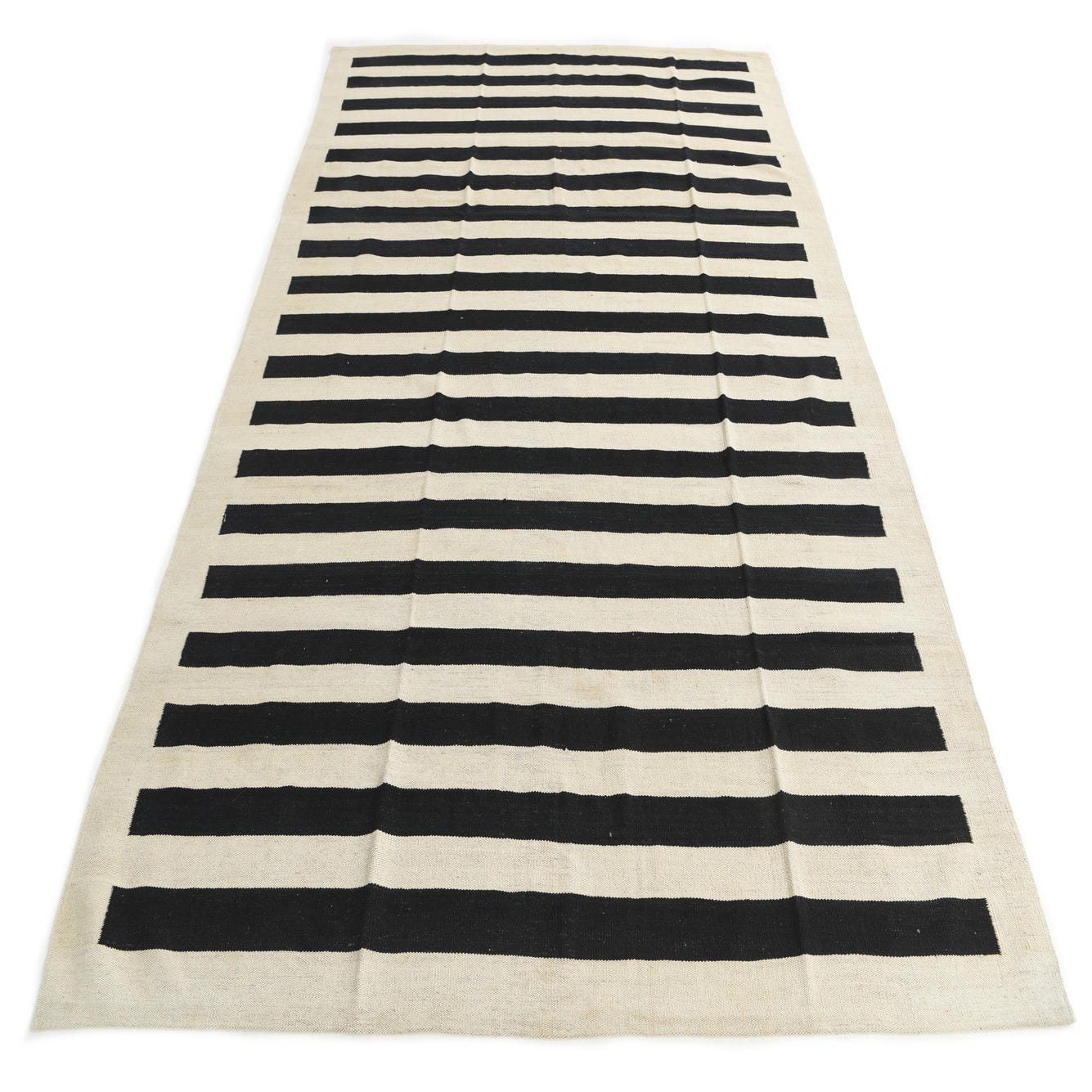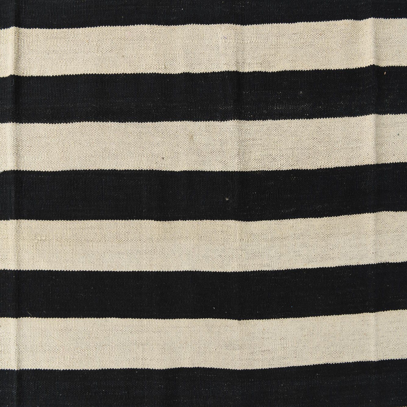 A 6x9 rectangular Kilim Modern rug with horizontal black and ivory stripes, suitable for a living room.