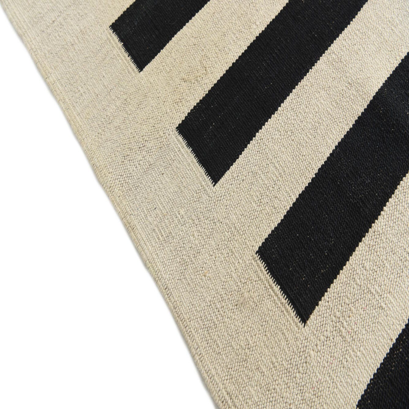 The Kilim Modern collection presents a 6x9 area rug, hand-woven of 100% wool that showcases a timeless aesthetic with contemporary appeal. This particular piece features a bold, linear black and cream stripe pattern that creates a striking visual contrast. The cream background serves as a neutral canvas that makes the black stripes stand out, offering a clean and minimalist look ideal for a variety of interior settings.