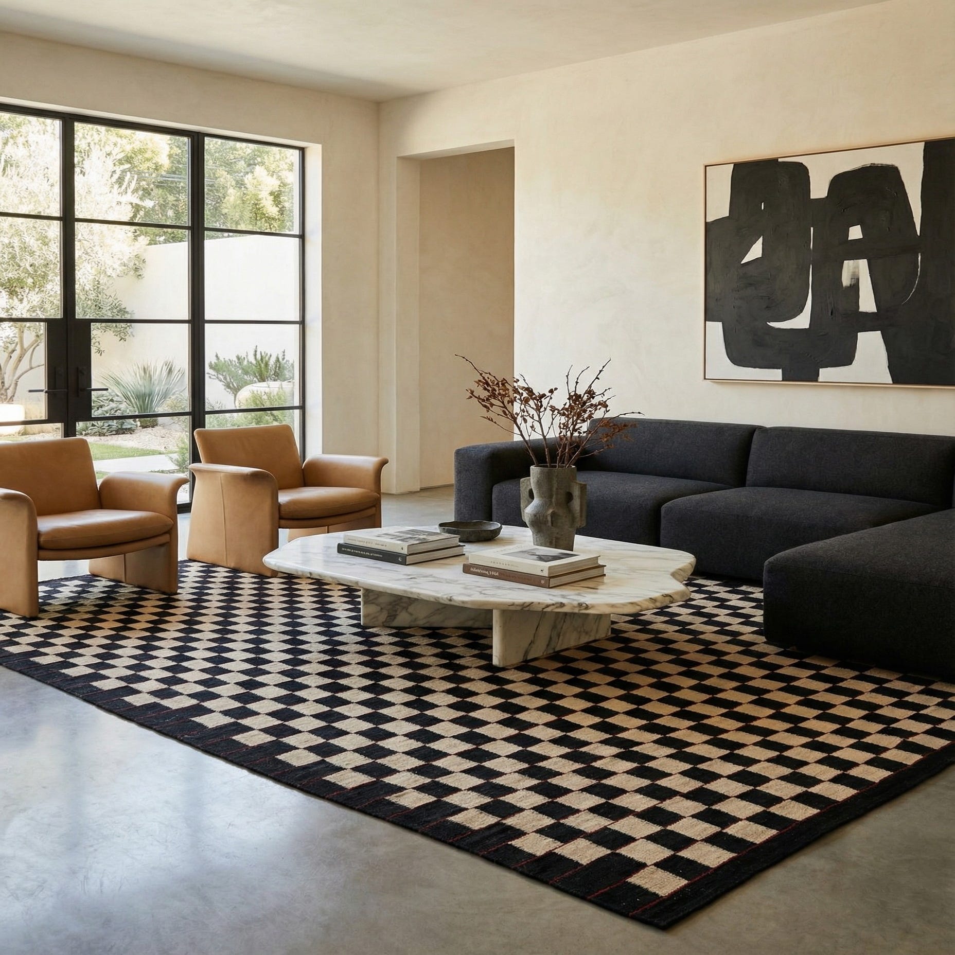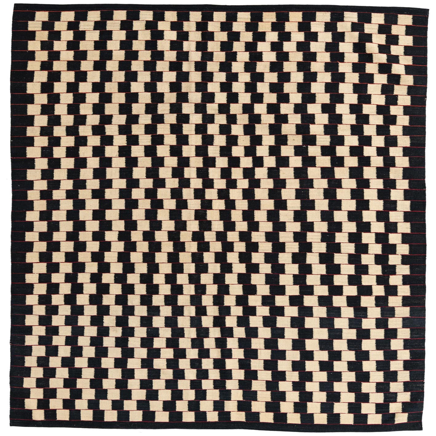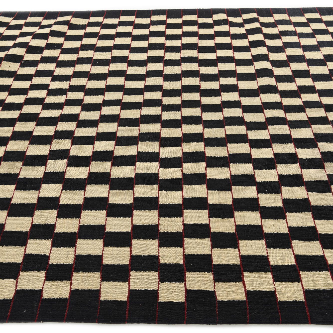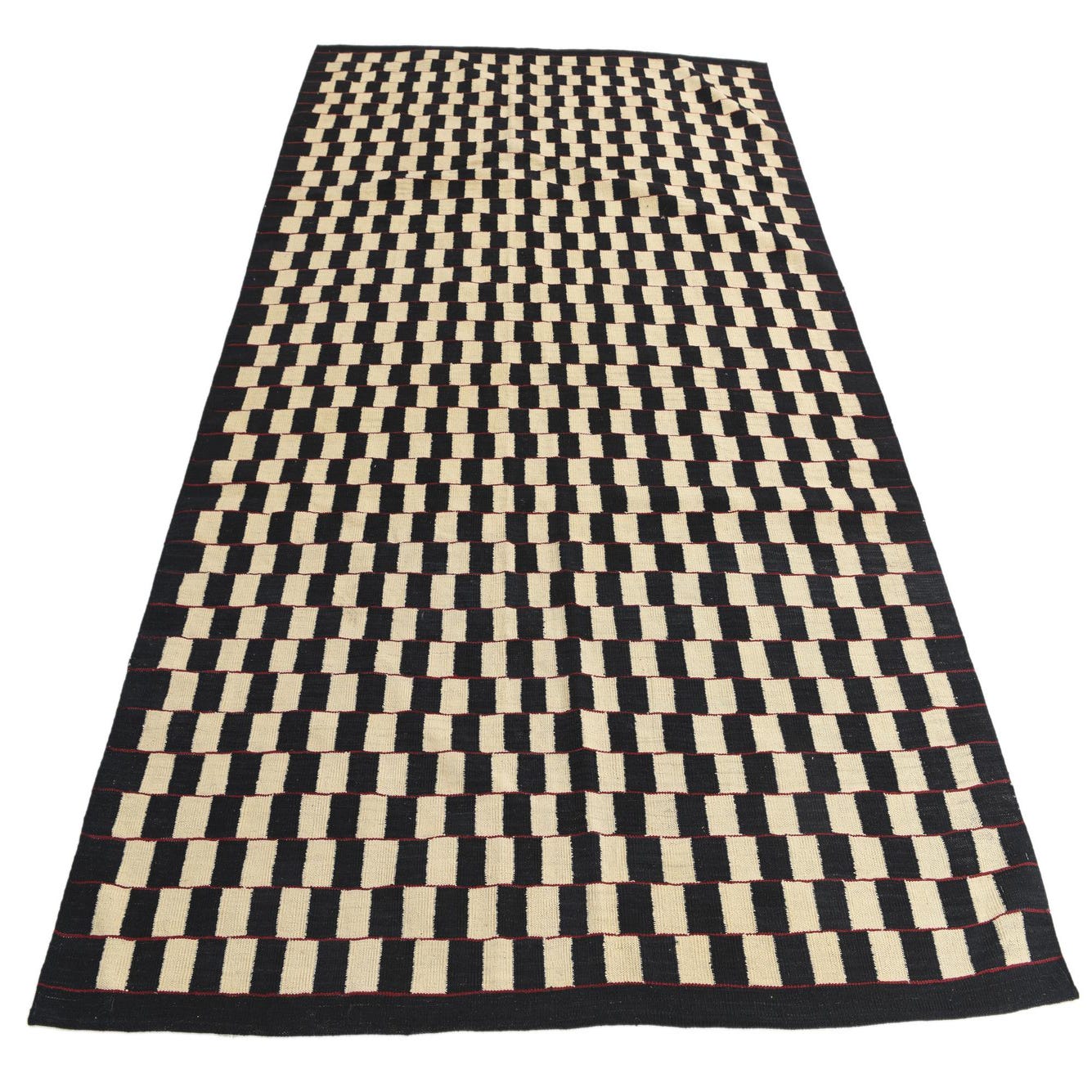 A 6x9 rectangular Kilim Modern rug with an ivory and black checkerboard pattern and red accents, suitable for a living room.