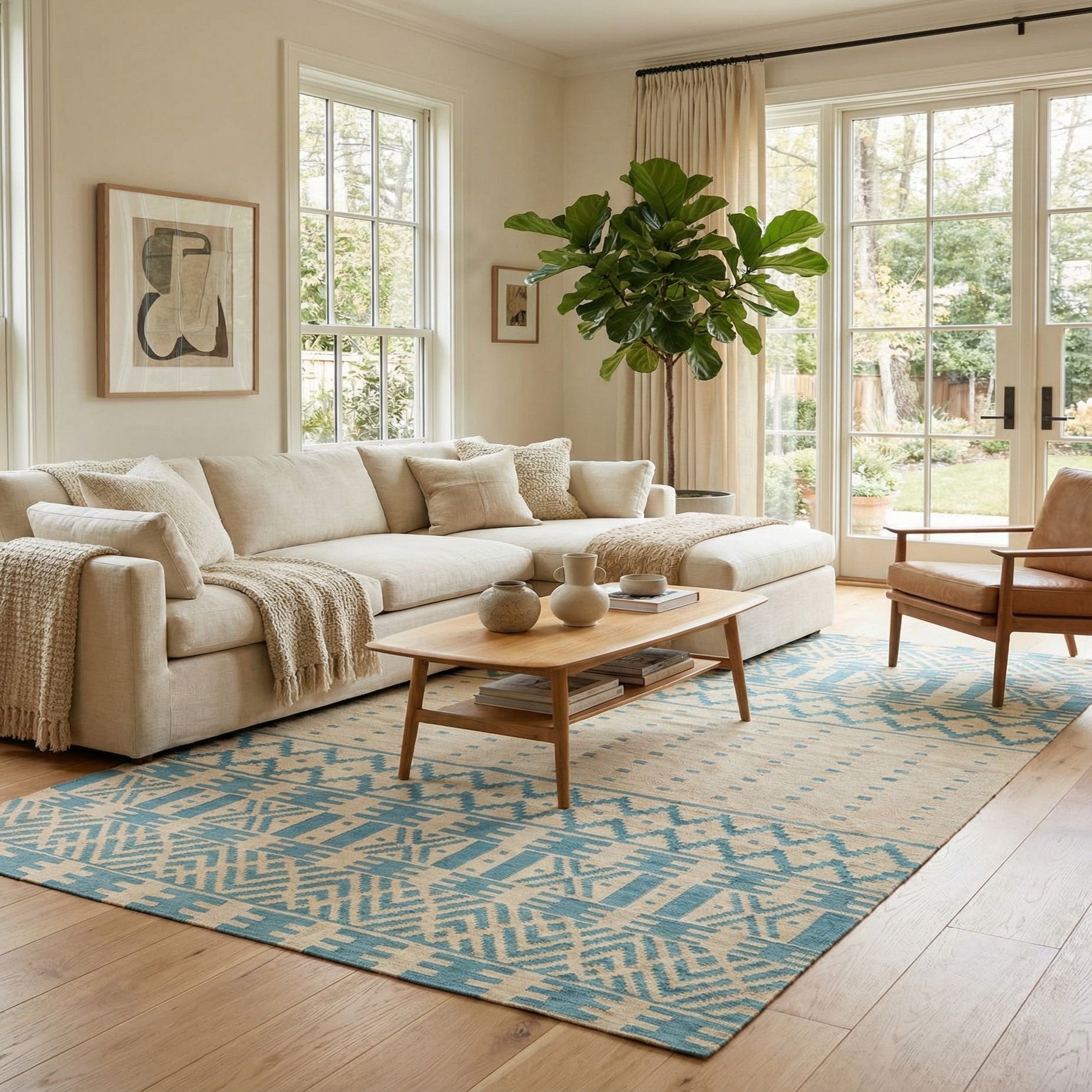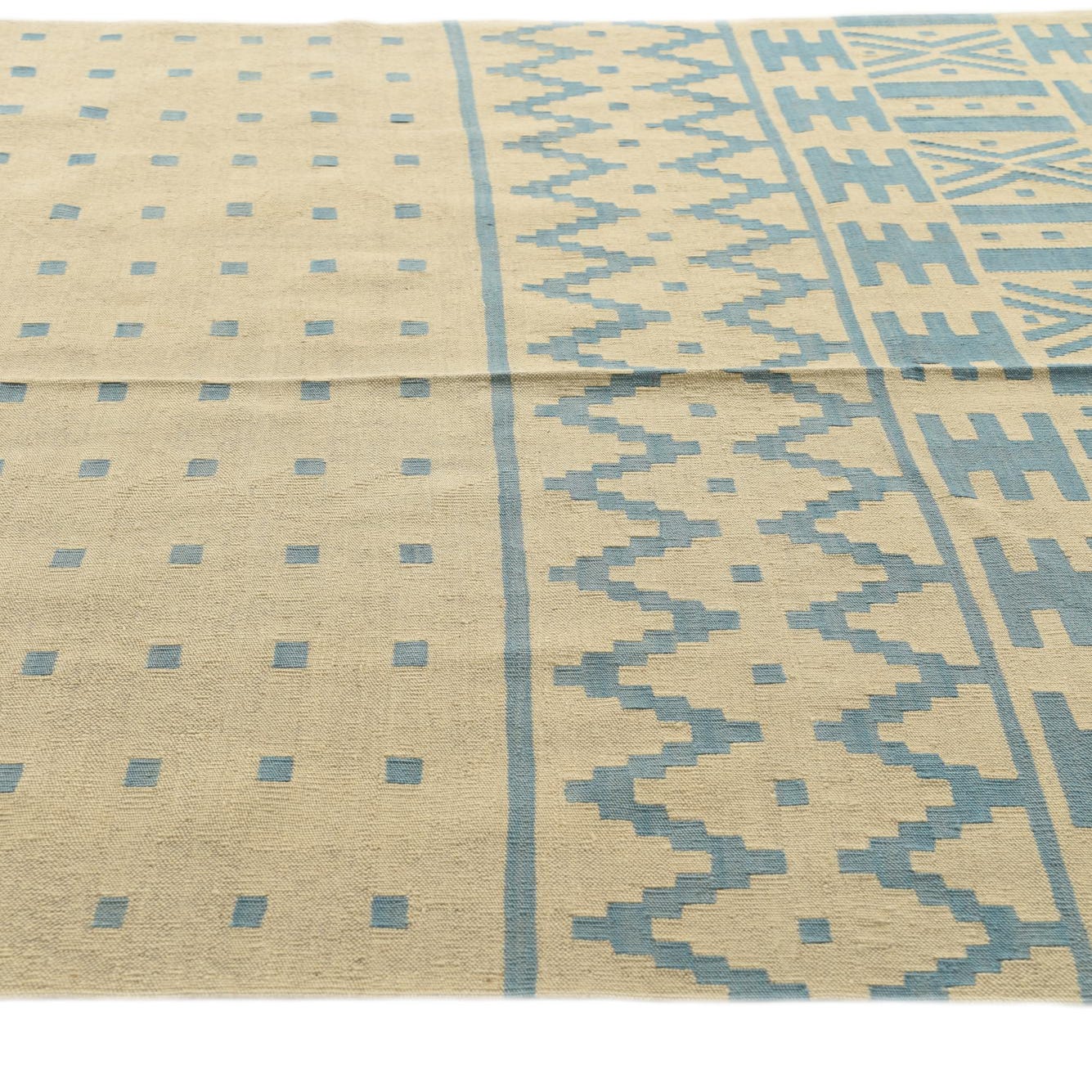 The Kilim Modern collection presents a hand-woven 6x9 rug crafted from 100% wool, offering a durable and naturally resilient textile choice for the home. The design features a balanced mix of cream and light blue hues, which creates an inviting atmosphere. The cream background provides a neutral base, while the light blue accents introduce a subtle pop of color.