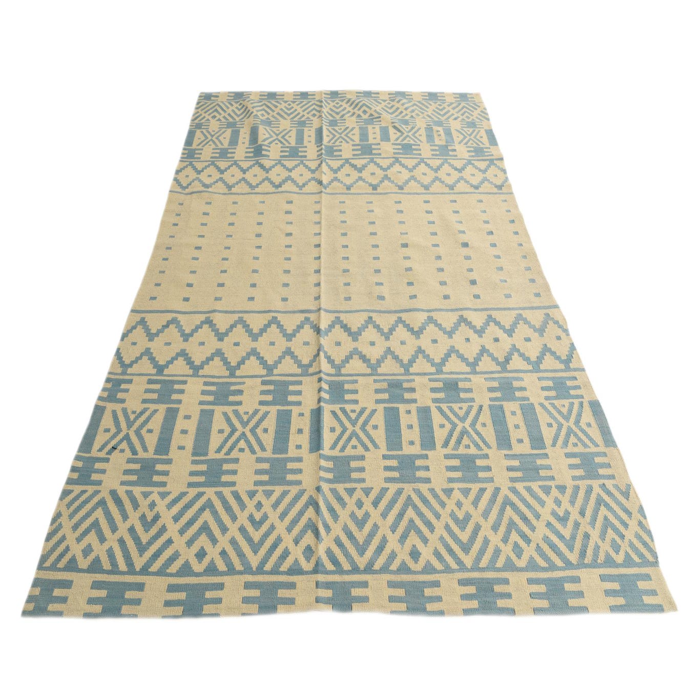 A 6x9 rectangular Kilim Modern rug with a flat weave, featuring a tribal pattern in ivory and light blue.