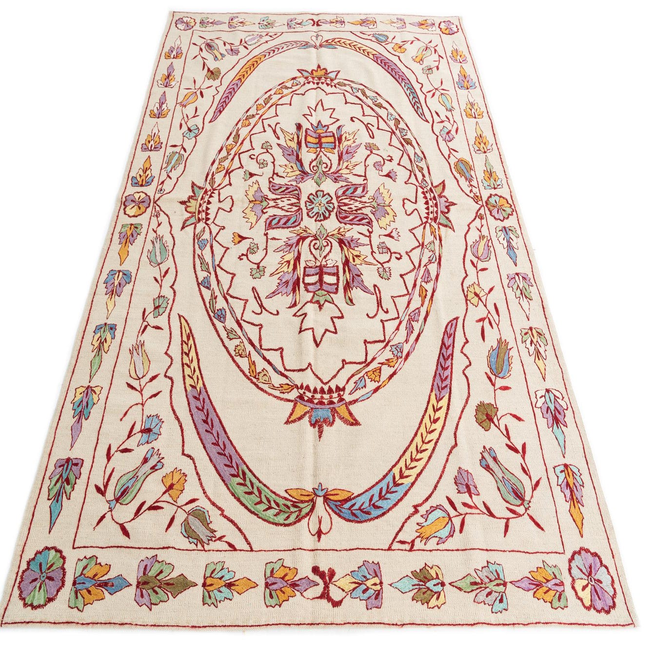 A 6x9 rectangular ivory wool flatweave rug with a colorful tribal medallion and floral border.