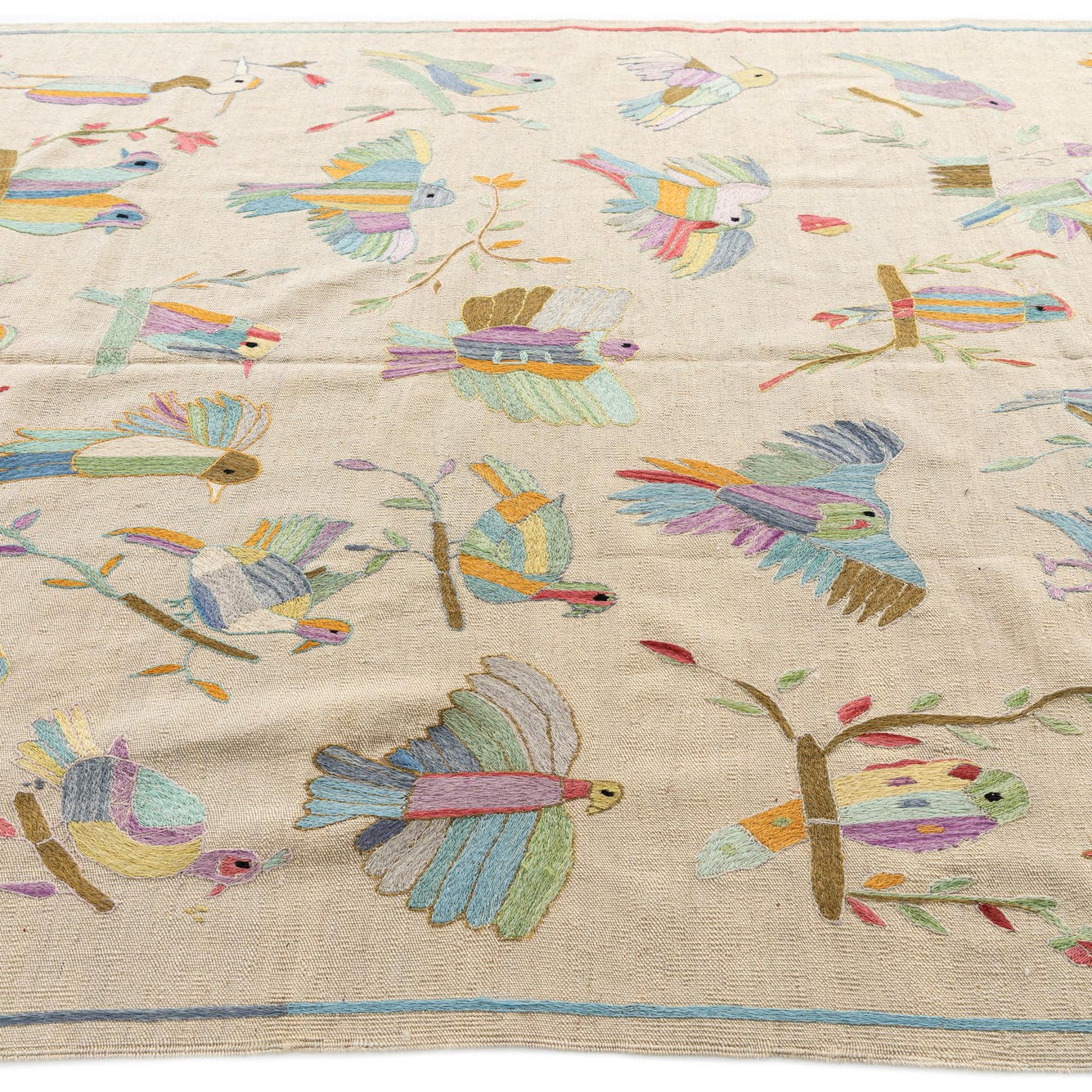 A 6x9 rectangular ivory flatweave rug with a colorful, whimsical pattern of various birds and branches.