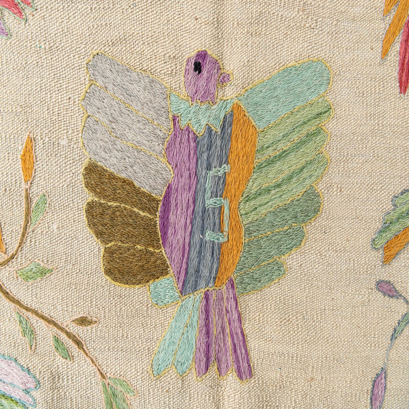 The Kilim Suzani collection presents a hand-woven rug crafted from 100% wool, offering a tactile experience and significant durability. This 6x9 rug displays a whimsical patterning of colorful birds and foliage across a soothing cream background. It incorporates a charming palette of beige, blue, brown, light blue, violet, light green, olive, and gold hues, creating a vibrant yet harmonious aesthetic.