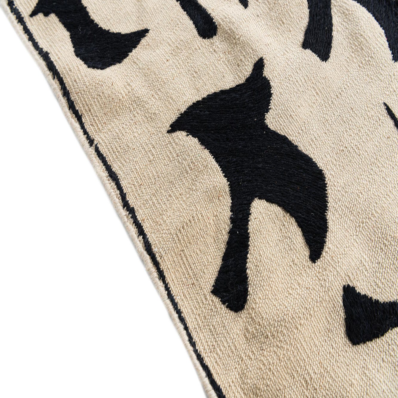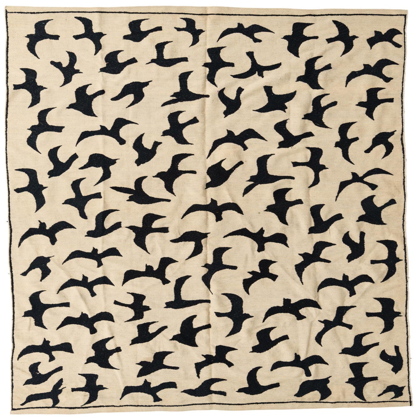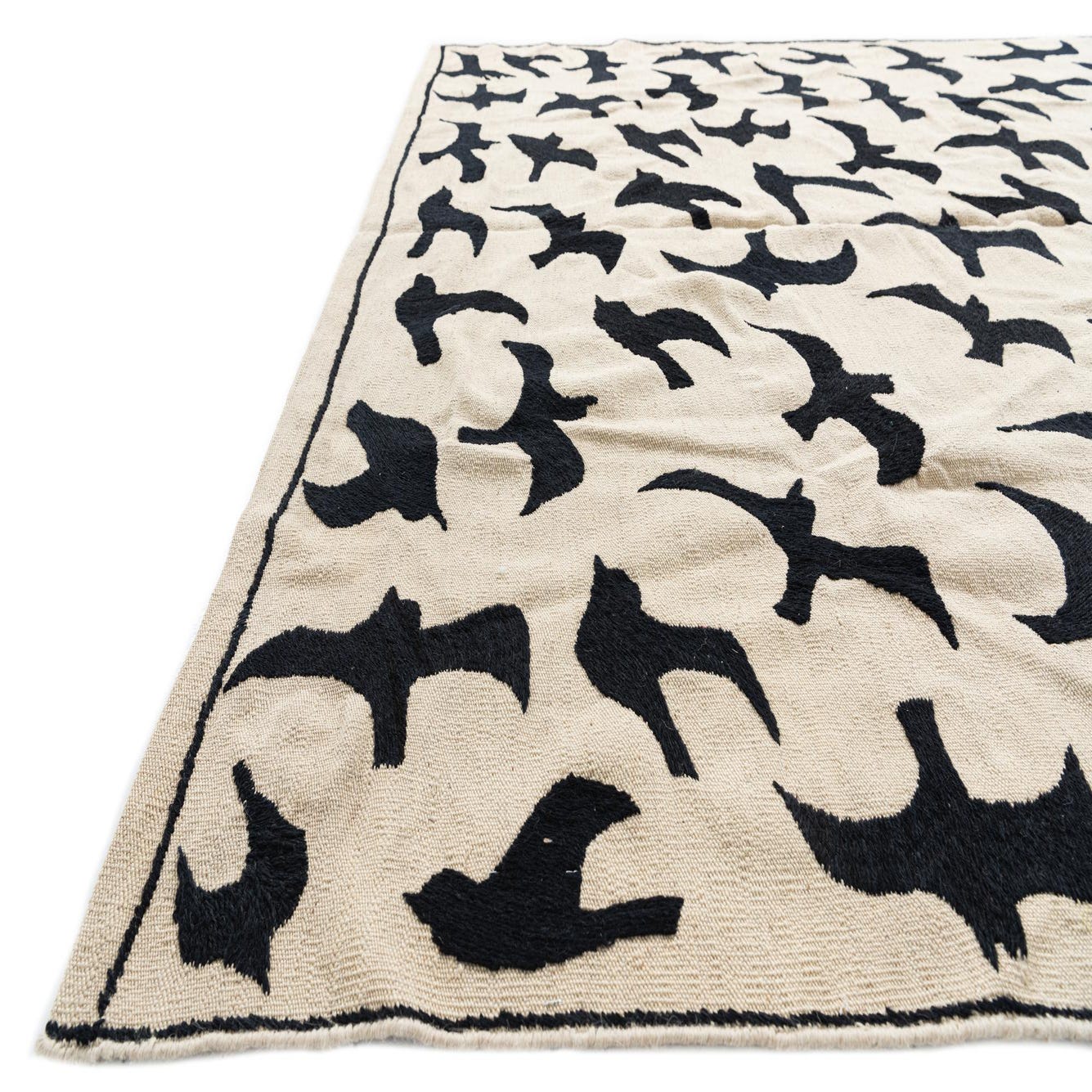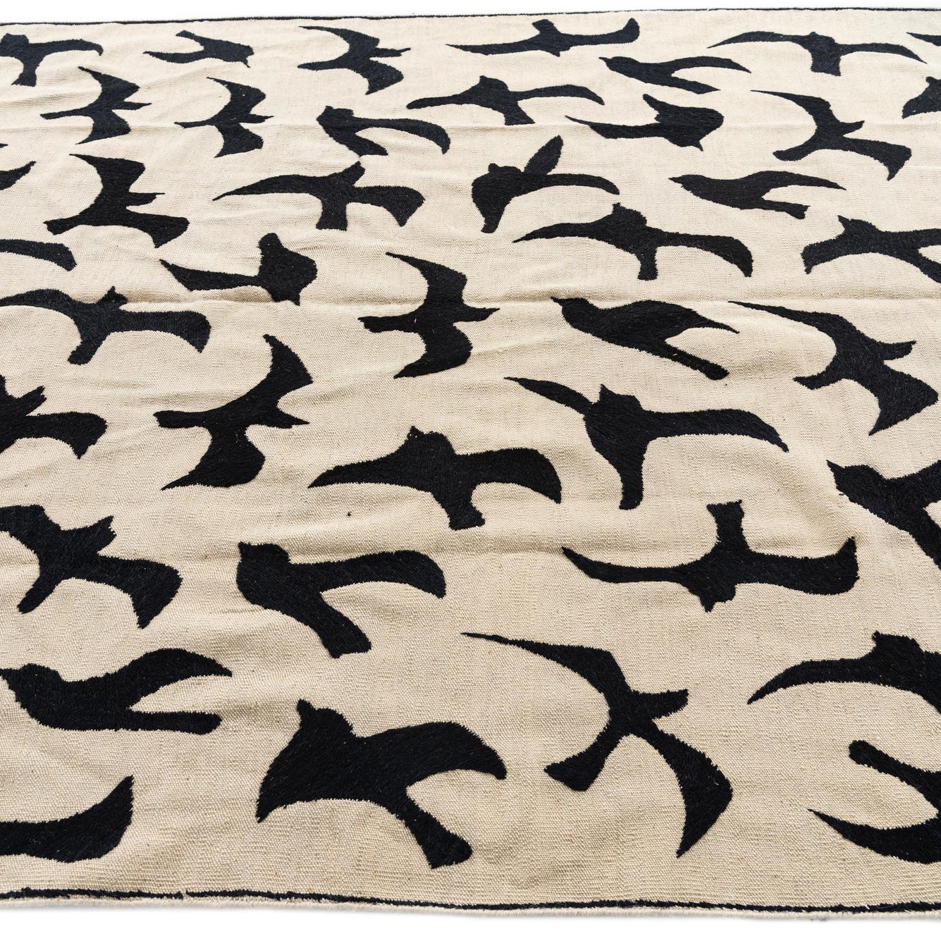 A 6x9 rectangular ivory flatweave rug with a repeating pattern of black bird silhouettes, suitable for a living room.