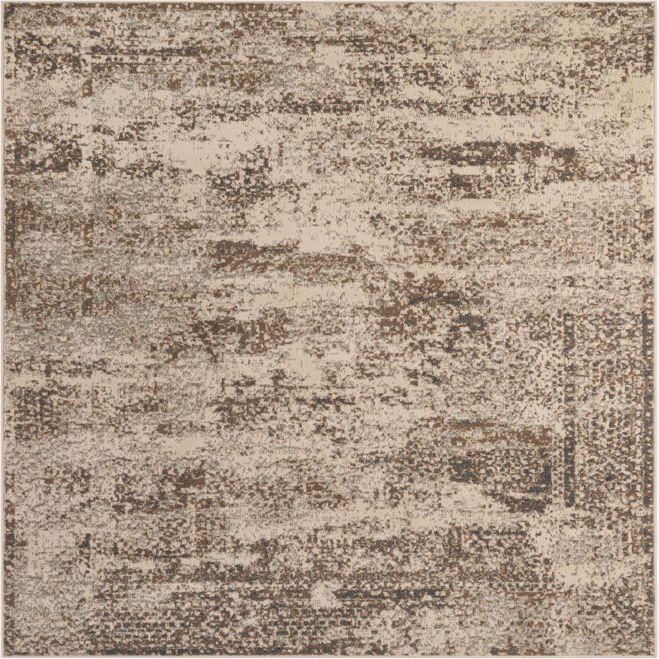 A cream background sets a calm base for an abstract, distressed pattern in layered beige and warm brown. The design mixes soft speckling and brushed washes to create a subtle, lived-in look with a contemporary edge. Machine-made from 100% polypropylene, the rug has a low-profile pile that feels smooth underfoot with a touch of give, and the tonal variation adds depth without dominating a room.