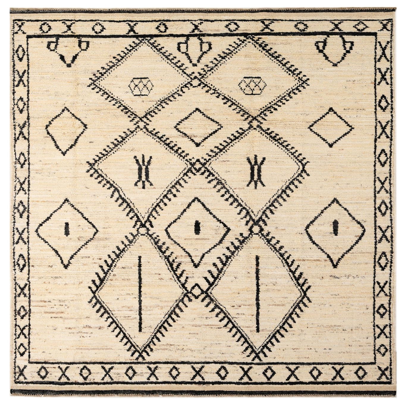 A 6x9 rectangular ivory wool rug with a black tribal geometric pattern and border, suitable for a living room.