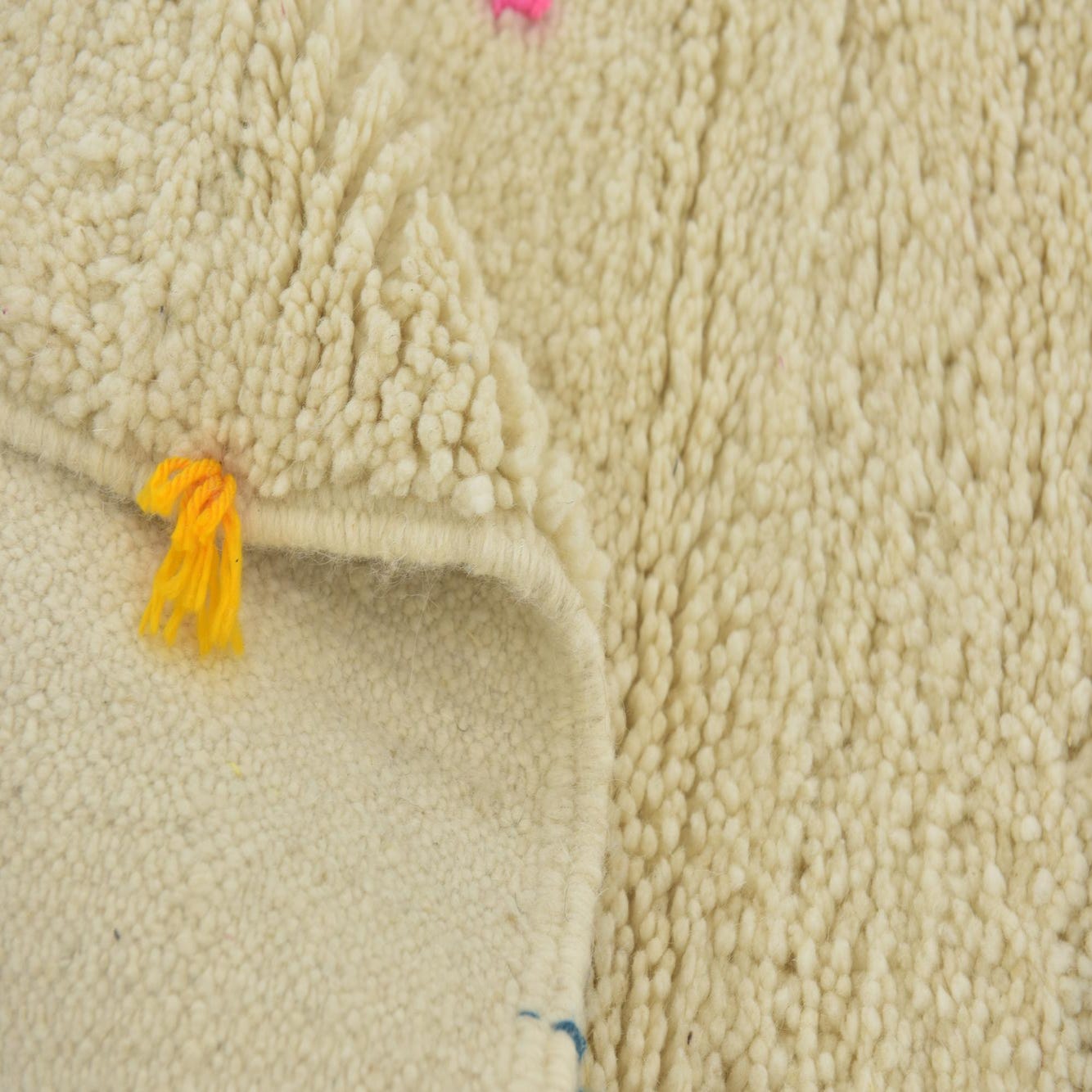 Primary color is Cream. Colors in this rug include: Cream, Black, Blue, Green, Orange, Red, Violet, Pink, Navy Blue.
