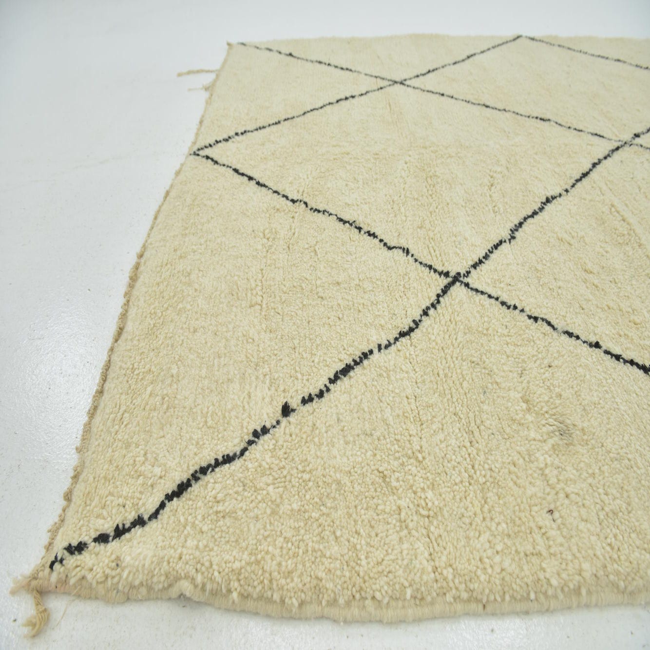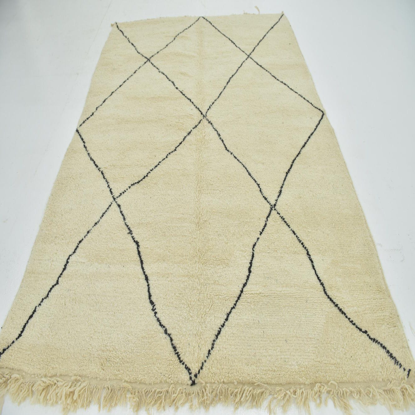This Moroccan Collection rug offers a minimalist design with a cream background and simple black geometric patterning that provides a contemporary but timeless appeal. The hand-knotted construction of 100% wool ensures durability and a plush texture, making it a comfortable and enduring choice for any living space. The piece measures 6x9 and features a symmetrical pattern that is versatile enough to complement a variety of décor styles, from modern to traditional.
