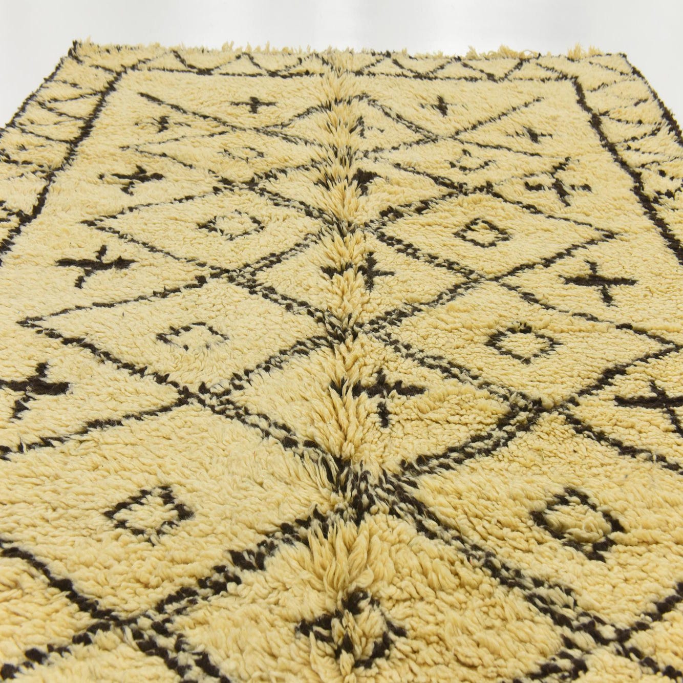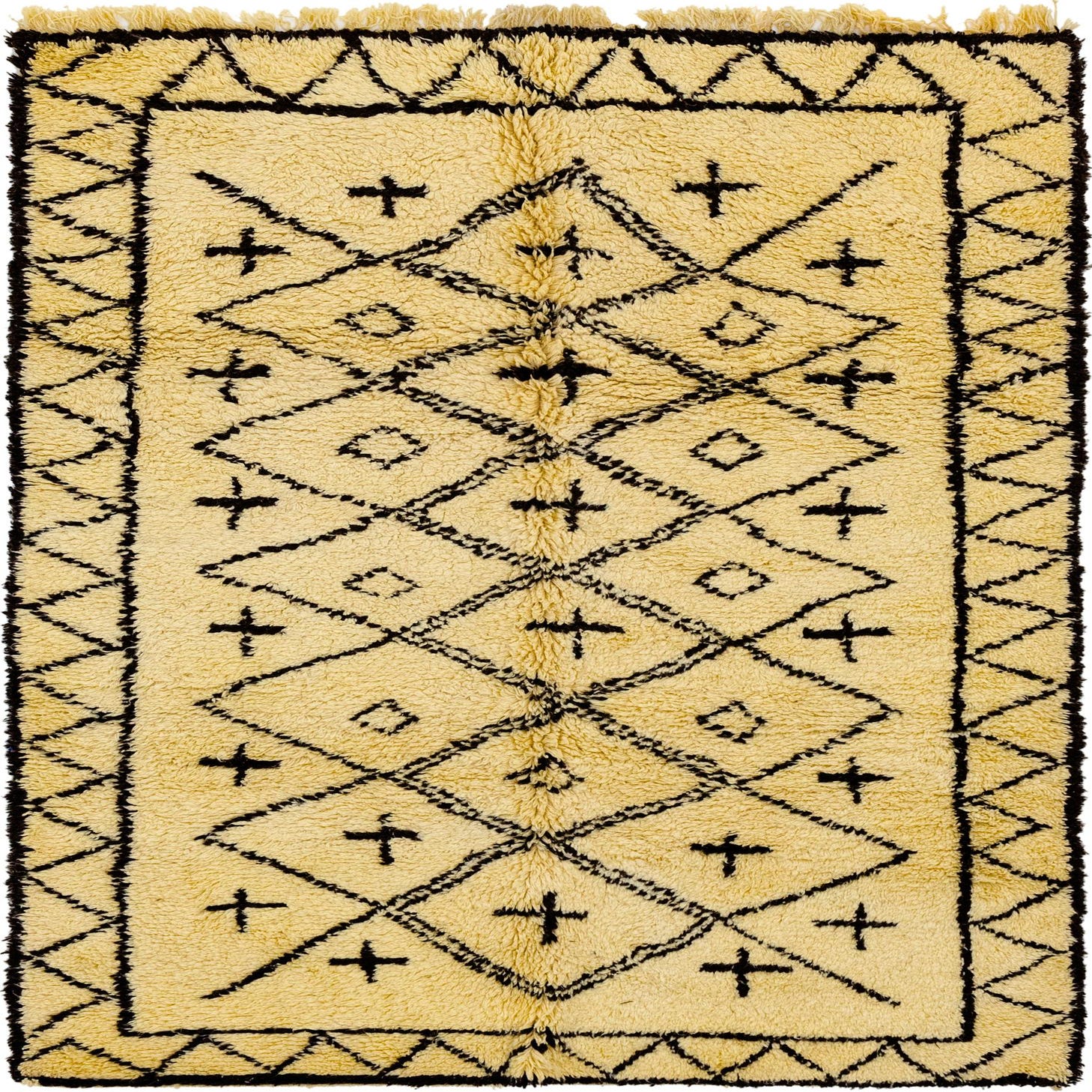 A 6x9 rectangular ivory shag rug with a black tribal diamond and cross pattern, suitable for a living room.