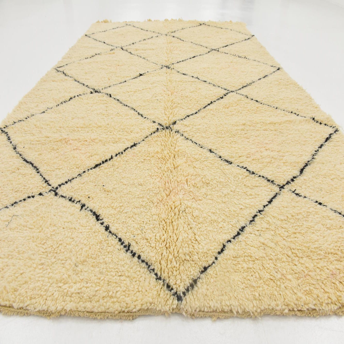 A 6x9 rectangular ivory shag rug with a black tribal diamond pattern and fringed edges, suitable for a living room.